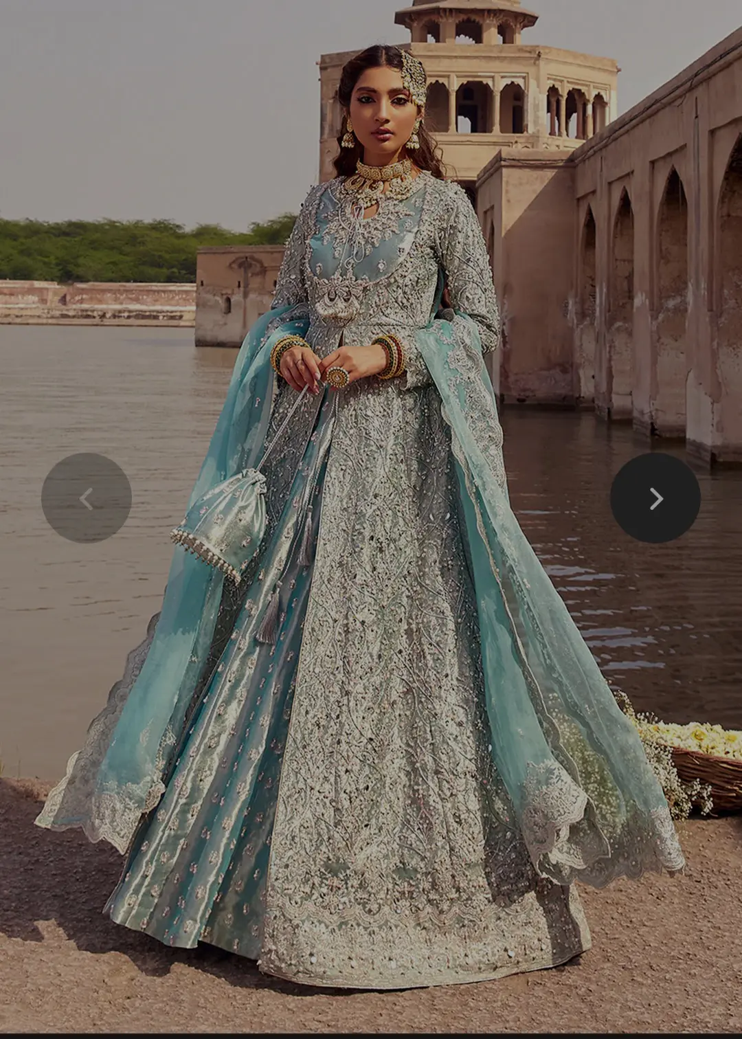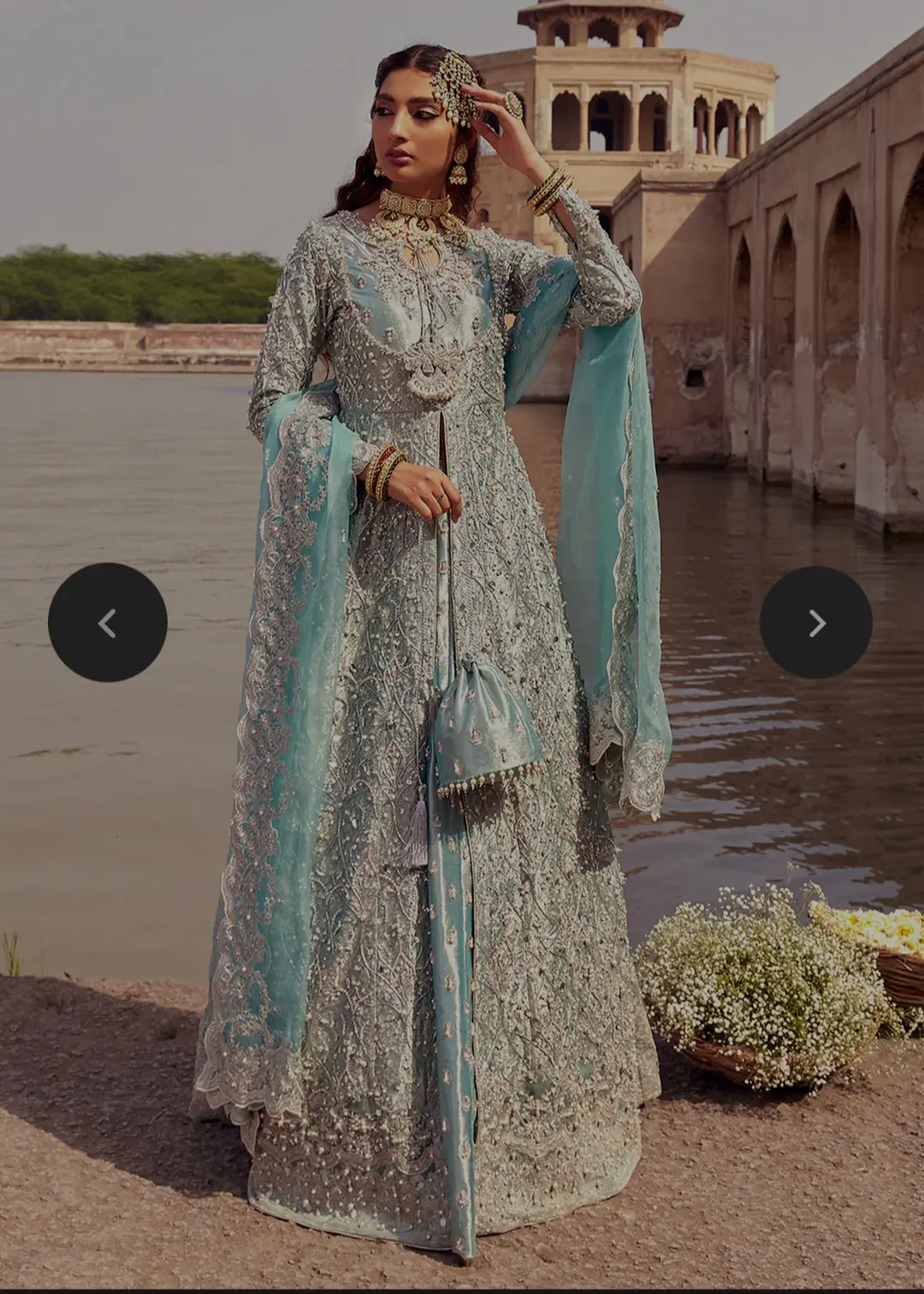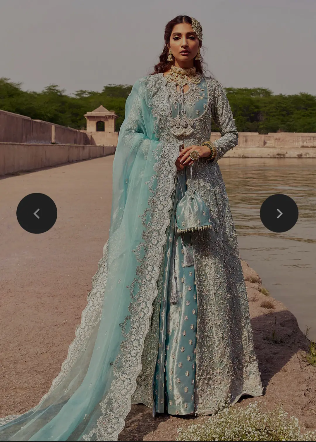 This Azure toned 4 piece stitched outfit is like a piece of the sky, including a shirt, slip, lehnga and dupatta. The fabric chosen for the shirt is pure tissue with front, back and sleeves with diamond like hand embellishments combined with tassels. The lehnga is made in pure tissue with hand embellishments of botis all over. Organza fabric is used for dupatta with sliver tilla embroided on all four sides and sequin of pearls spray all over it.