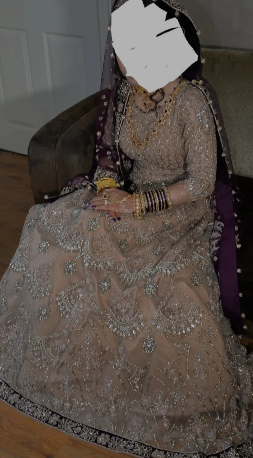 Nude pink champagne colour Bridal 1 piece gown with a contrasting Plum Dupatta with intricate and emaculate embroidery to wow your audience.