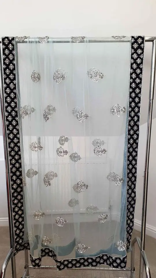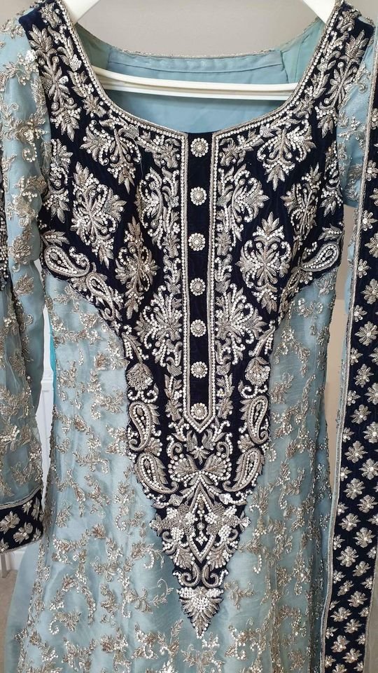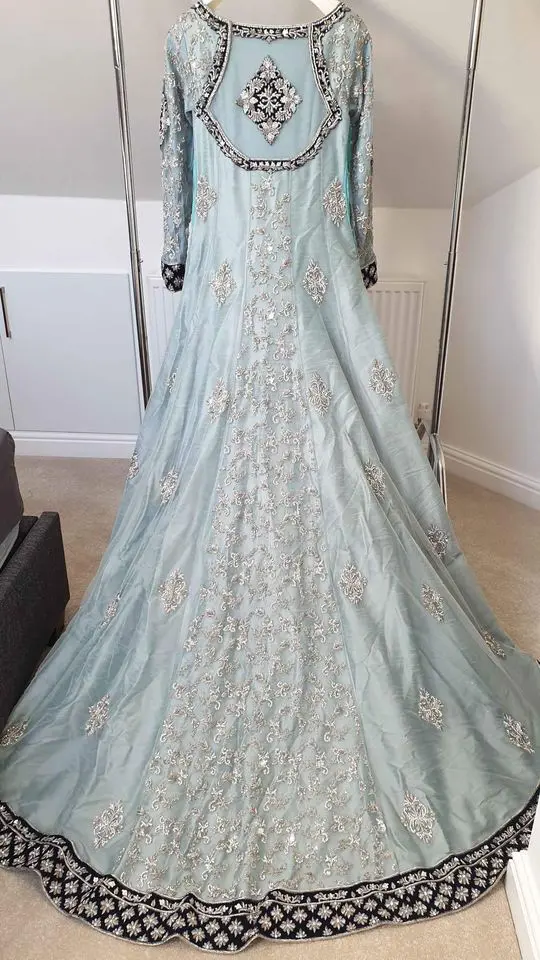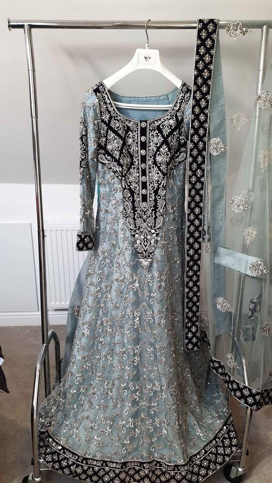 Light blue embellished & embroided bridal gown with matching dupatta/scarf.