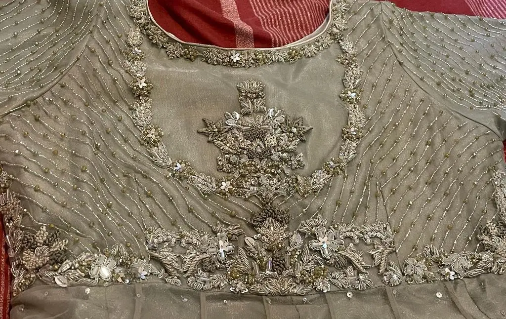 Modern Wedding / party Maxi Gown , beautiful and authentic. UK Size Medium 12.. Only worn for few hours. It's a 2 -piece custom Net fabric dress and it's in colour of Light Grape & duppka work is in silver / light Grape colours. It's a long length Maxi dress. The front is full of heavy duppka work on Net fabric. The back trail or back side has duppka work too as well .. The arms of the dress has full length with heavy duppka work.. The dupatta work matches the dress colour. I. It comes packed in clear bags & secure packaging avoiding any cosmetic signs. Any questions please send a message , WhatsApps & haslie free to call us..