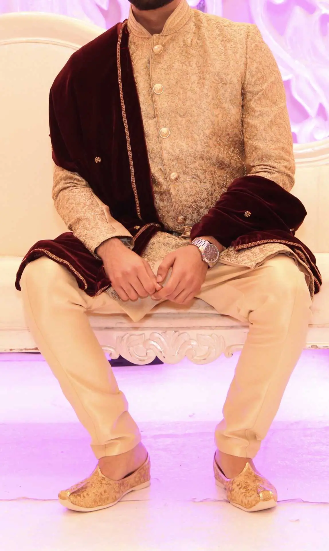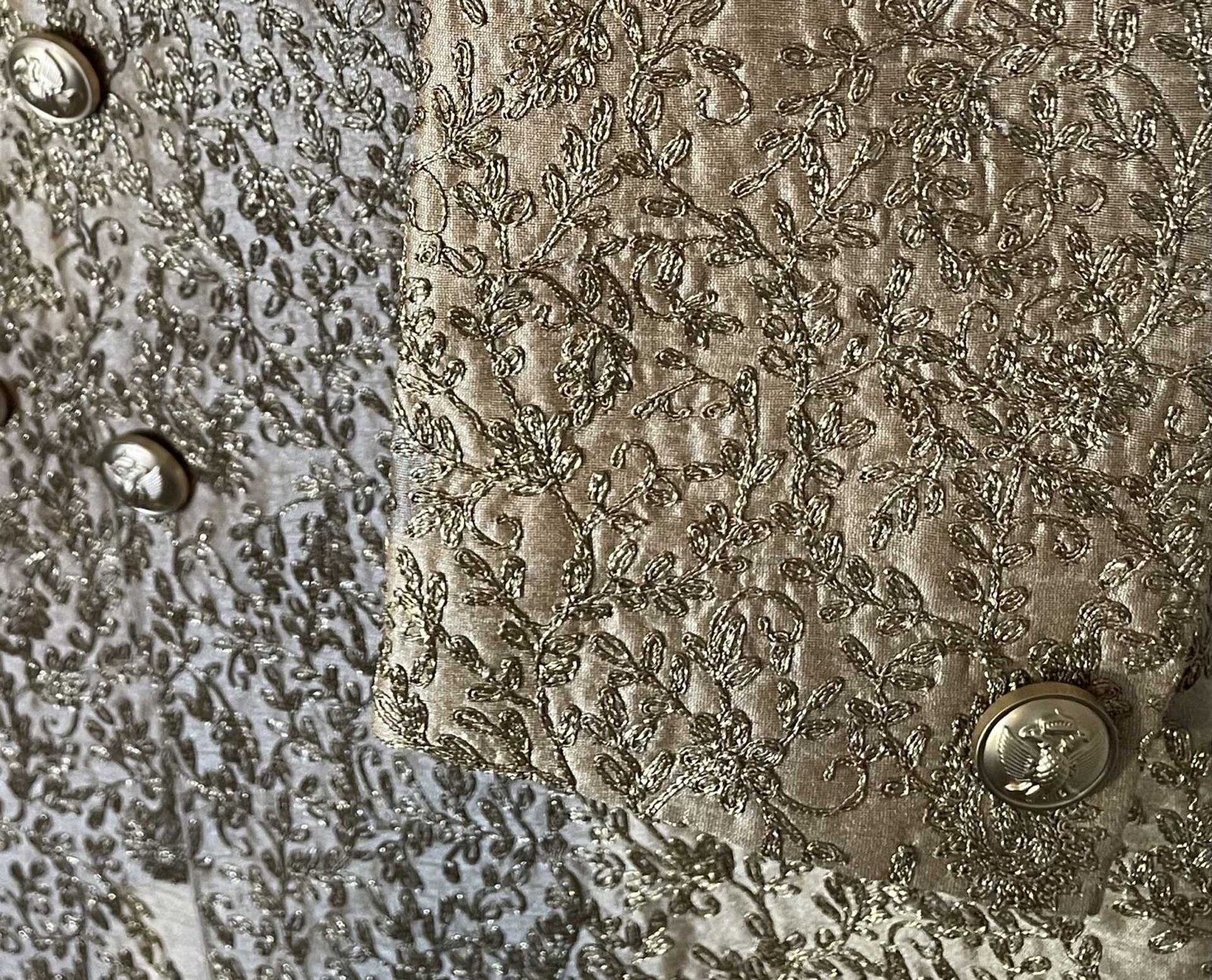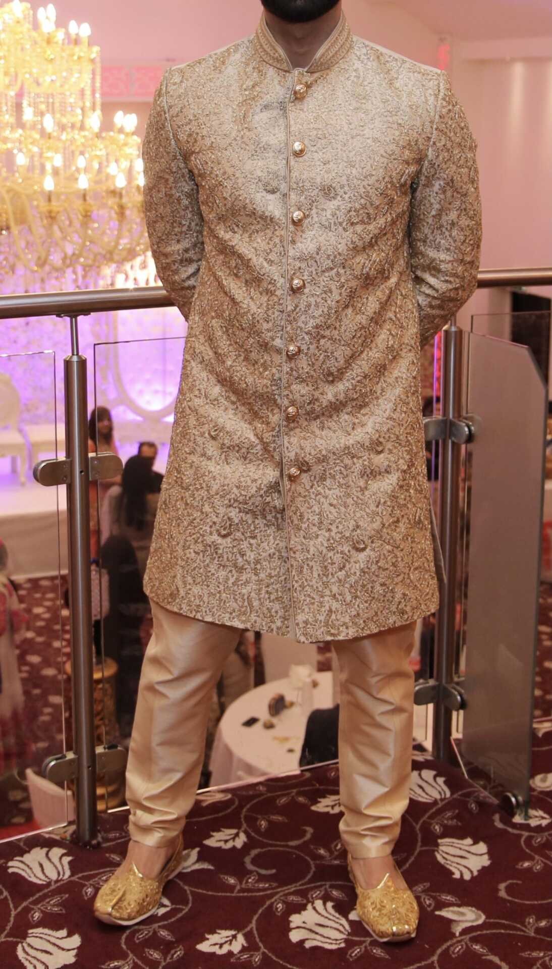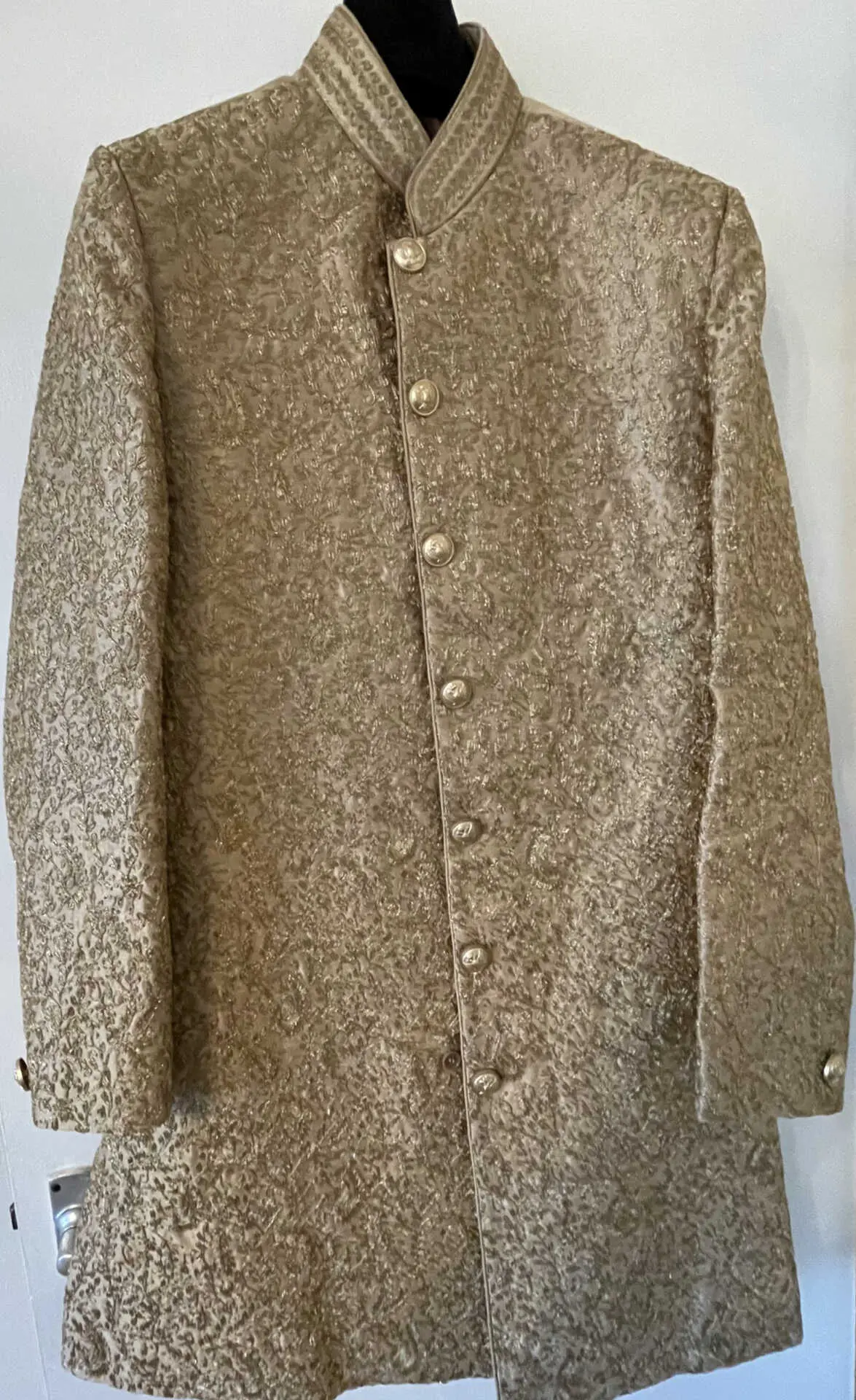 Luxury gold sherwani with slim fit gold trousers. Immaculate condition - only worn for a couple of hours. Beautiful detailing on front and back. Comes with cover packaging - originally bought for £900, selling for £400.