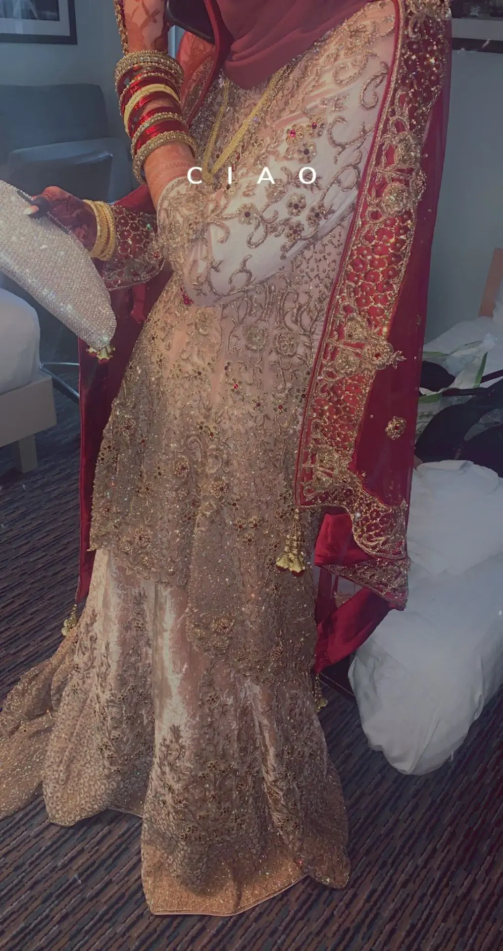 Wedding lengha in maroon, gold and peach, stitched in 2021. Bride is 5ft7 and wears size 8-10.