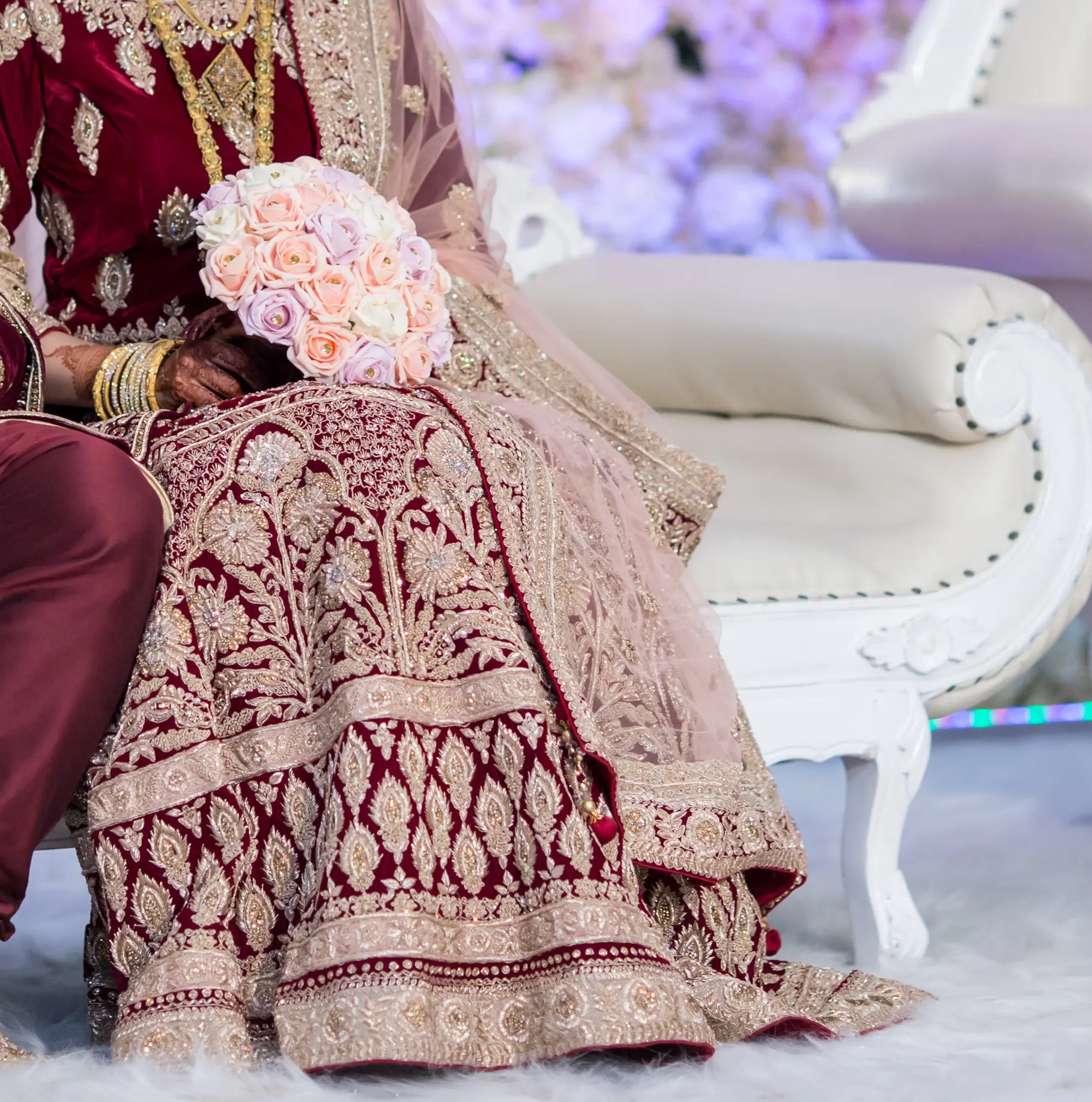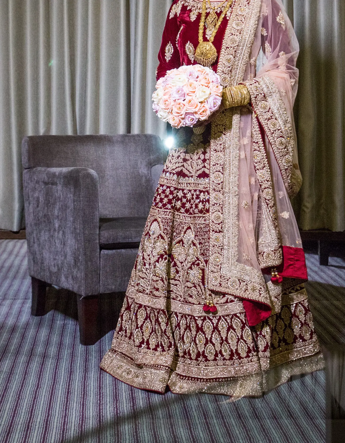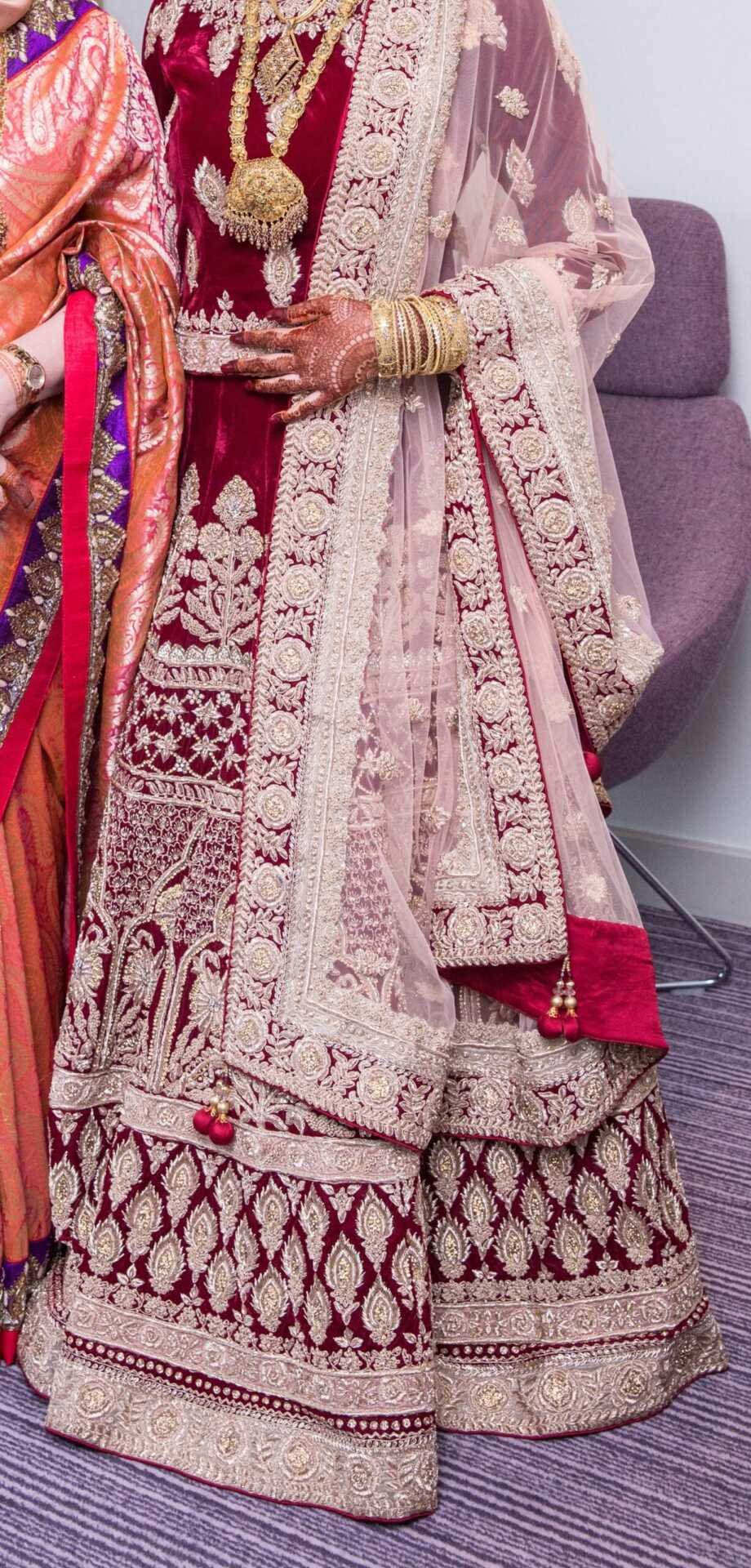 Mongas Bridal lengha, blouse and dupatta Velvet Maroon & Peach In original Mongas packaging Will fit UK sizes 6/8/10 (material inside) Worn for a few hours Immaculate condition Original price £2600 West London based Open to reasonable offers |