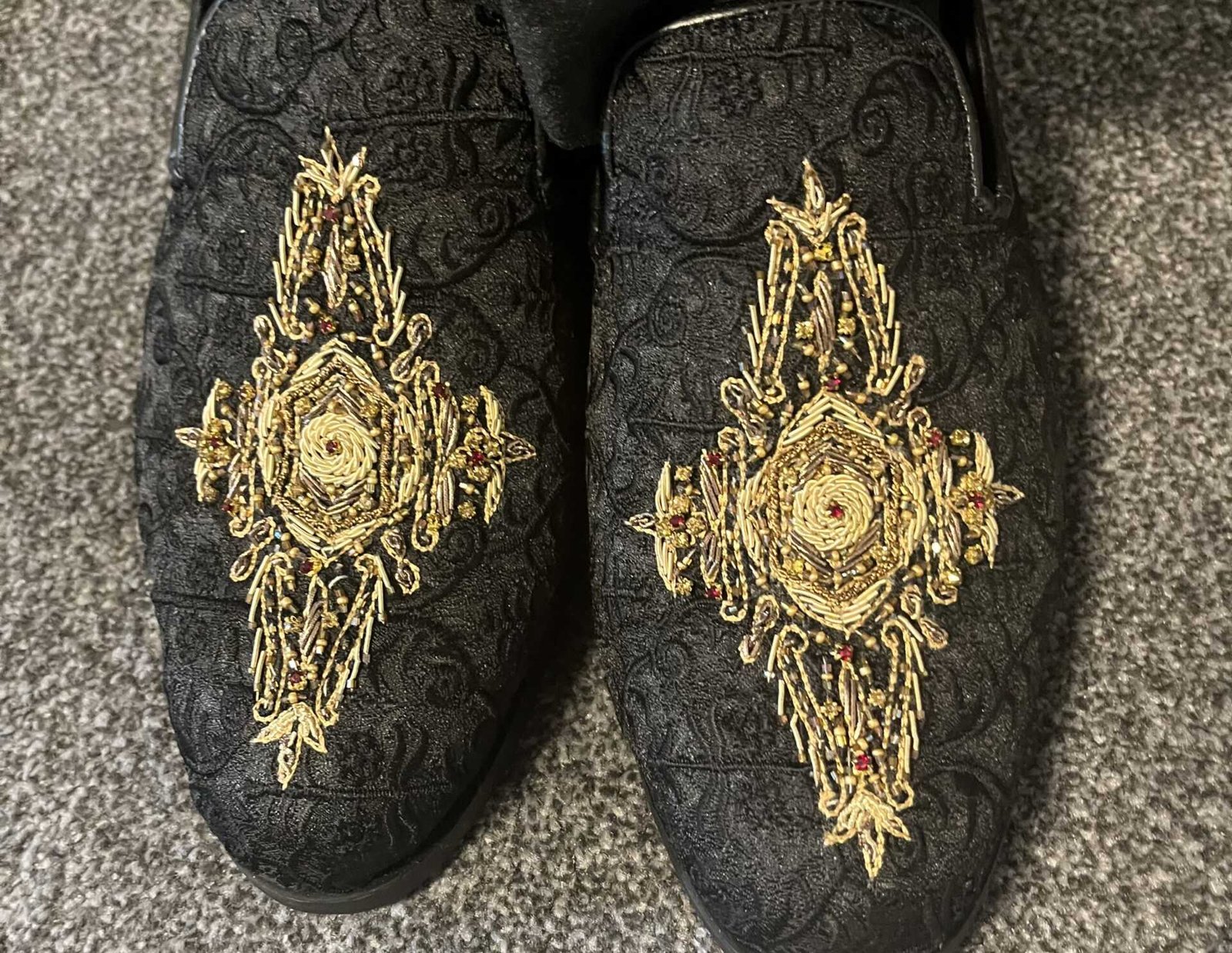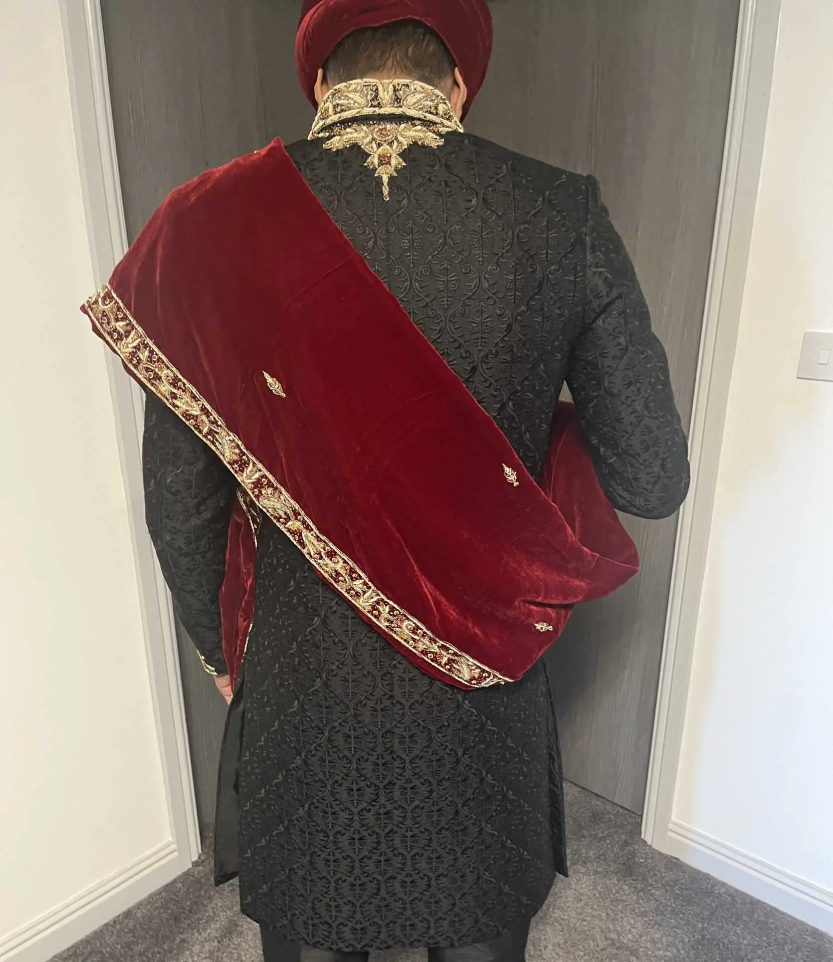 sherwani comes with matching loafer shoes size 9 (never worn), velvet shawl and turban.
