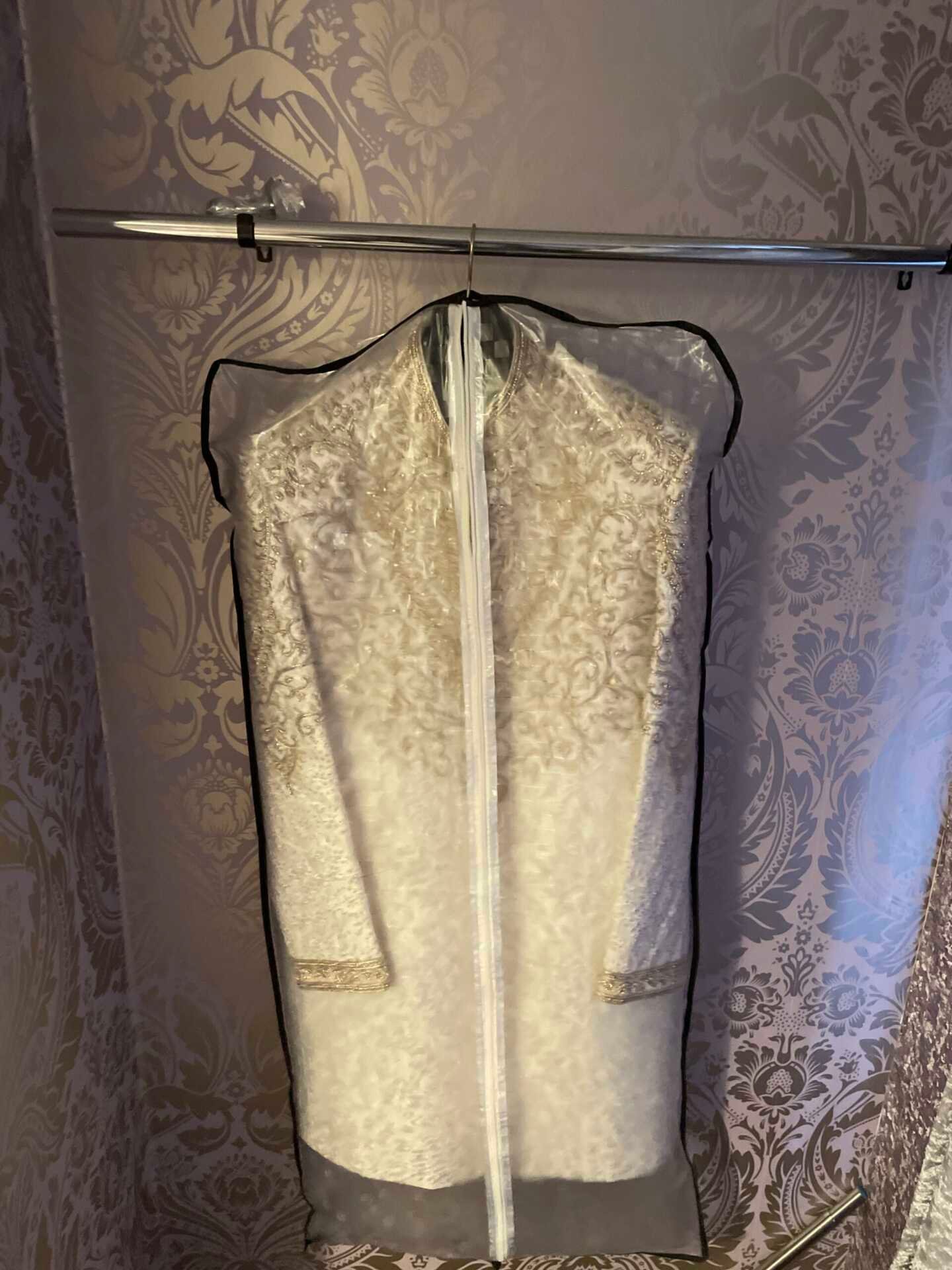 Get your hands on this stunning practically brand new as has only been worn once in its life, size 40 ivory white and gold mens sharwani. The look it gives the groom is absolutely magnificent. It looks like you have just come off the set of Jodhaa Akbar