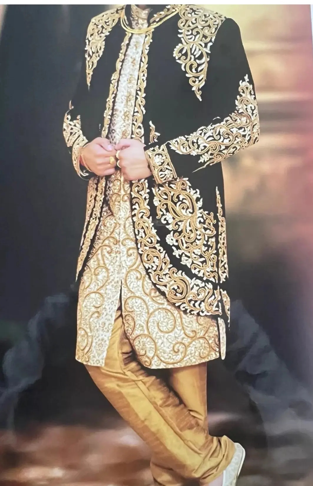 Asian men's wedding sherwani in burgundy and gold. The outfits has intricate embroidery, luxurious fabrics, and ornate details. The combination of burgundy and gold exudes elegance and is a popular choice for special occasions like weddings.