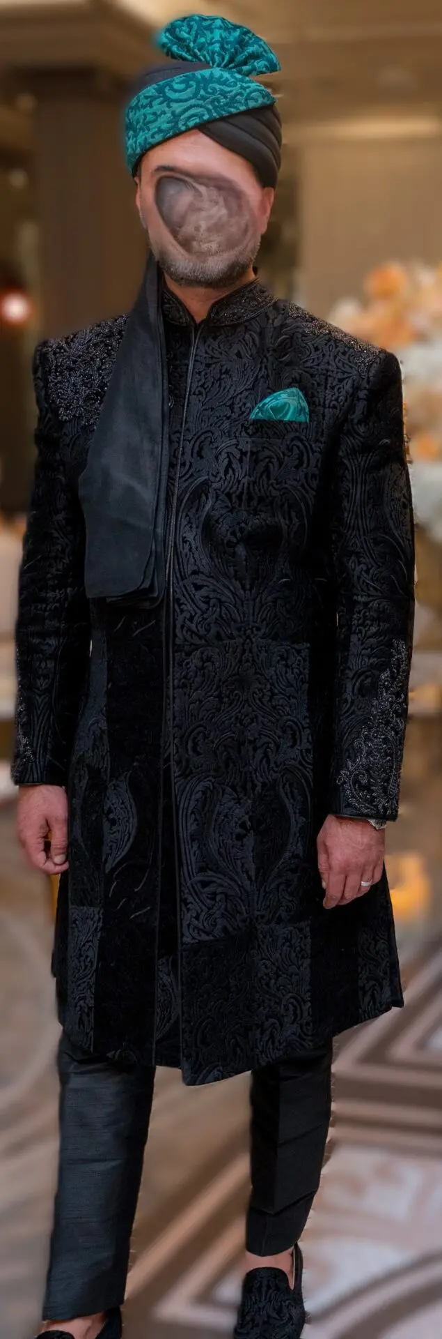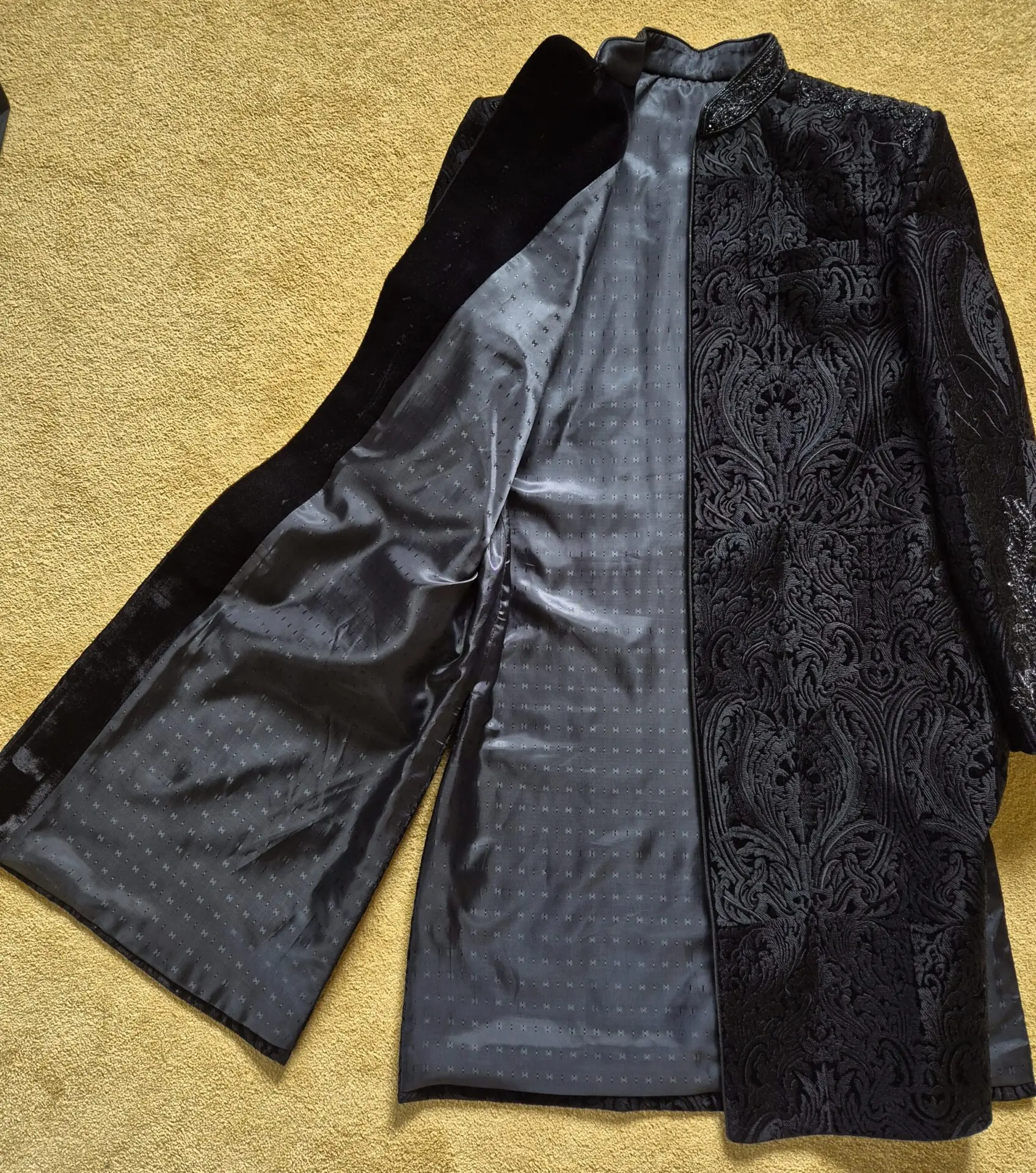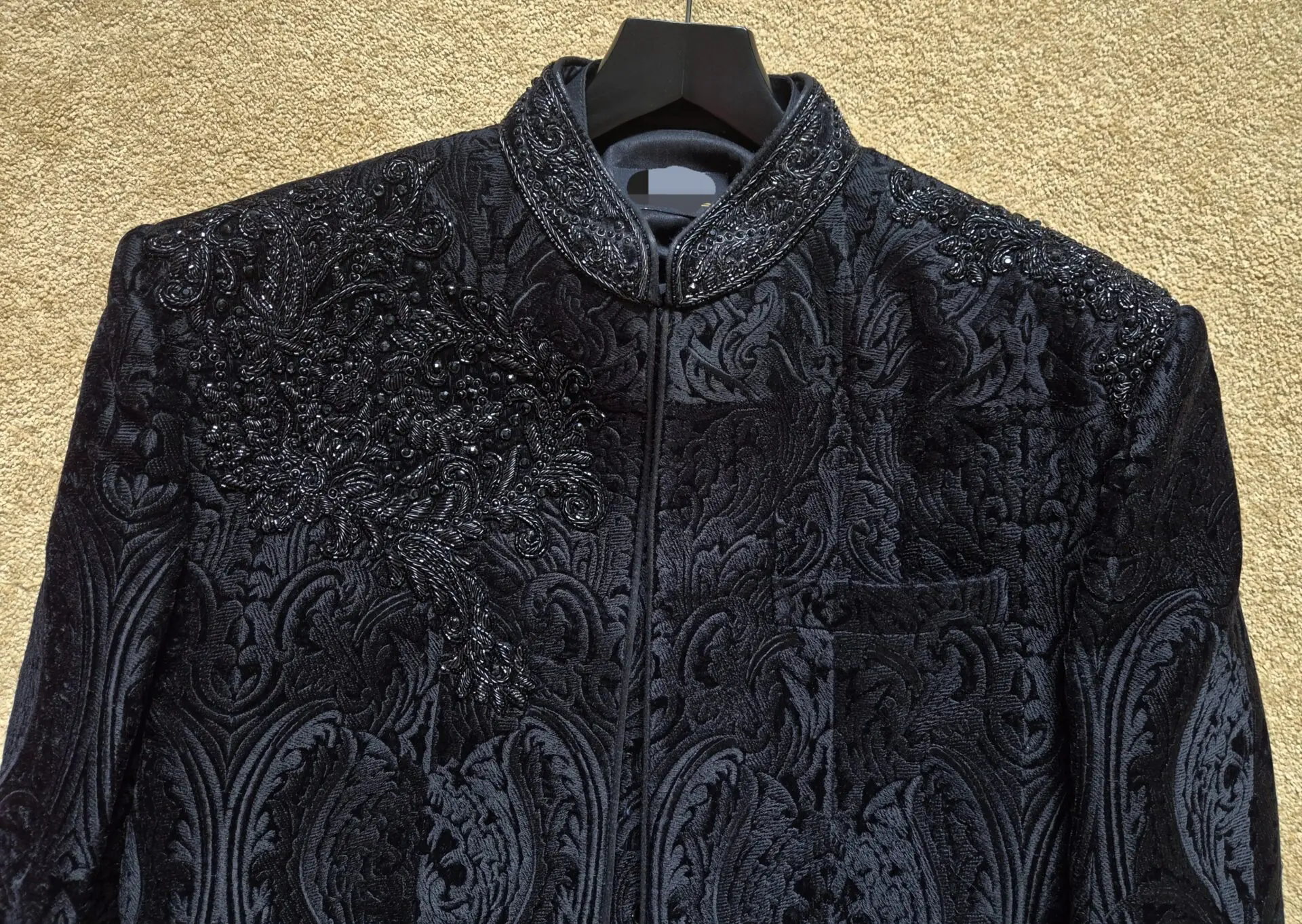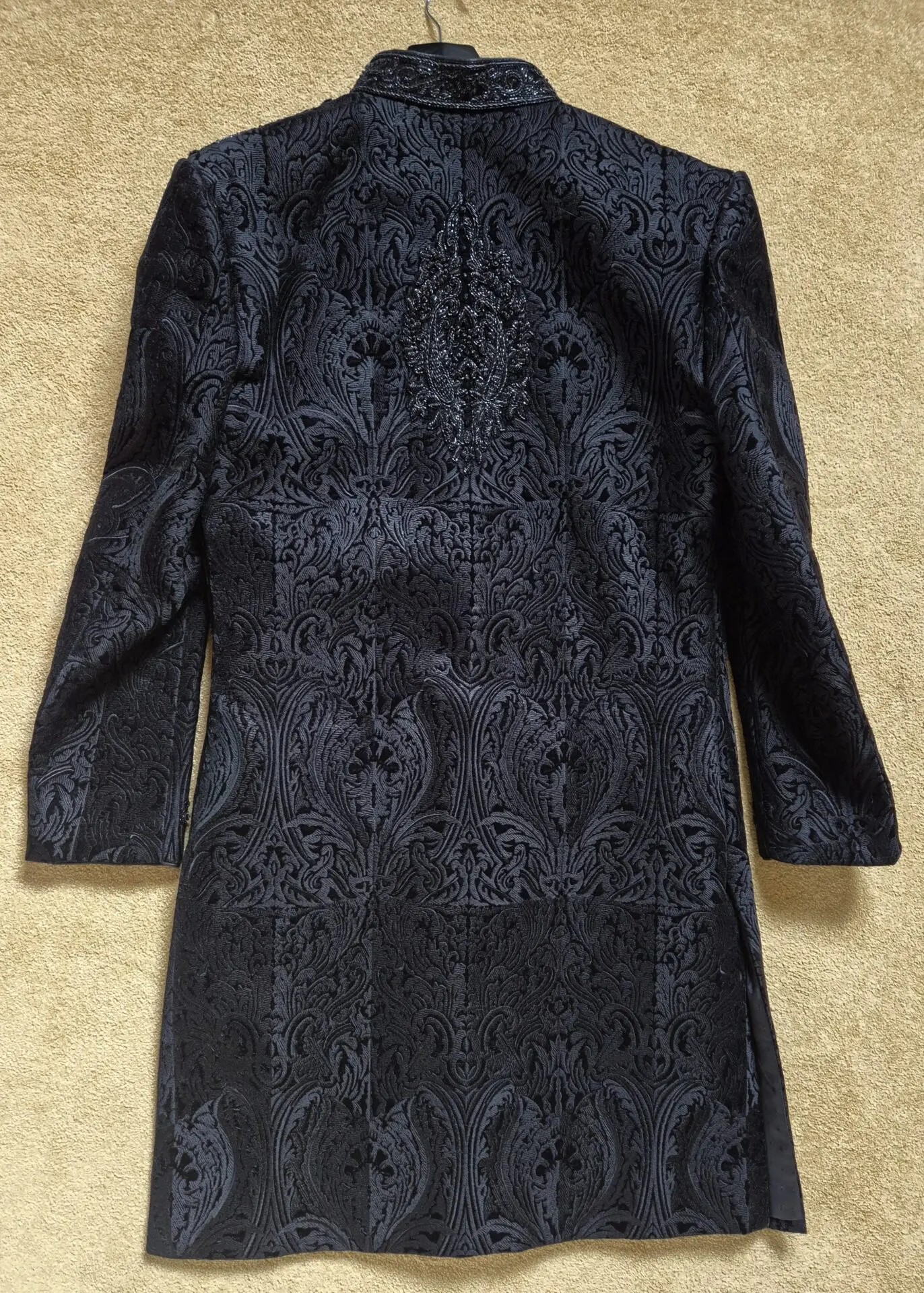 Men's black Sherwani with hat and pocket scarf for sale. Groom wore for only 5 hours once. Embroidery on sleeves, shoulder and back. Patterned velvet self colour on Sherwani. Men's size 40 chest.