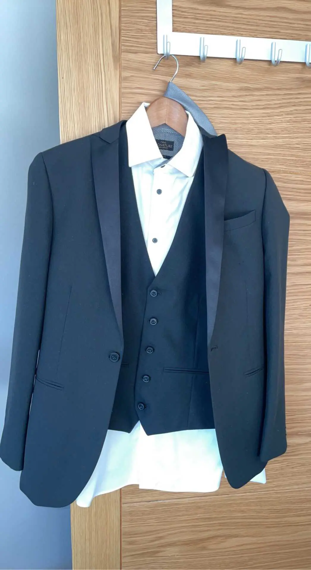 Mens wedding suit and shoes available including waistcoat,tie, blazer, shirt and pants. The shirt size is 15" slim fit white.