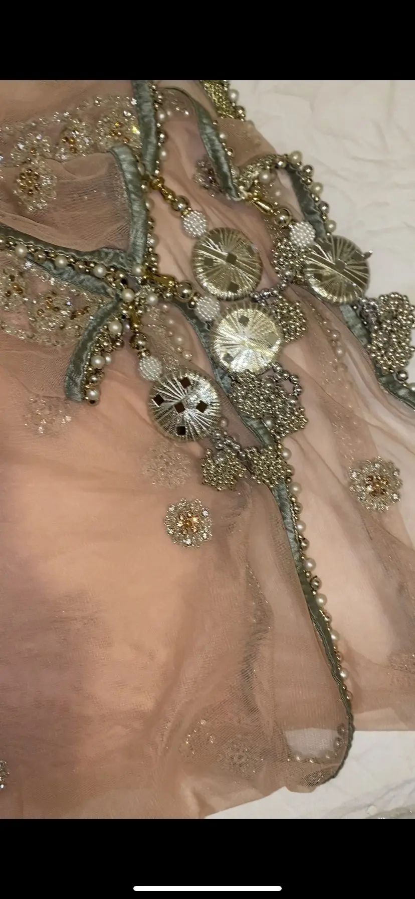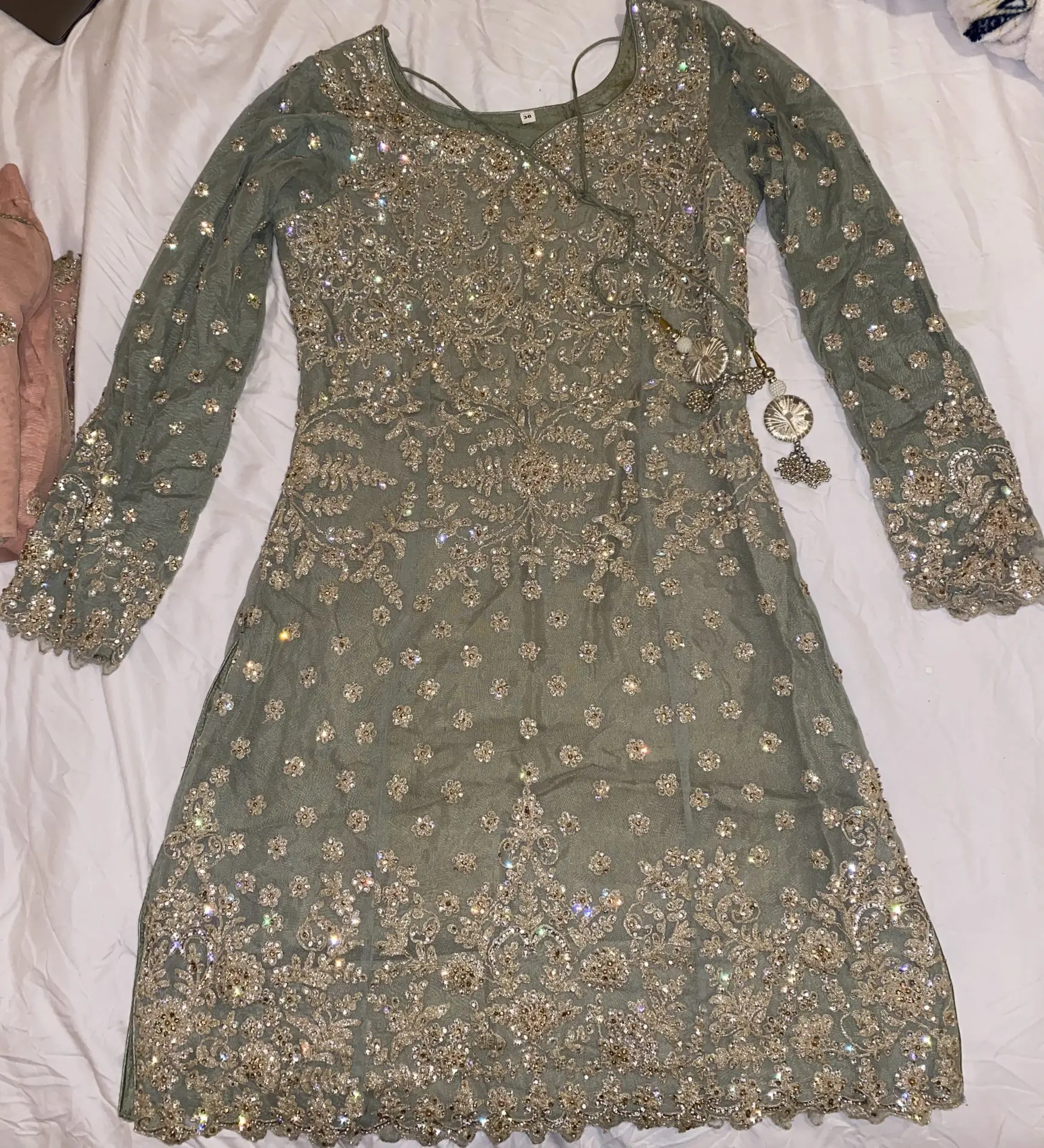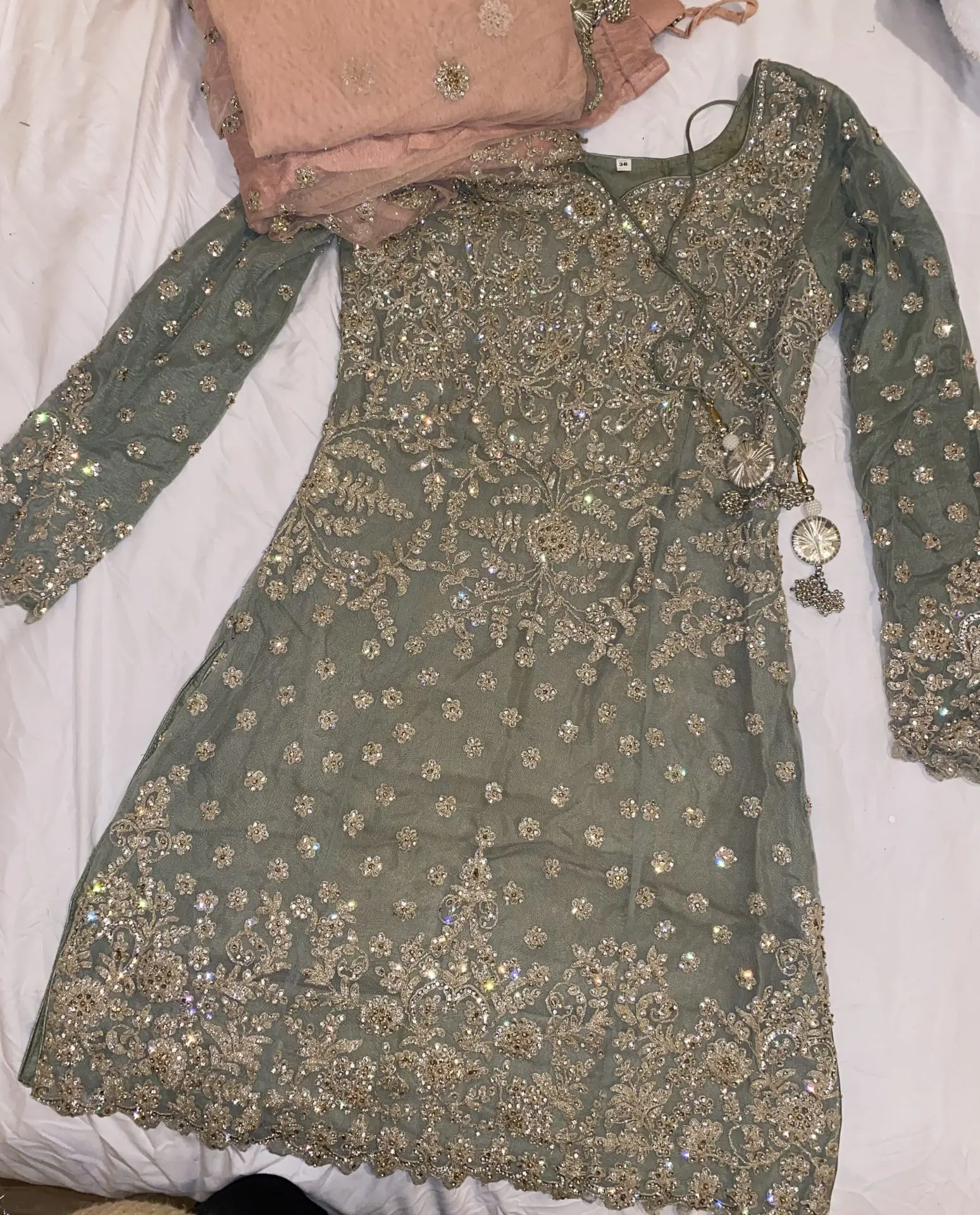 Beautiful mint green kameez and pink sharara pants and duputta. Scarf has beautiful embellishments as shown in the pictures above. Heavily embellished suit with beautiful kaam.