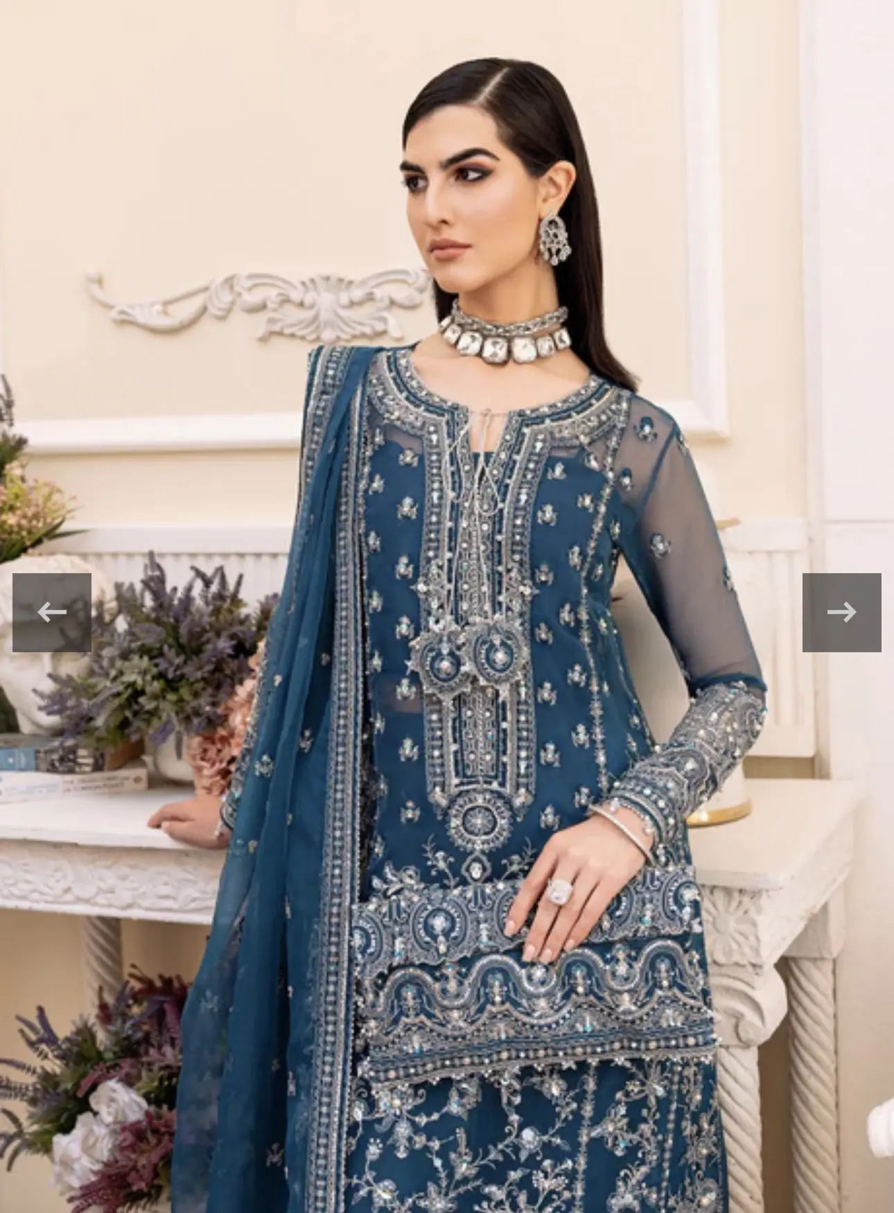 A classy and elegant teal outfit which has sparkling silver embroidery and beading all over. The shirt comes with heavy bordered with sequins and embellishment details, with tassels on the edge. Worn with a constructed dupatta and flared pants, this is a unique show stopper suit that will catch everyone’s eye.