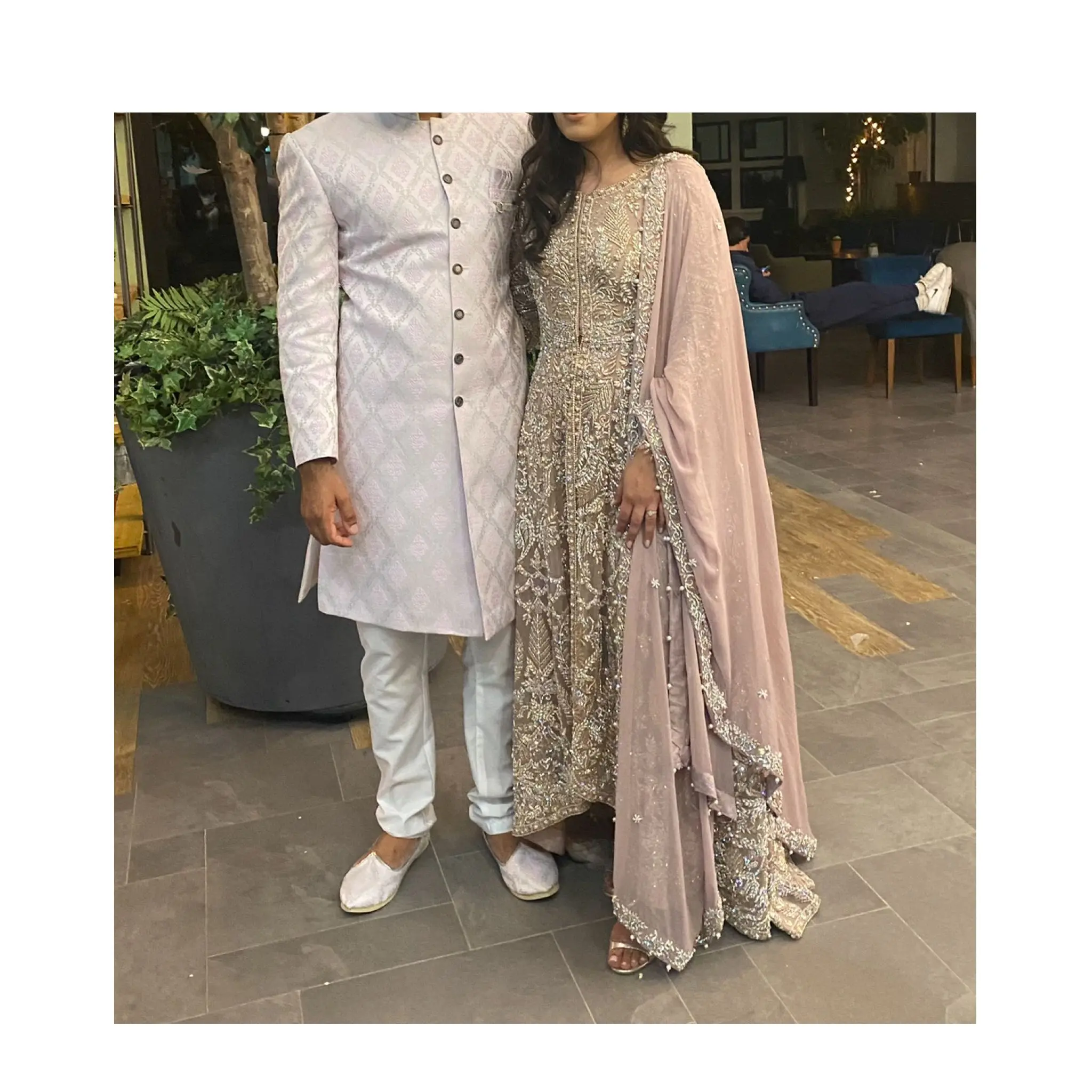 Worn twice. Once for my wedding with a skirt and once for a wedding with trousers both skirt and trousers are provided. Very heavy embroidery. Chiffon dupatta with embroidery all the way around.