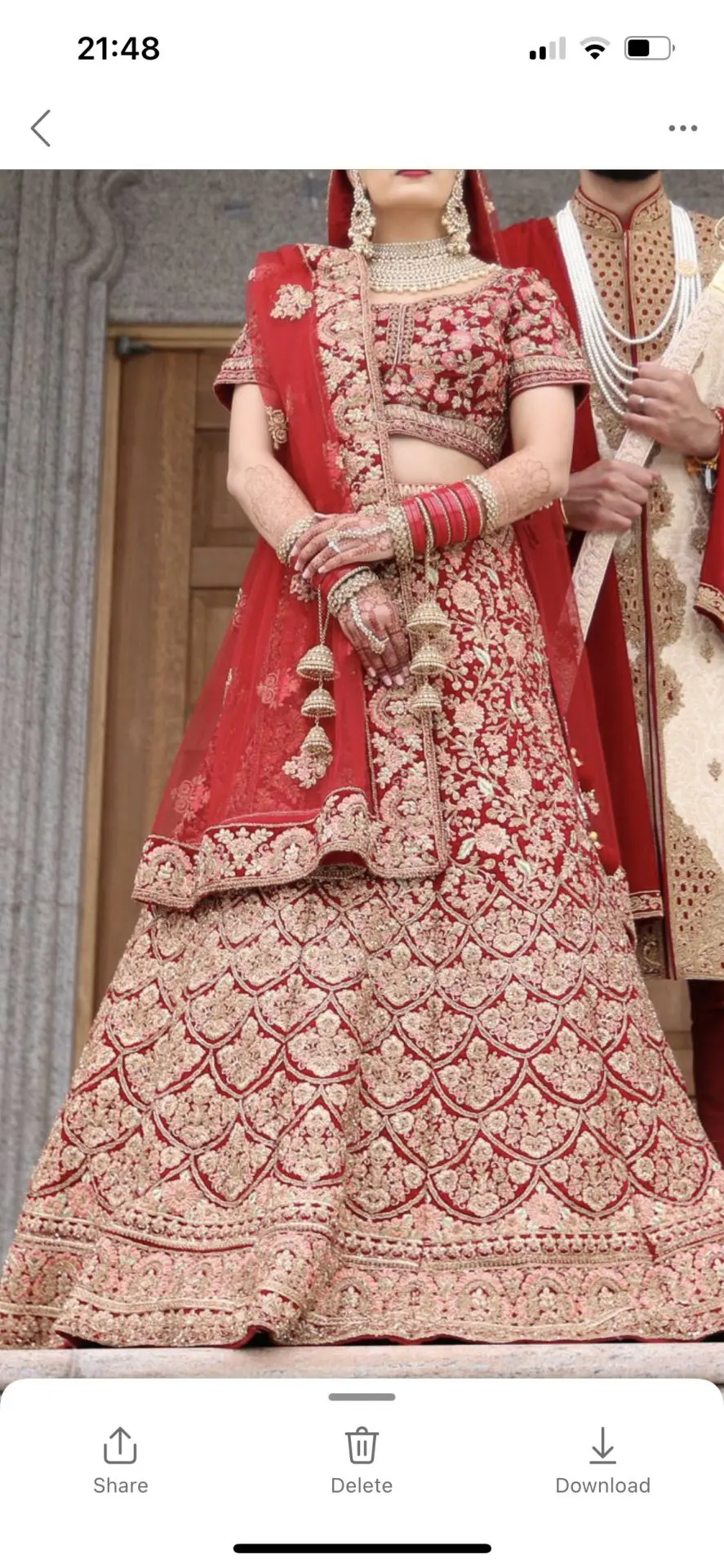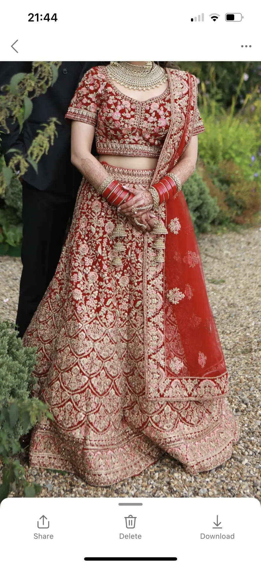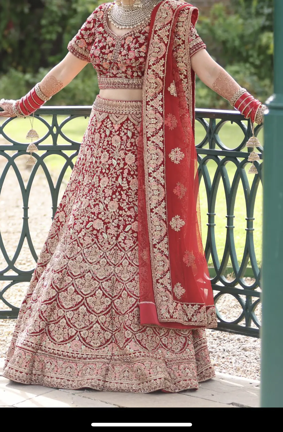 Mongas red bridal lengha worn once. Fitted to size 6/8 with material in the seams to take it out if needed.