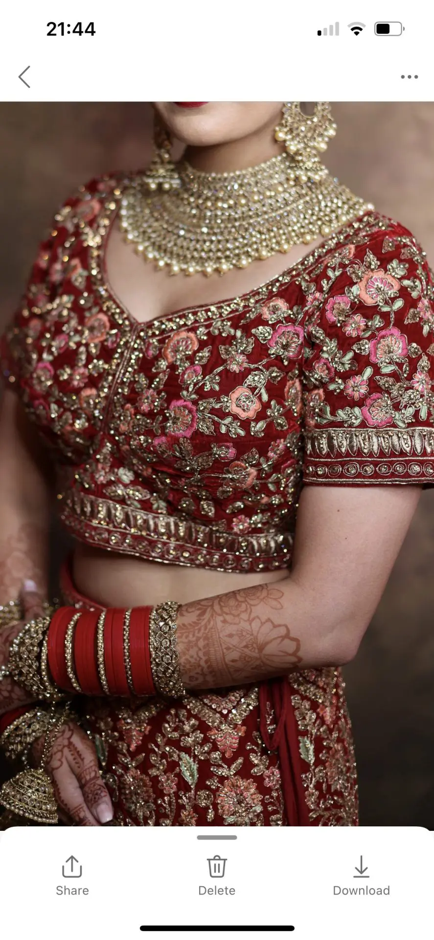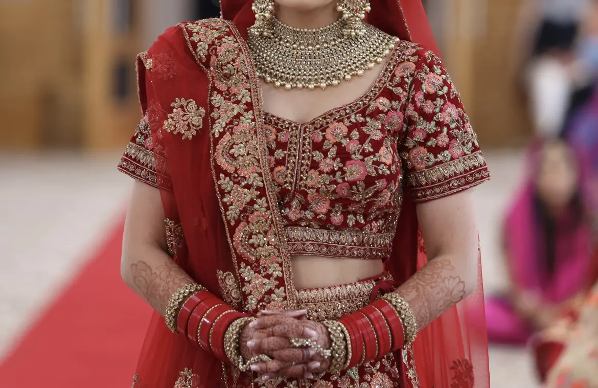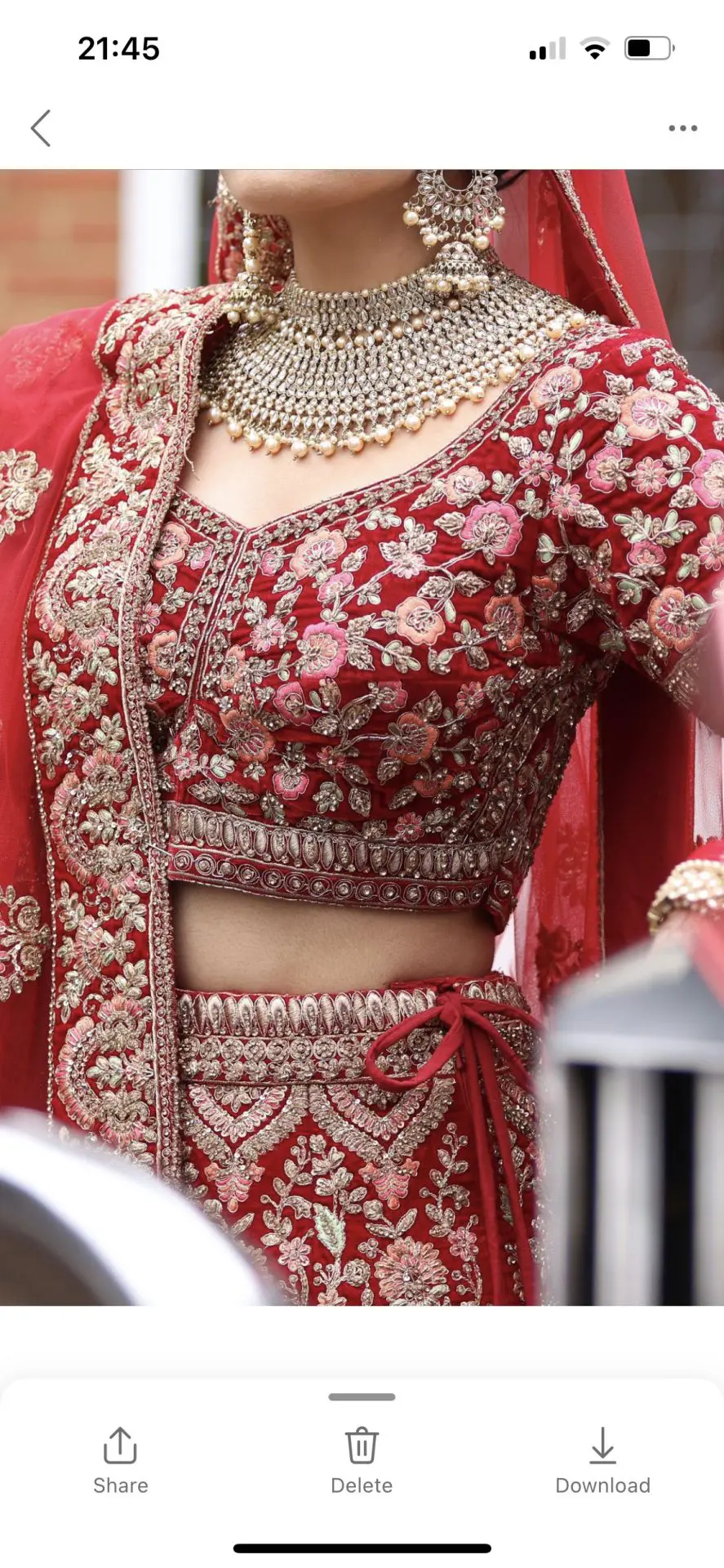 Mongas red bridal lengha worn once. Fitted to size 6/8 with material in the seams to take it out if needed.