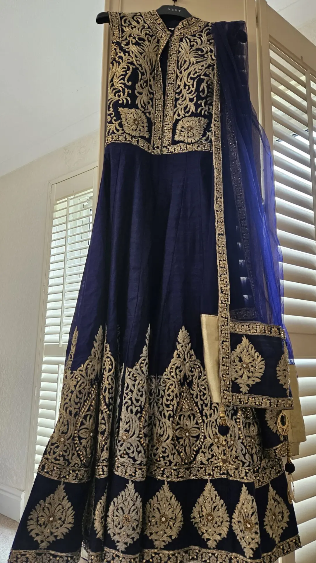 Navy blue dress, long with matching dupatta.