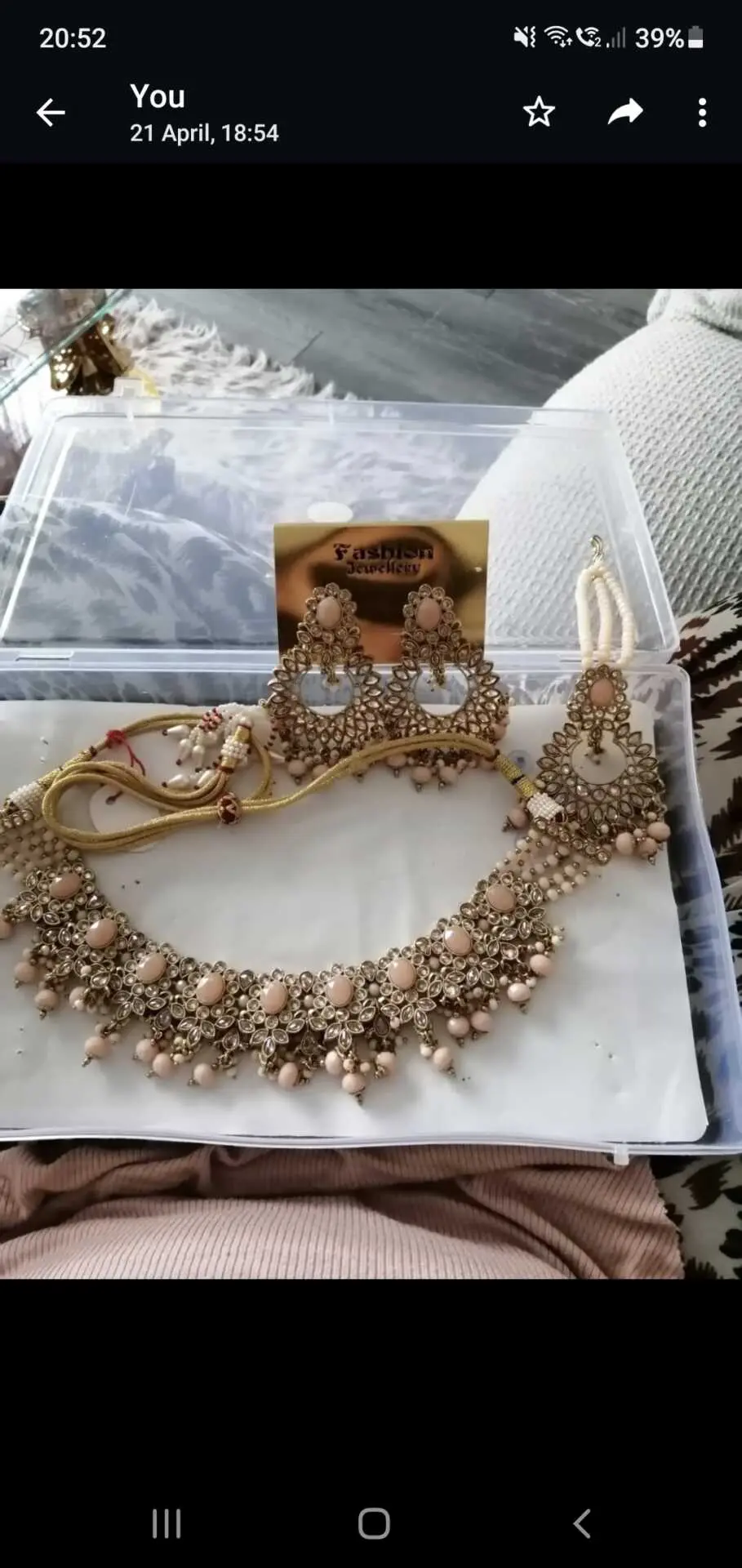Beautiful peach and gold earings and necklace and a tikka