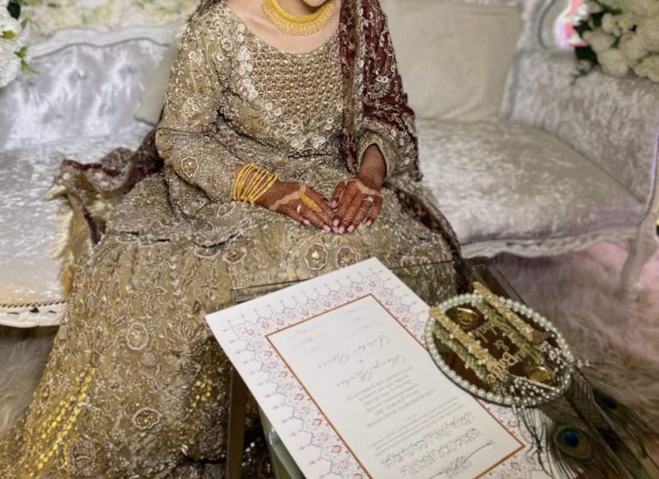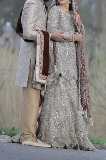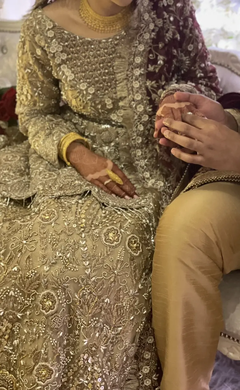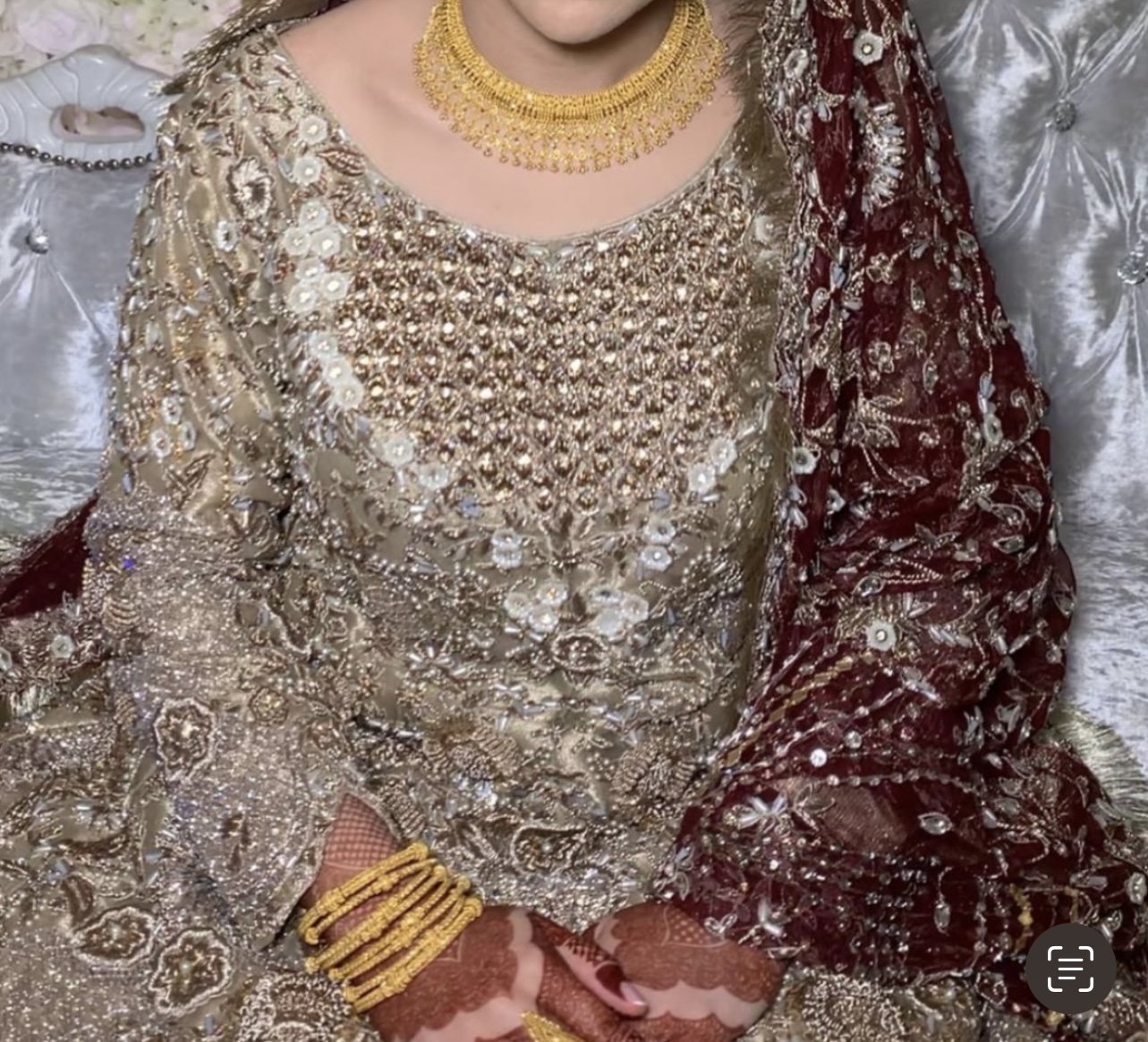 Three piece Gold Lengha with a heavy maroon dupatta designed by Nees London. This outfit includes a detailed kameez, lengha and heavy dupatta. It was purchased in 2021 for £3600 and only worn once for around 4 hours as it was an intimate nikkah. It can be worn as a bridal lengha but also as a party outfit with just the kameez and some gold trousers. The detail on the outfit is extremely heavy and all work has been hand stitched. This outfit showcases authentic Pakistani designing and I’m proud of have worn this. It would fit Small to Medium.