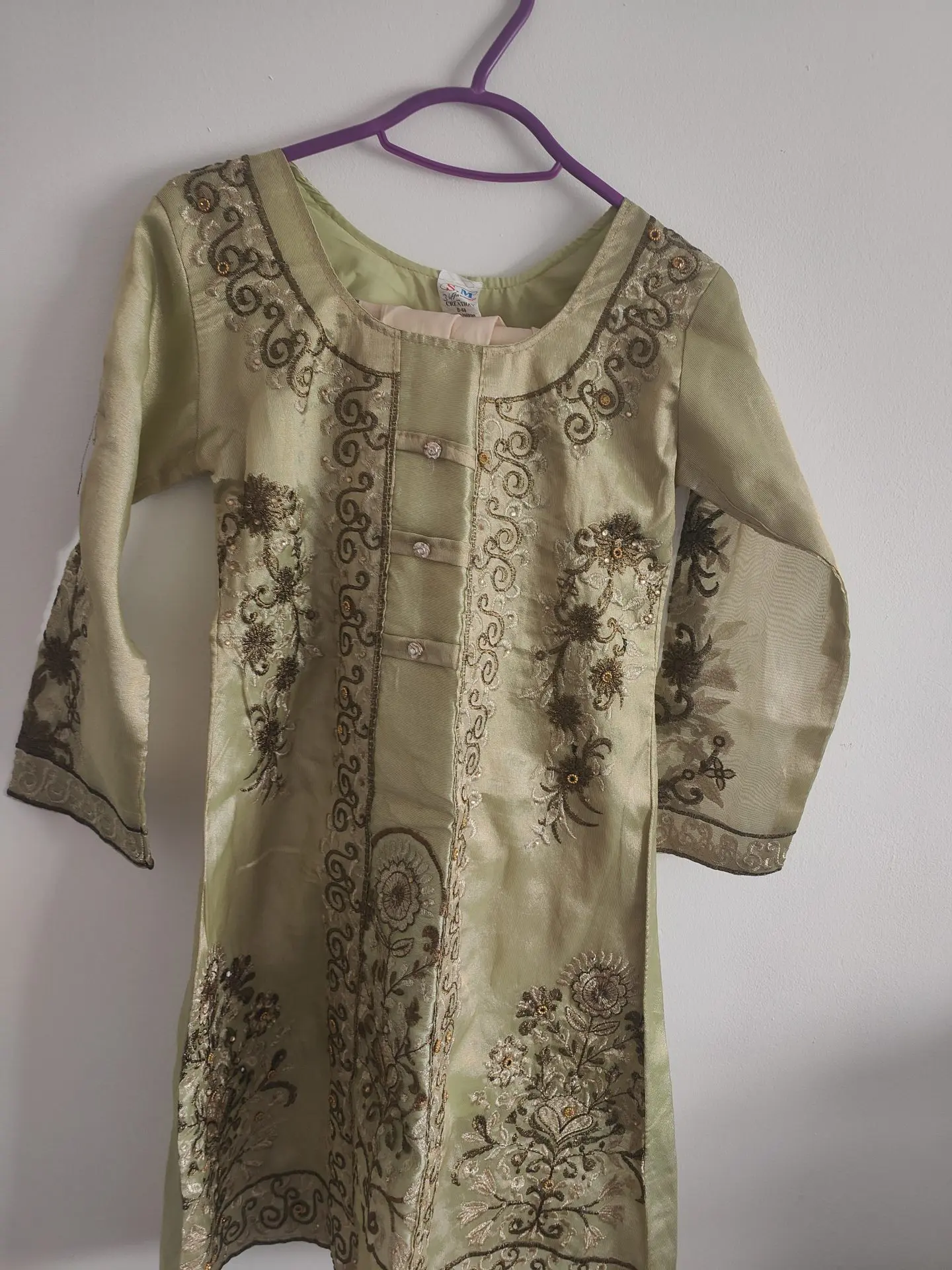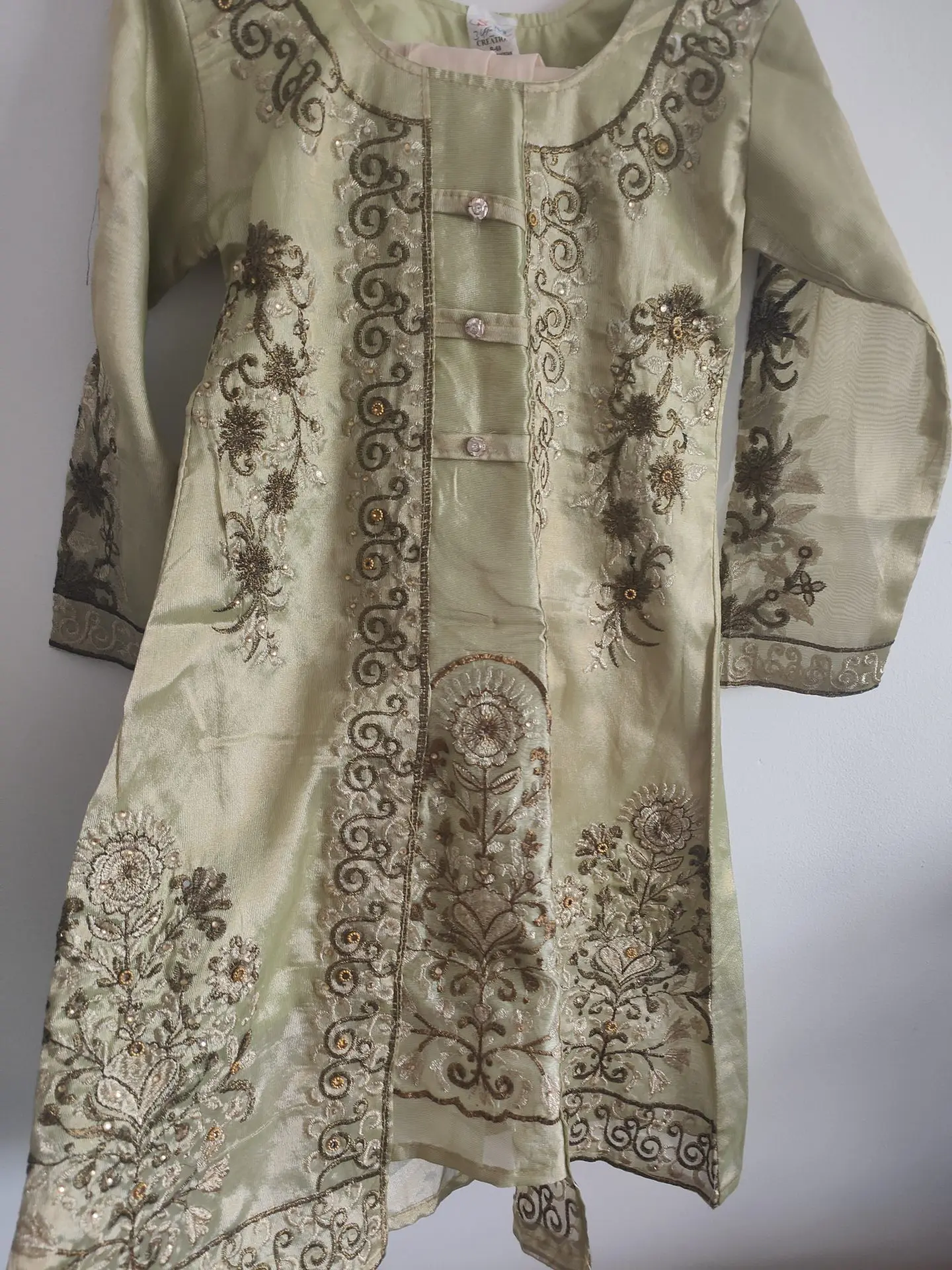 Beautiful Goldy green girls Asian kameez and trouser suit. Size 34.