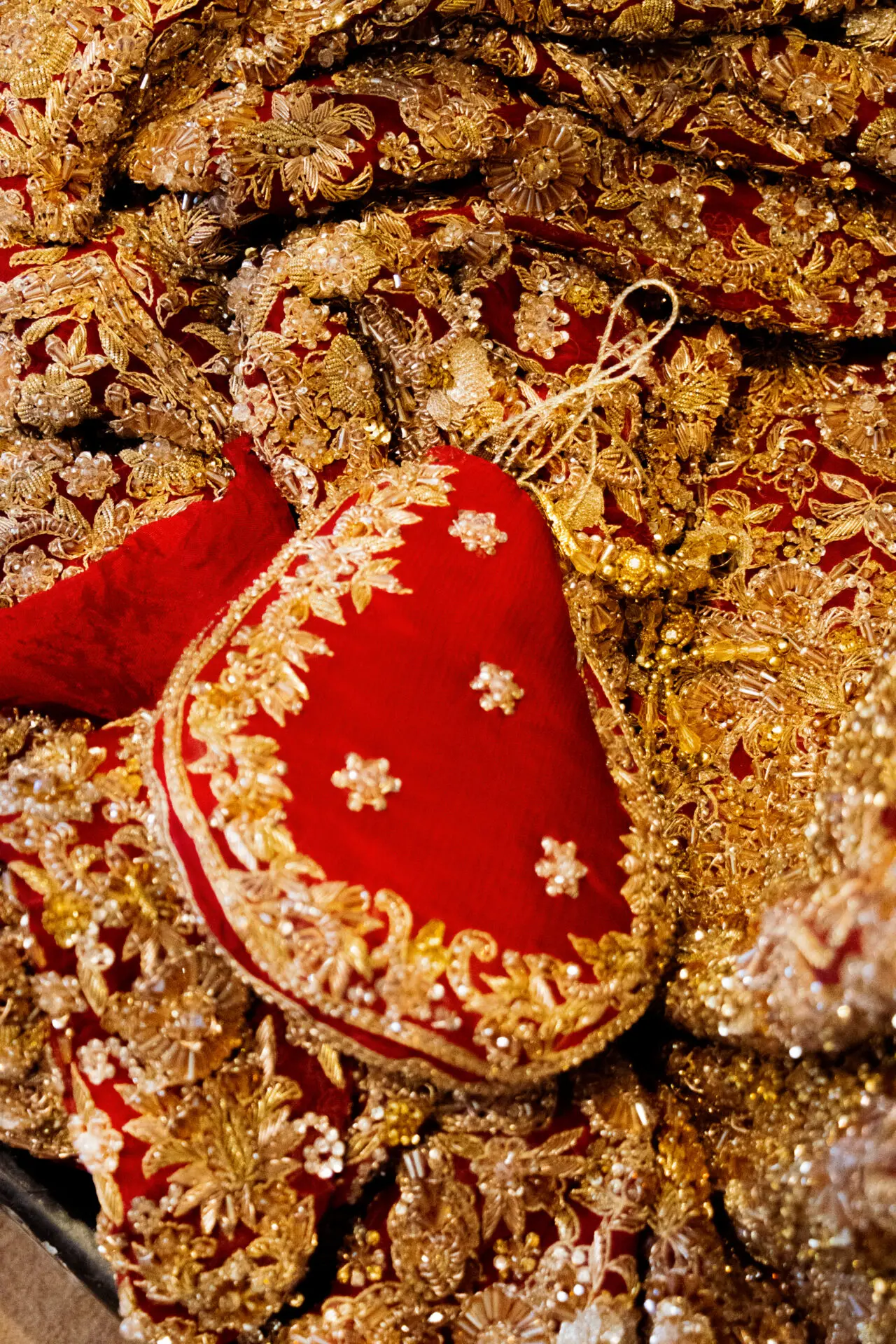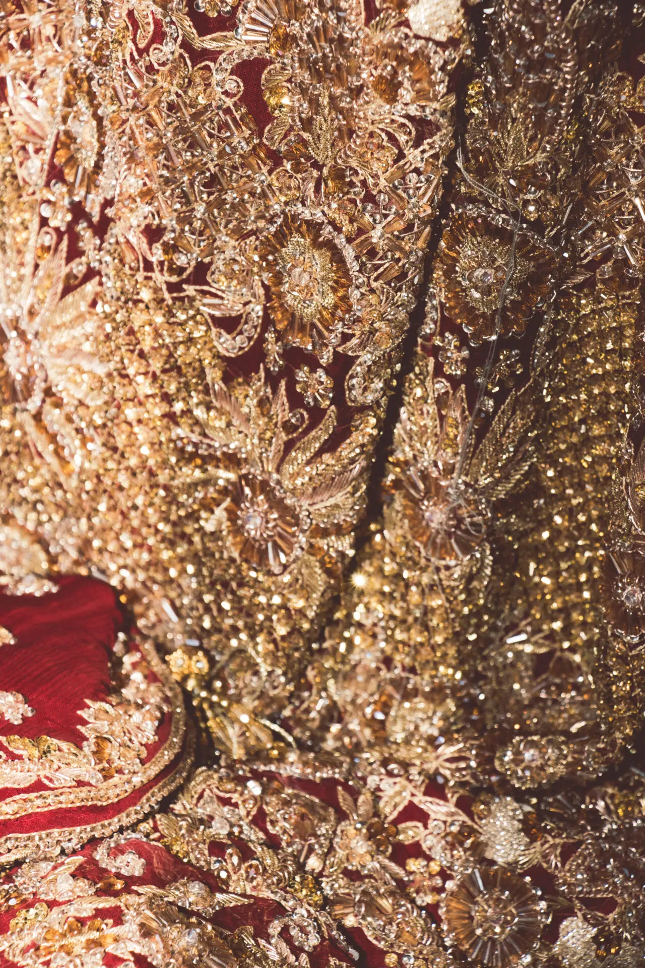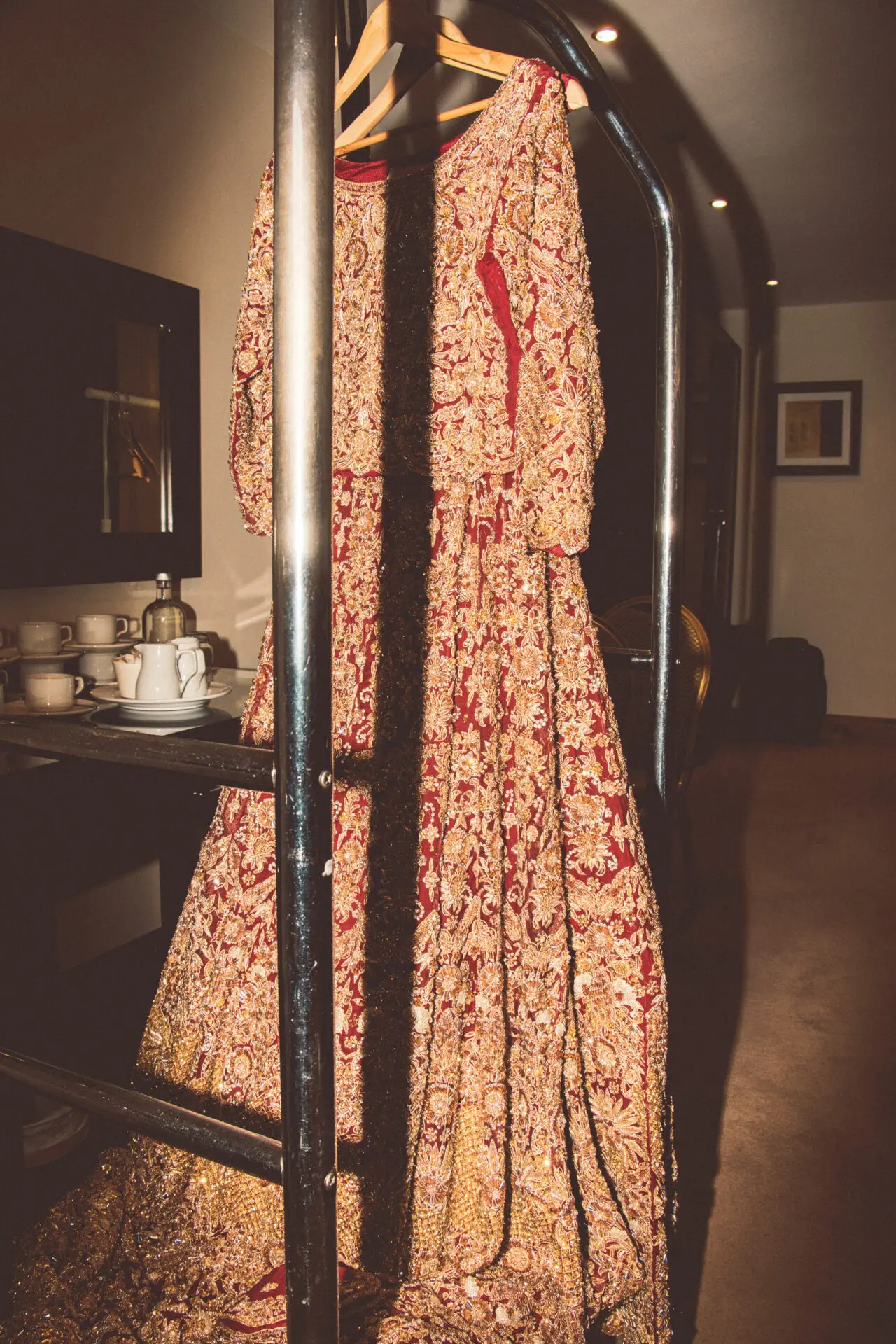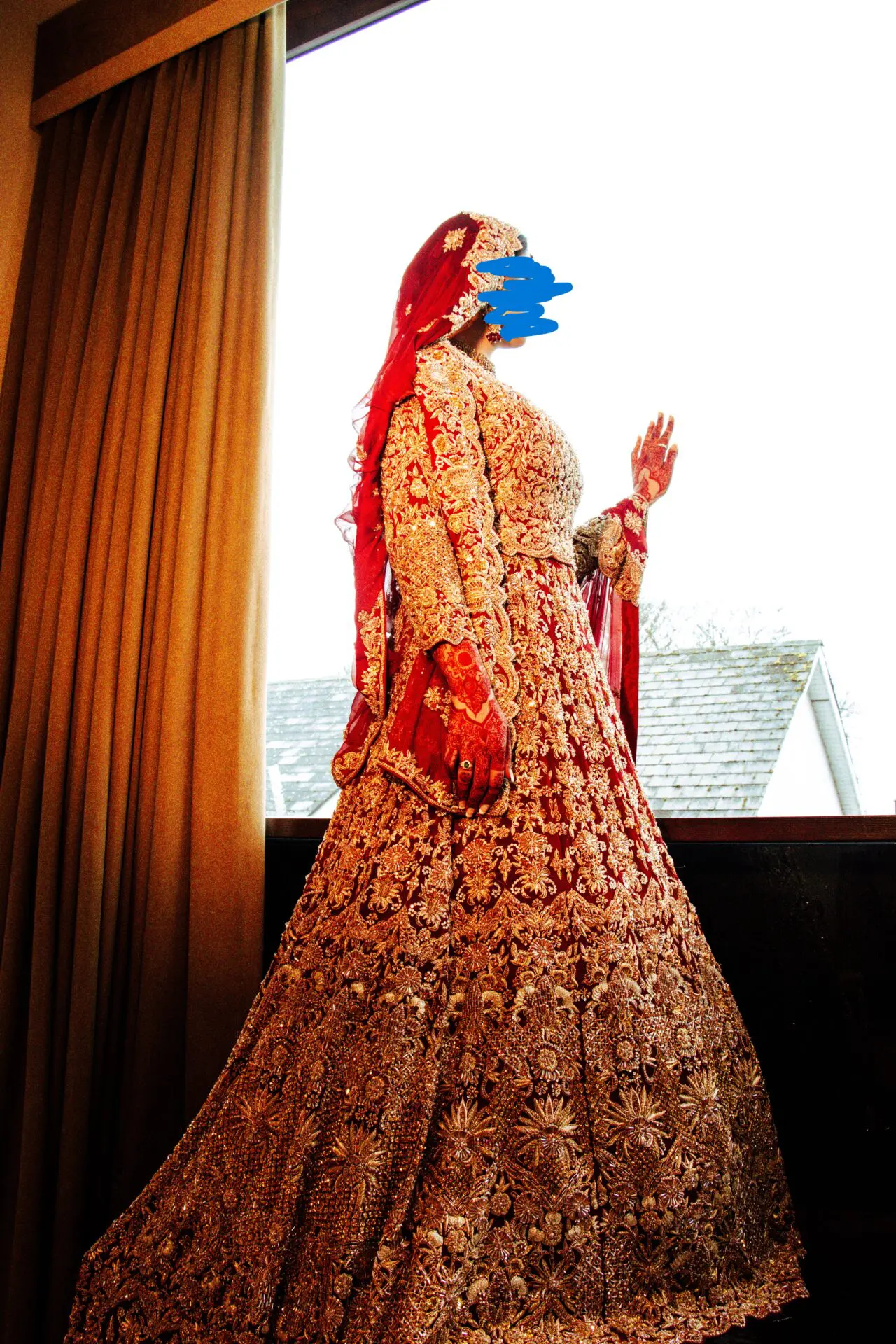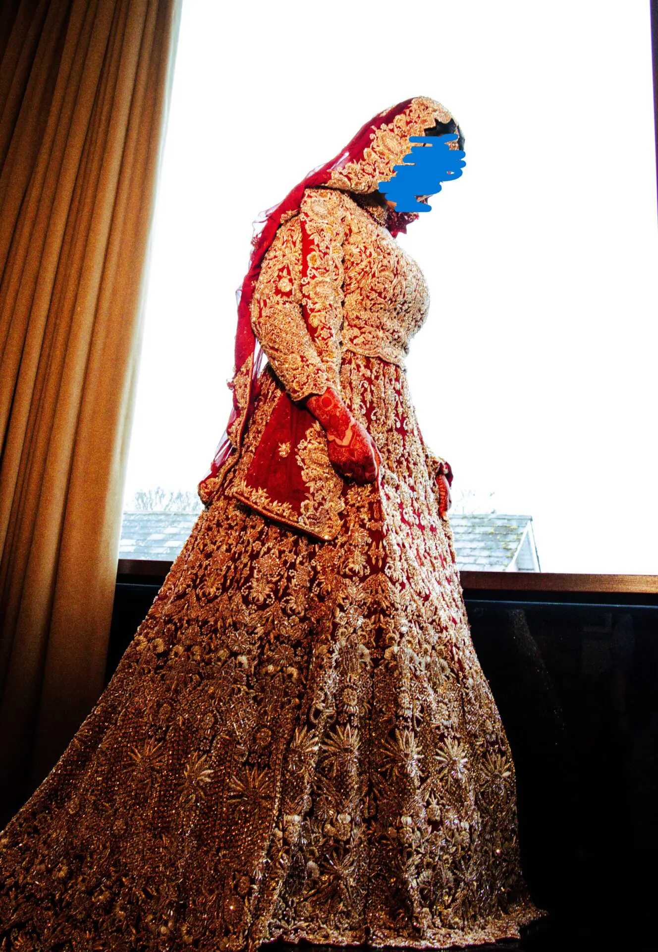 Heavy bridal 2023 Pakistani wedding dress with train, dupatta, and matching bag.