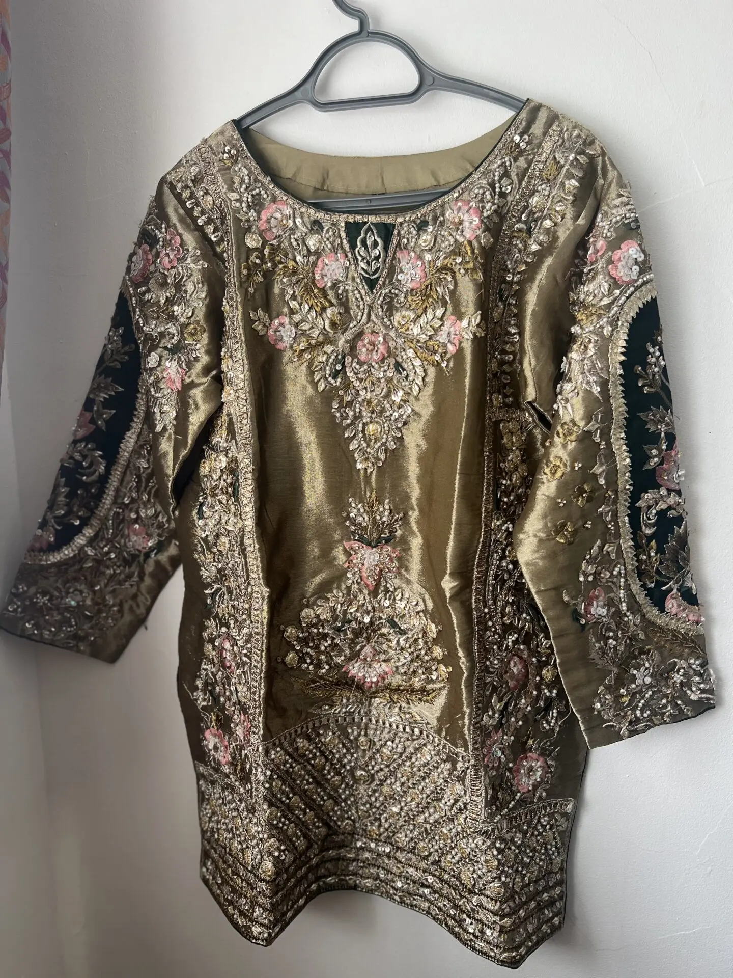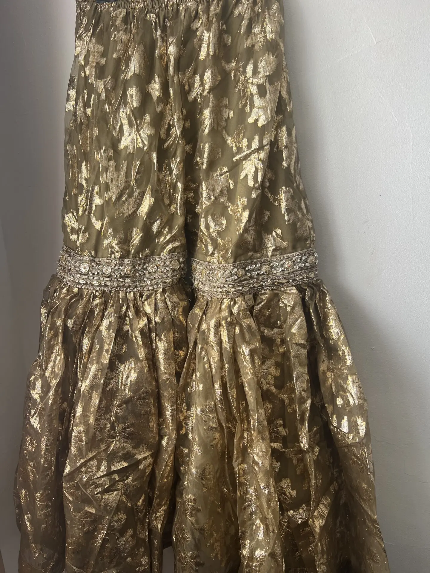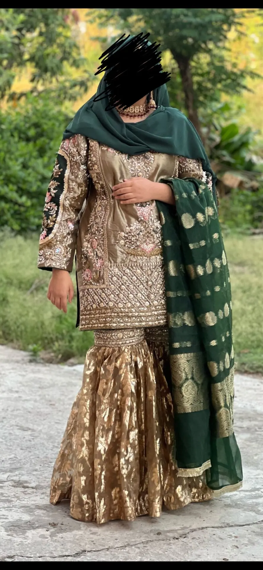 Has beadwork and sequins across the front with a beautiful puffy gharara and comes with a net dabatta