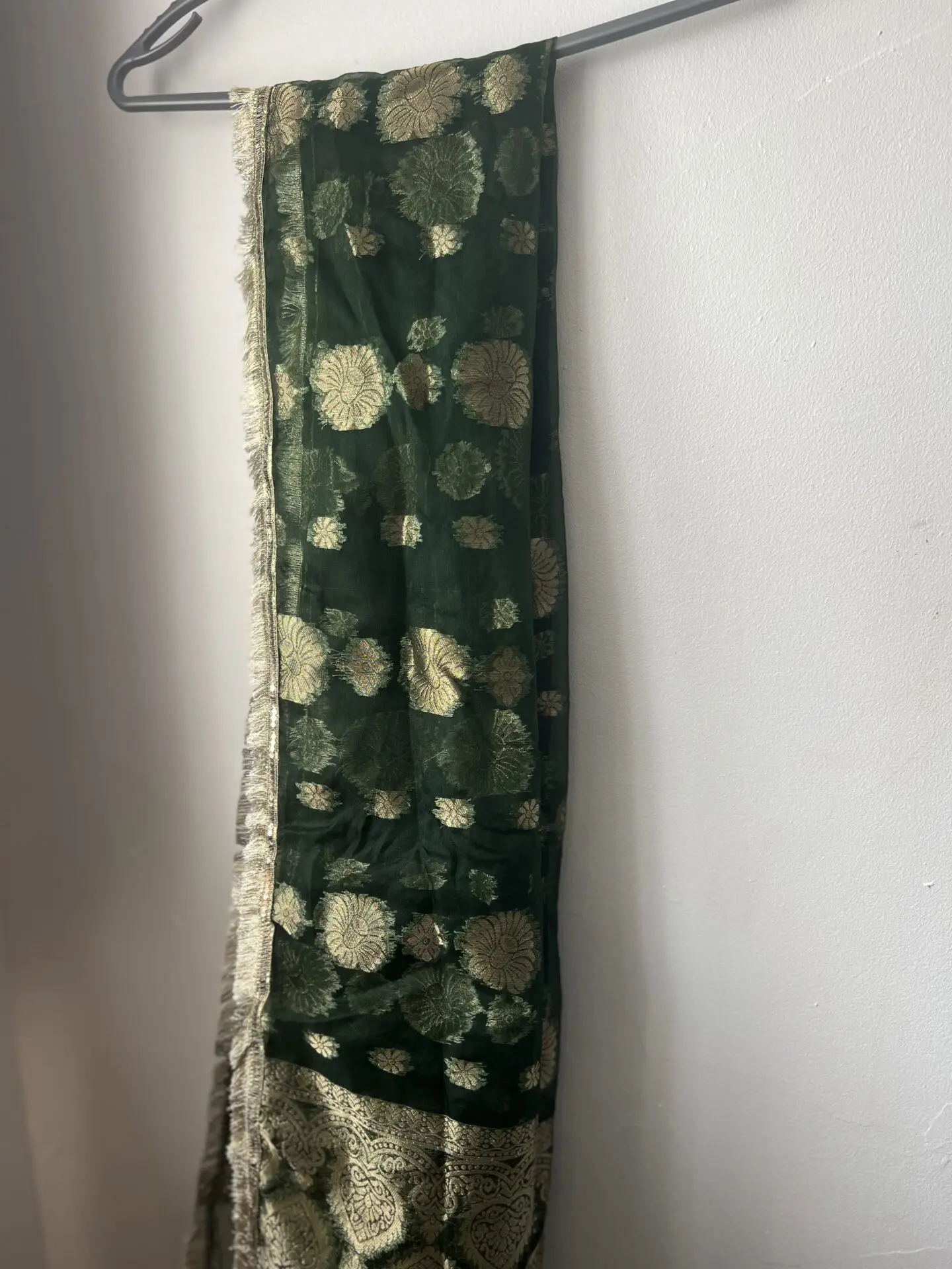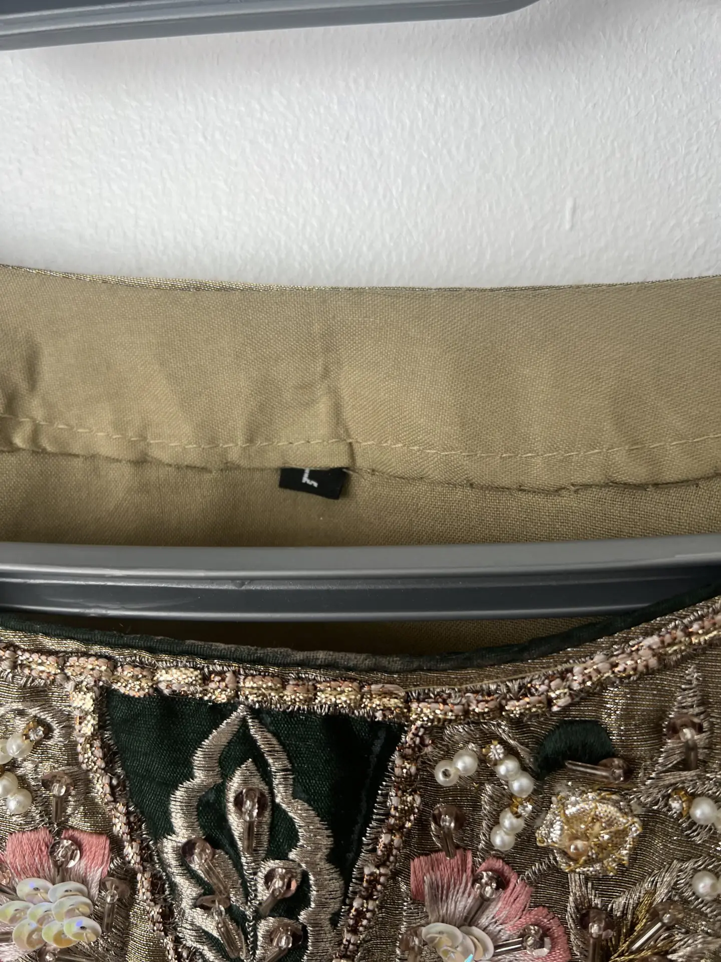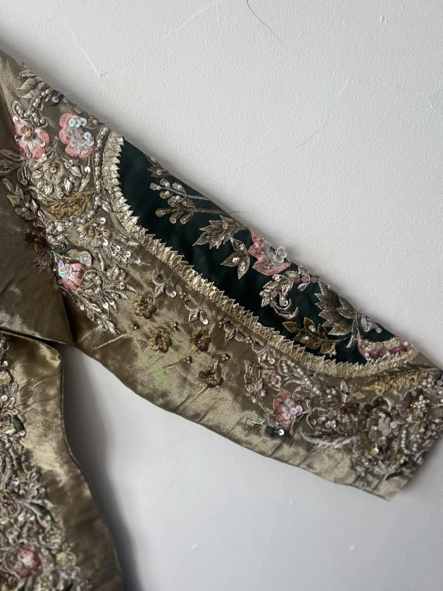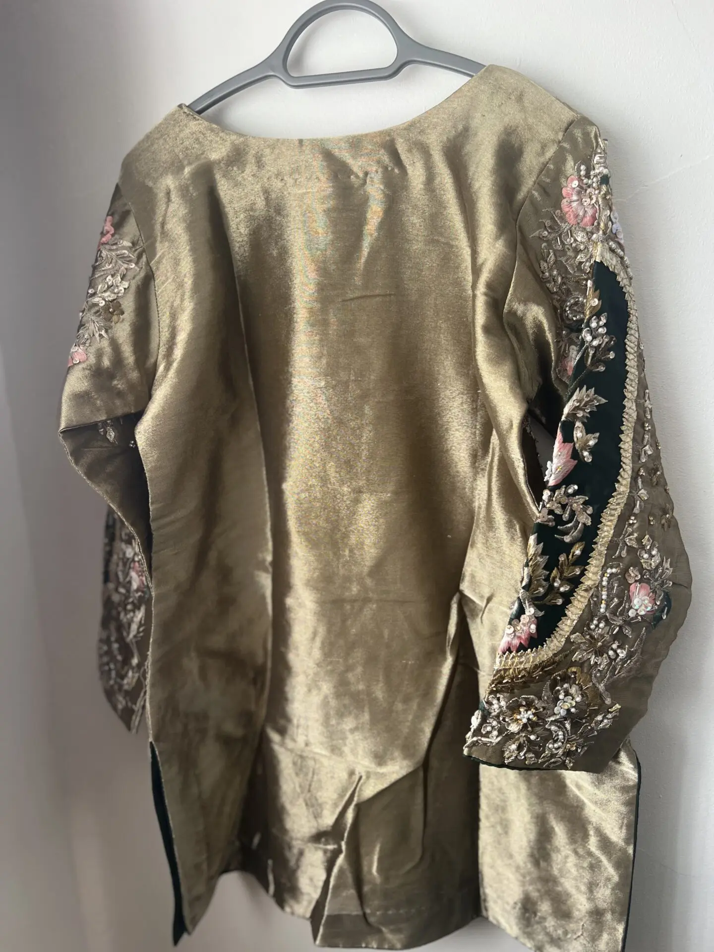 Has beadwork and sequins across the front with a beautiful puffy gharara and comes with a net dabatta