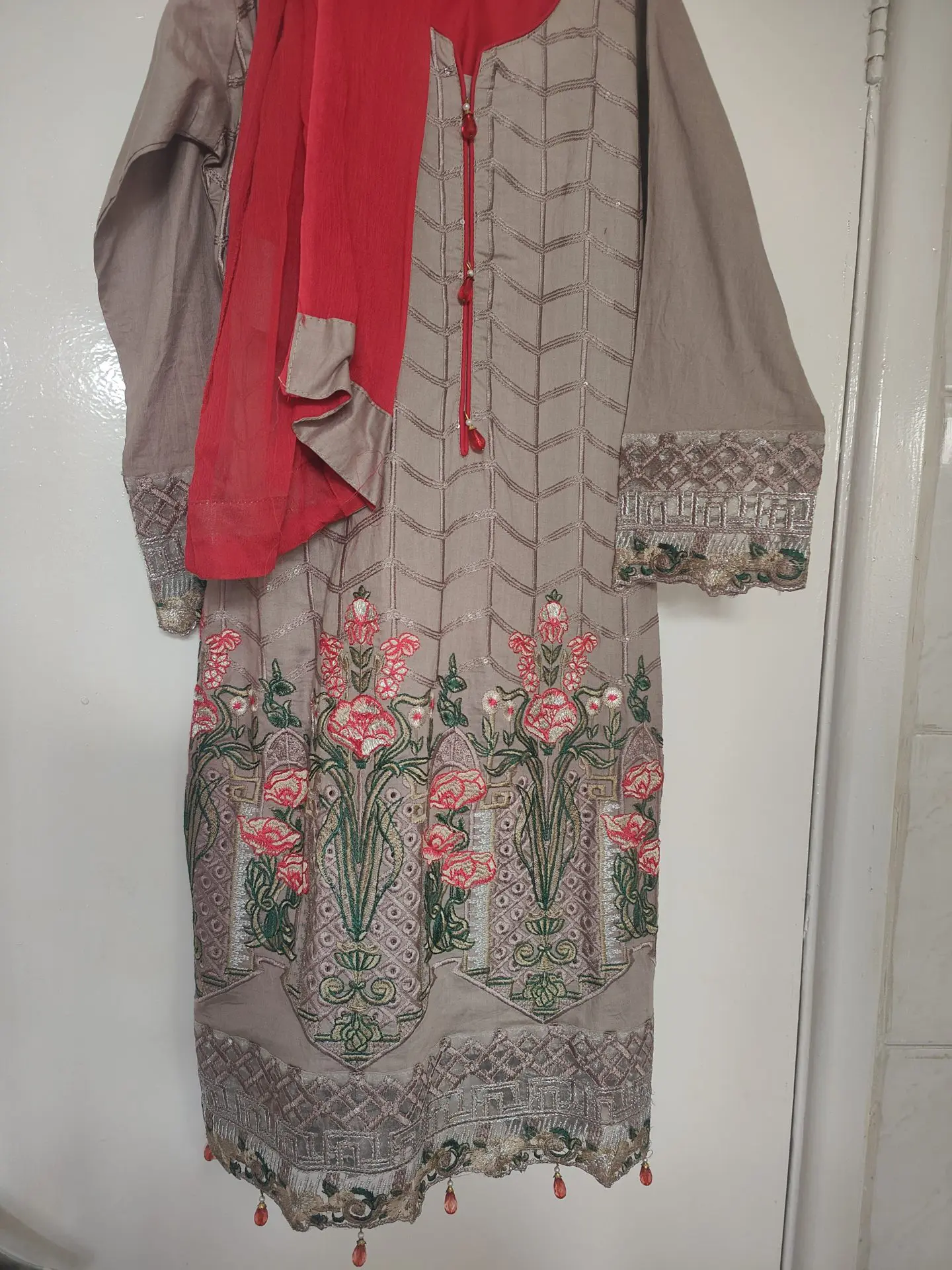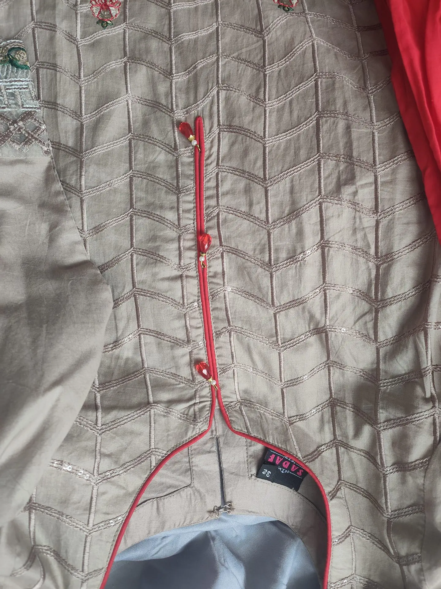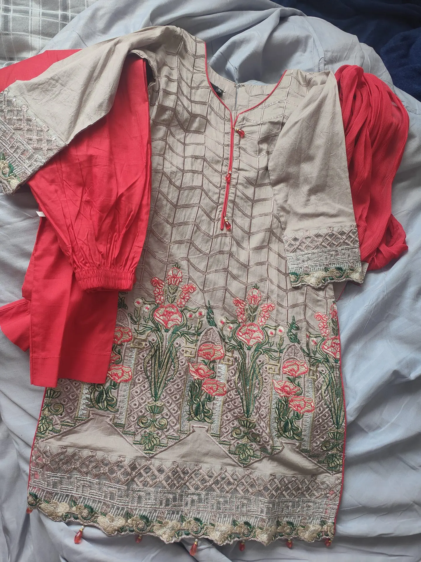 New Pakistani Beautiful Beige and red, size 32 girls trousers suit with scarf.