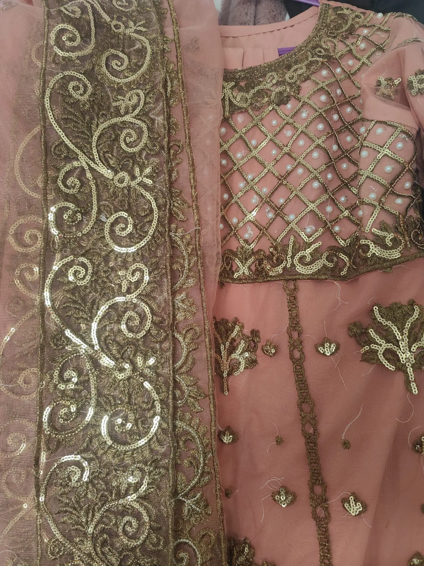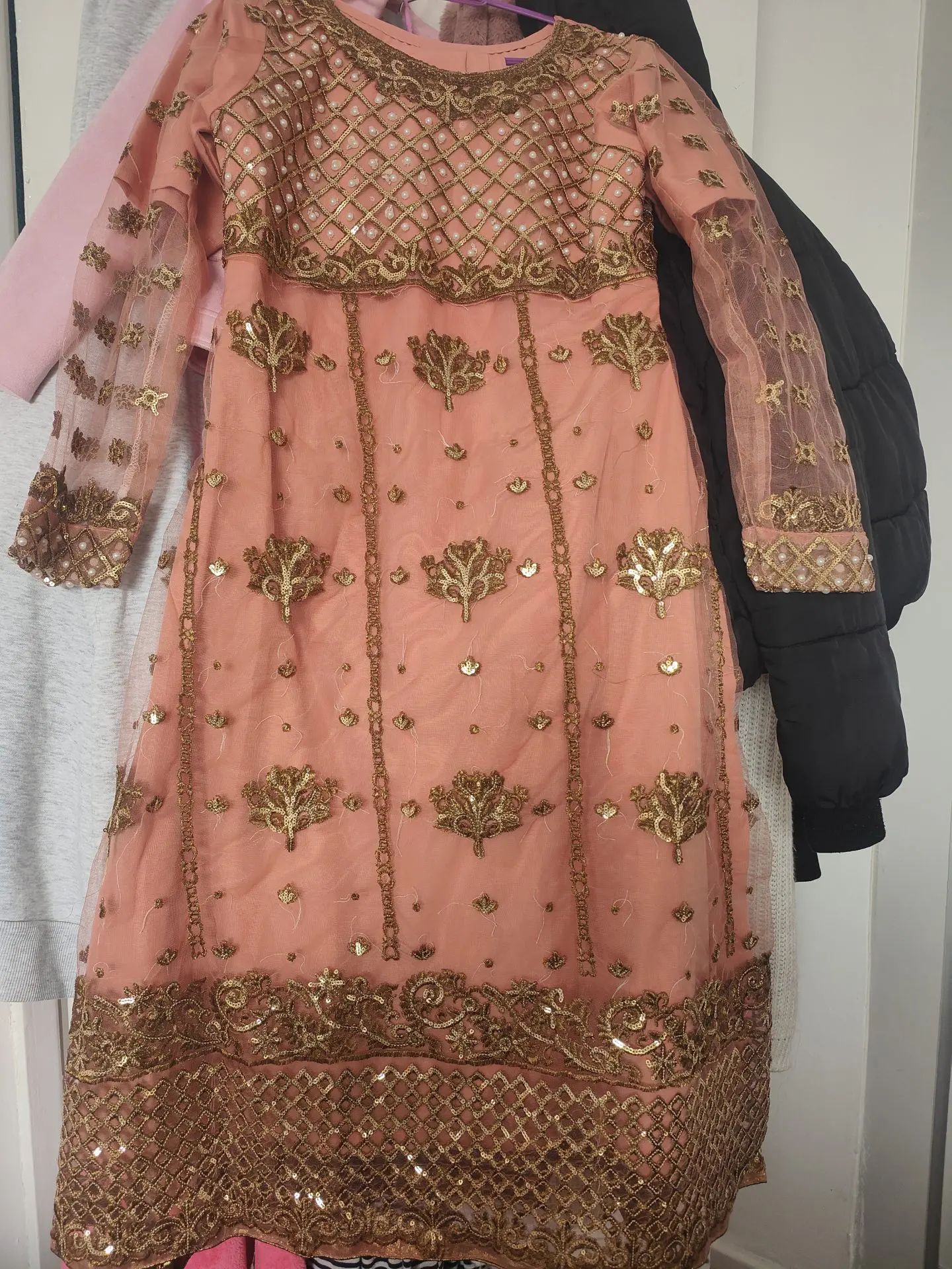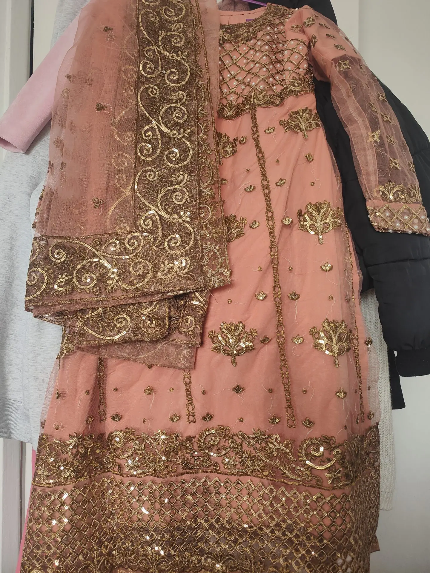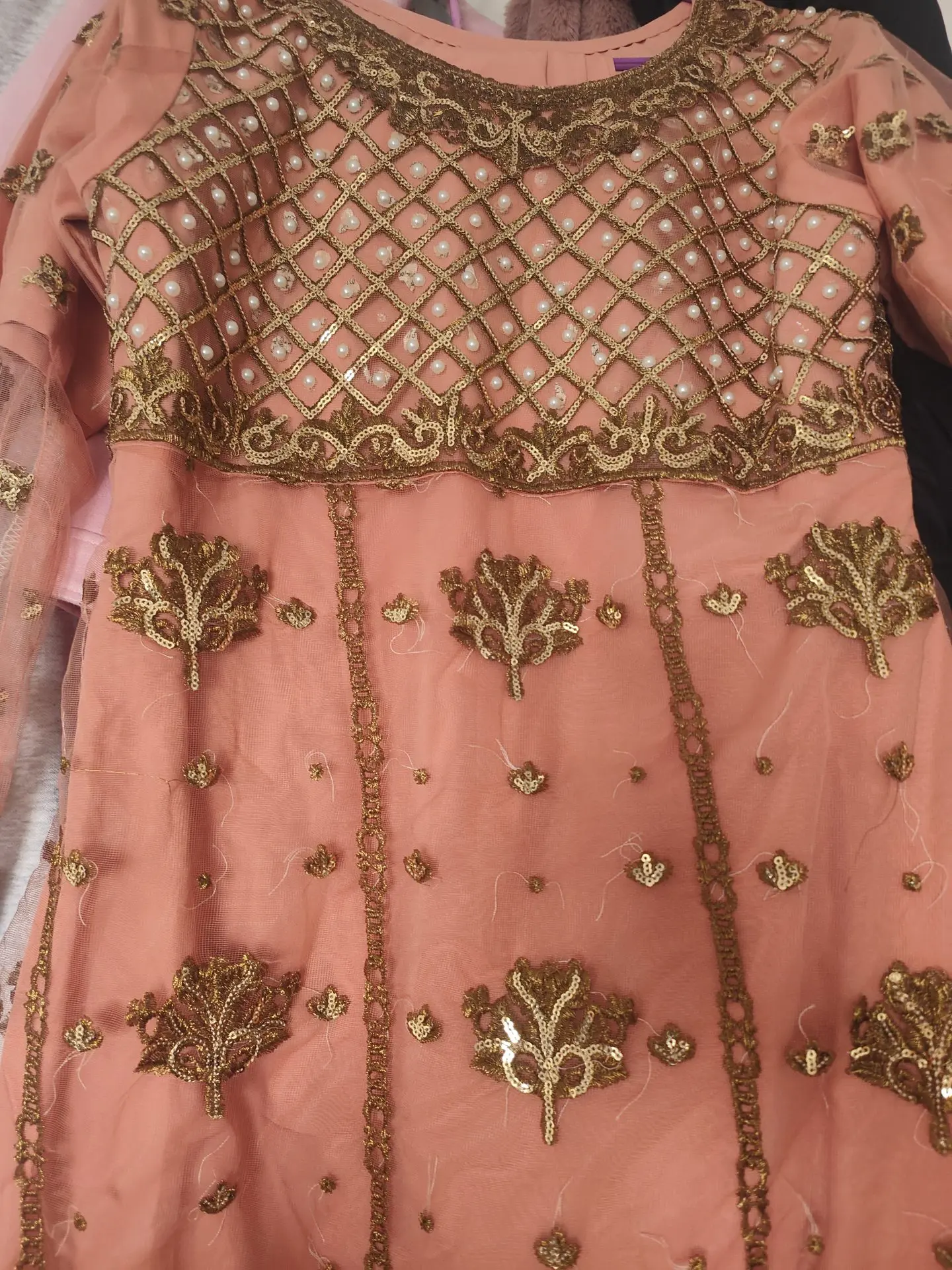 A beautiful pink and gold designed Frock Pakistani outfit. Was made to measure in Pakistan but unfortunately I didn't get chance to wear and now it doesn't fit. Size 10 made.