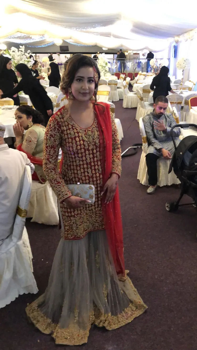 Bought this outfit from 7aatrang for £500. Has only been worn a couple of hours for my sisters wedding and hasn’t been worn since. It fits a size 10/12 and is very heavy. The top and sharara is made quite heavy.