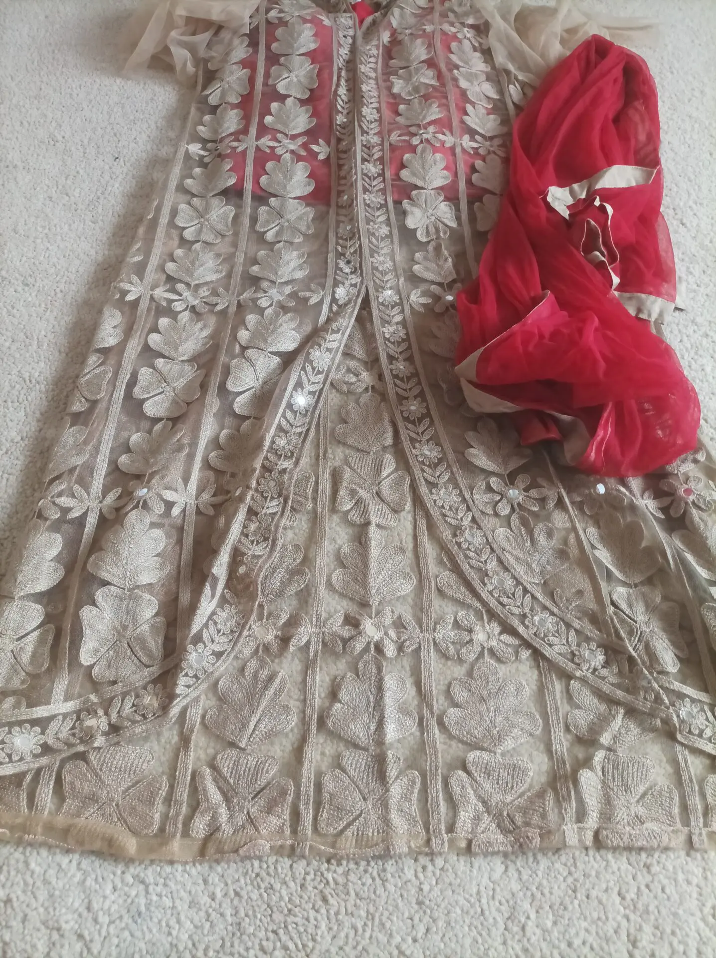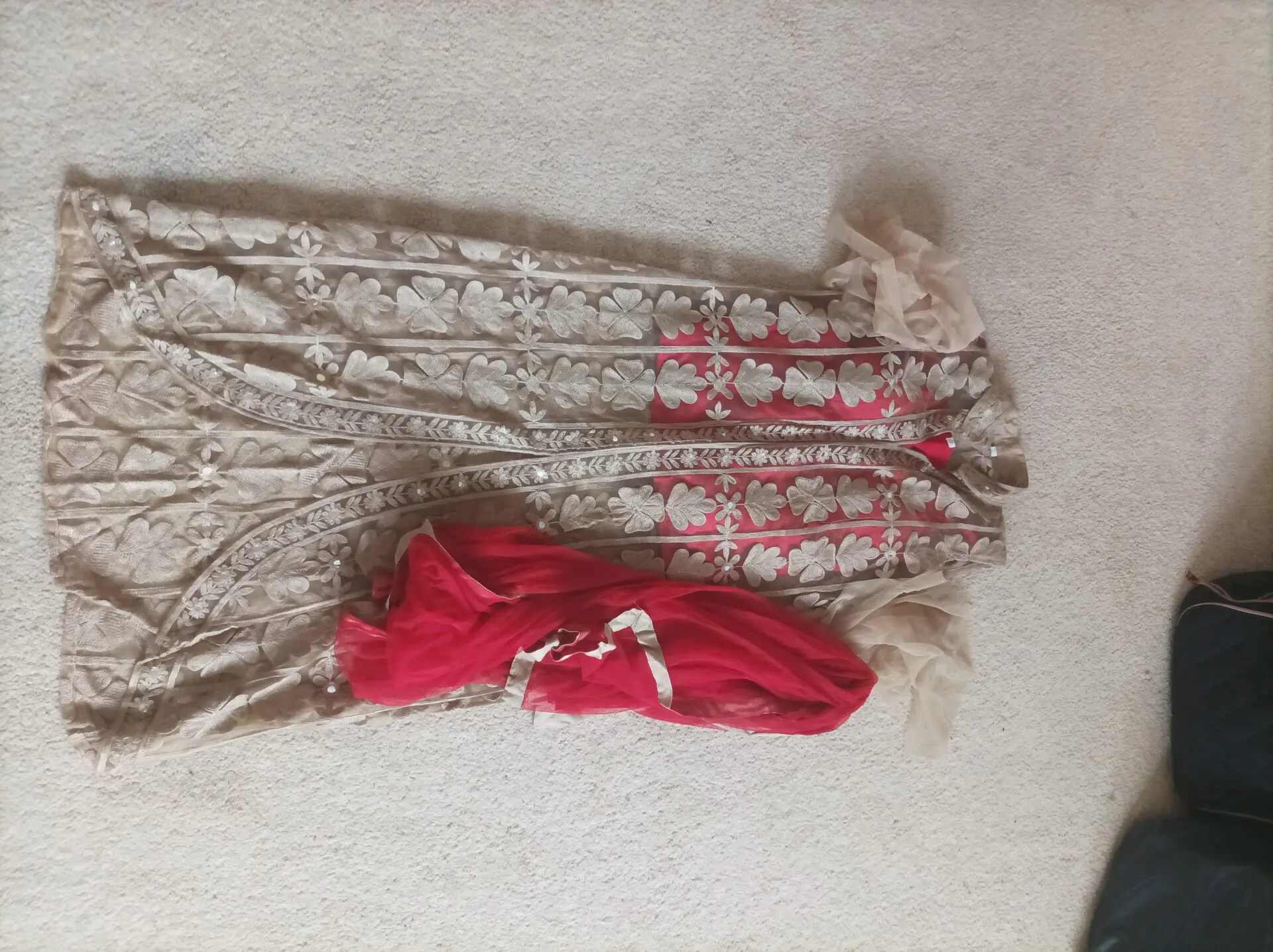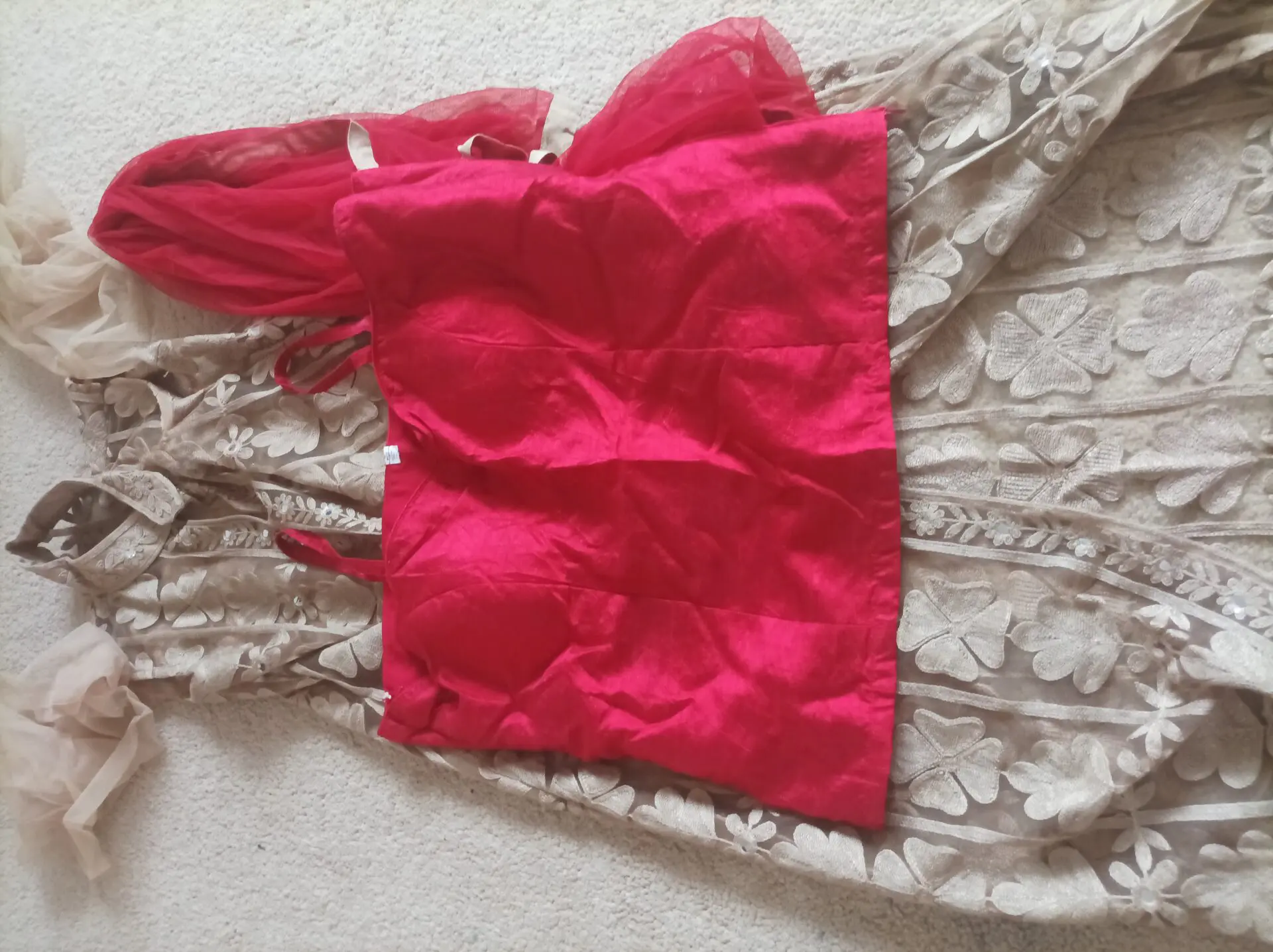 3 piece outfit, trousers are the same material and design as the corset top; silky red plain straight legged.