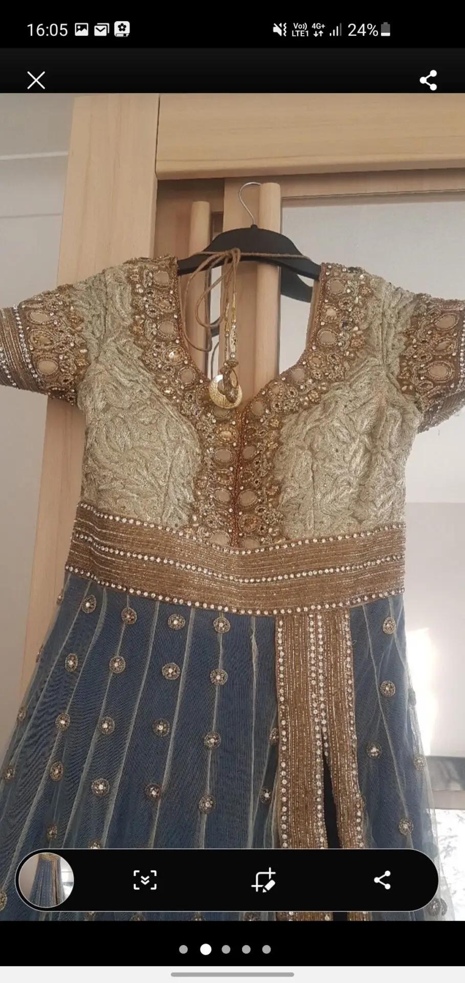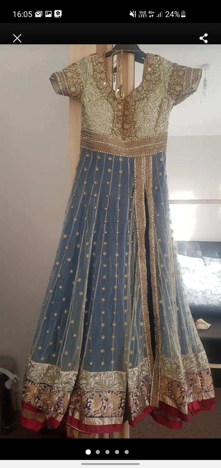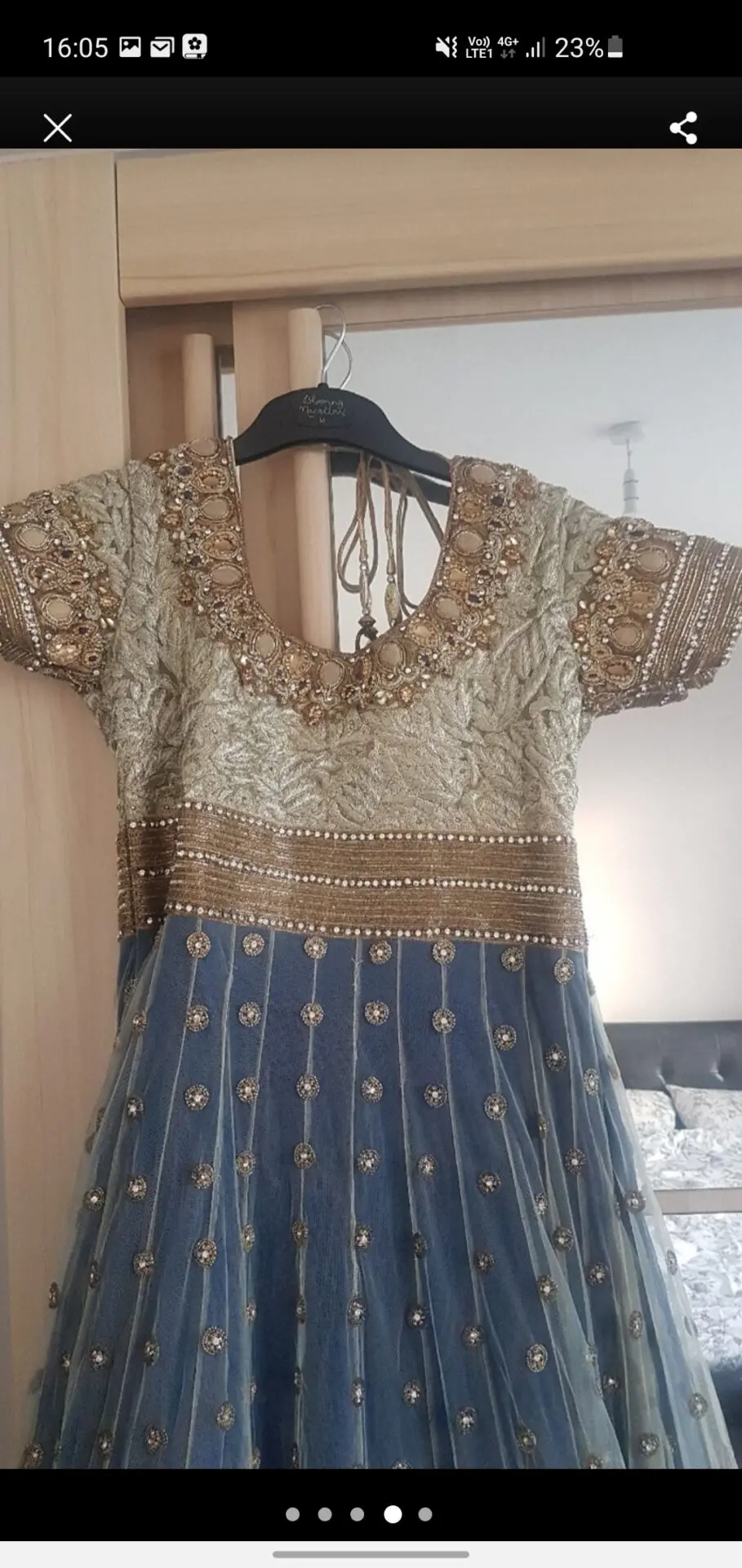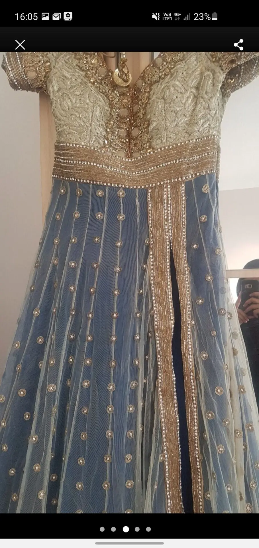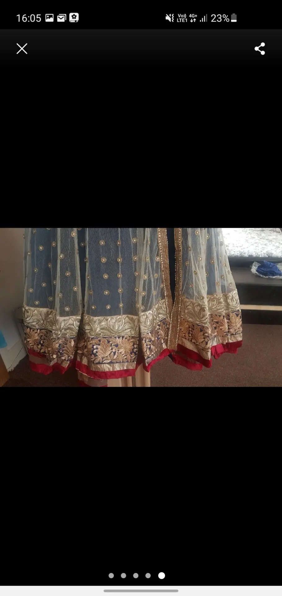 plain blue bottoms to go with the dress and a net scarf with a velvet boarder.