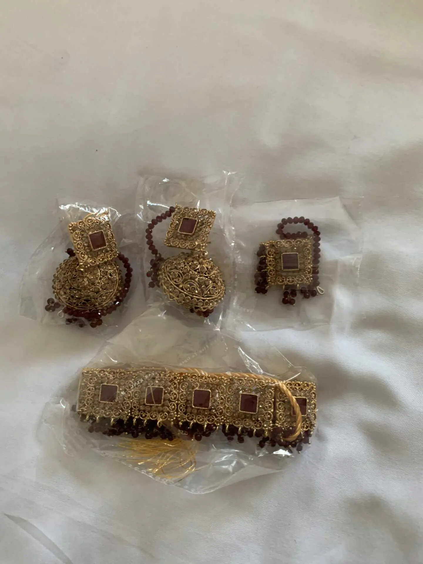 Brand new gold and maroon set. Consists of earrings, tikka and choker style necklace