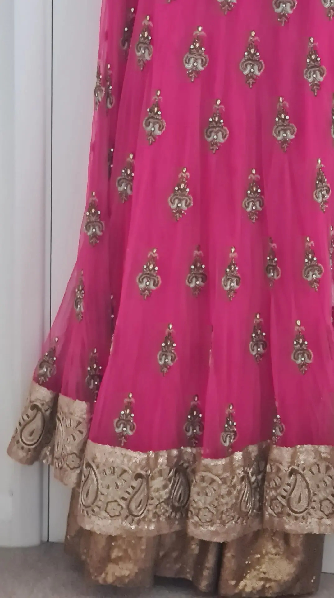 Beautiful Indian outfit with quite heavy embroidery. Can be worn as a guest at a wedding or by the bride for other event days.