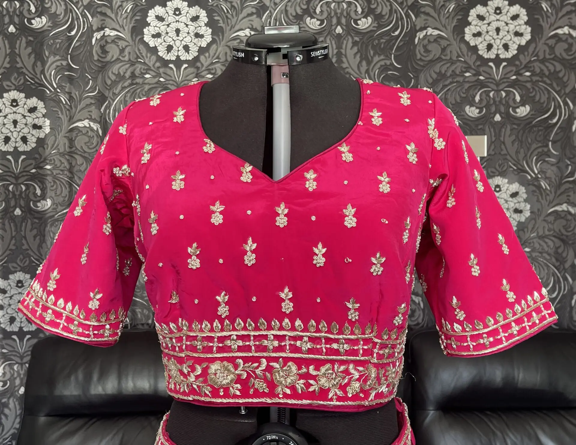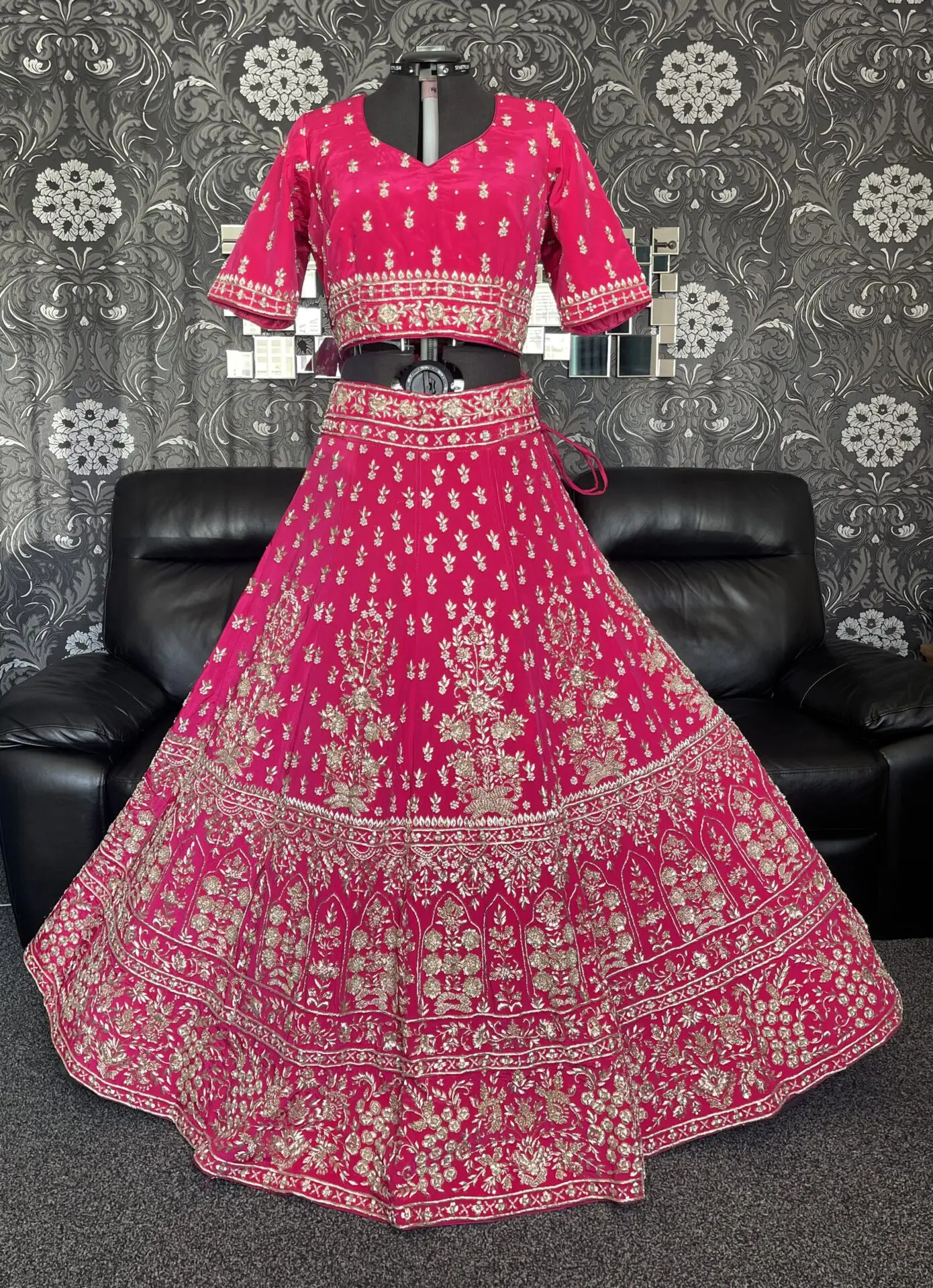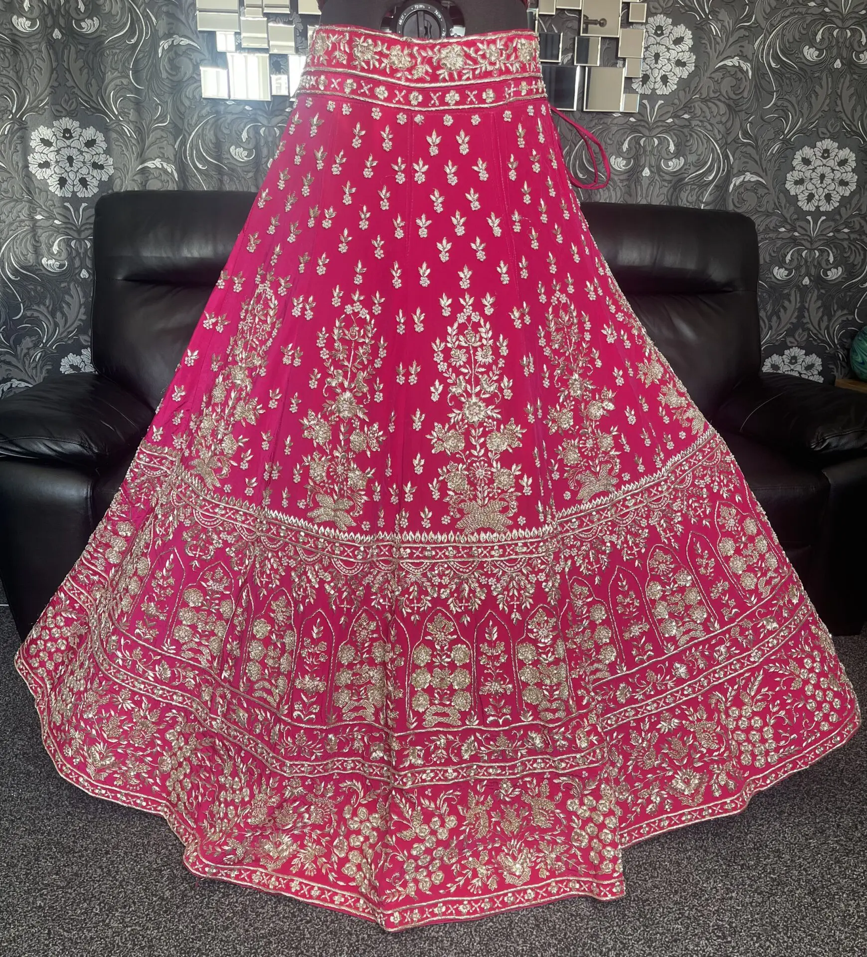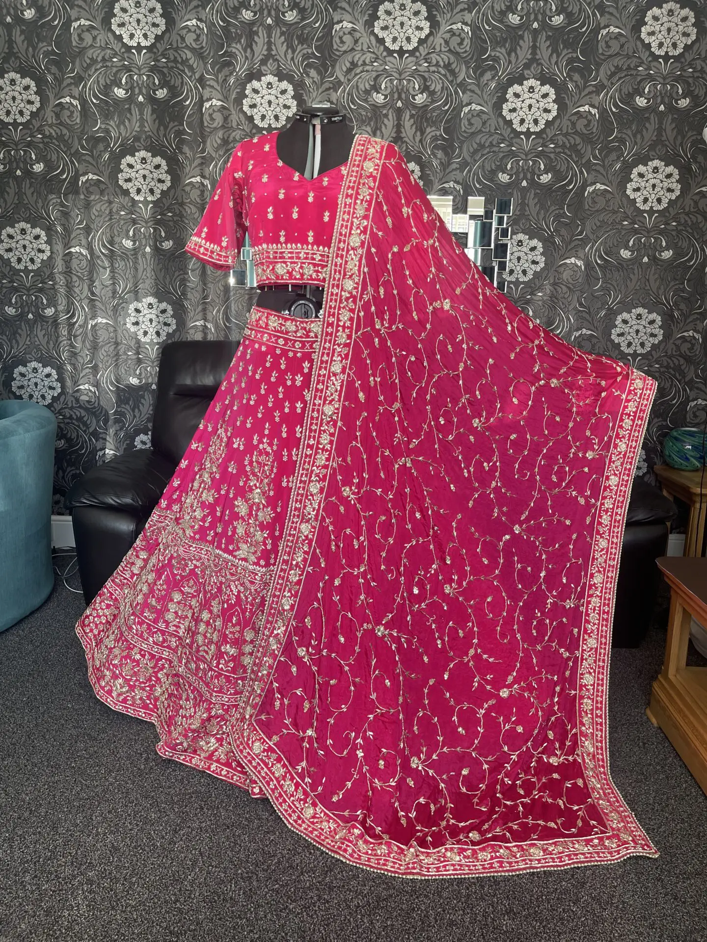 Cerise pink pure silk Reception lehenga and blouse with pure chiffon chunni and all handmade embroidery.