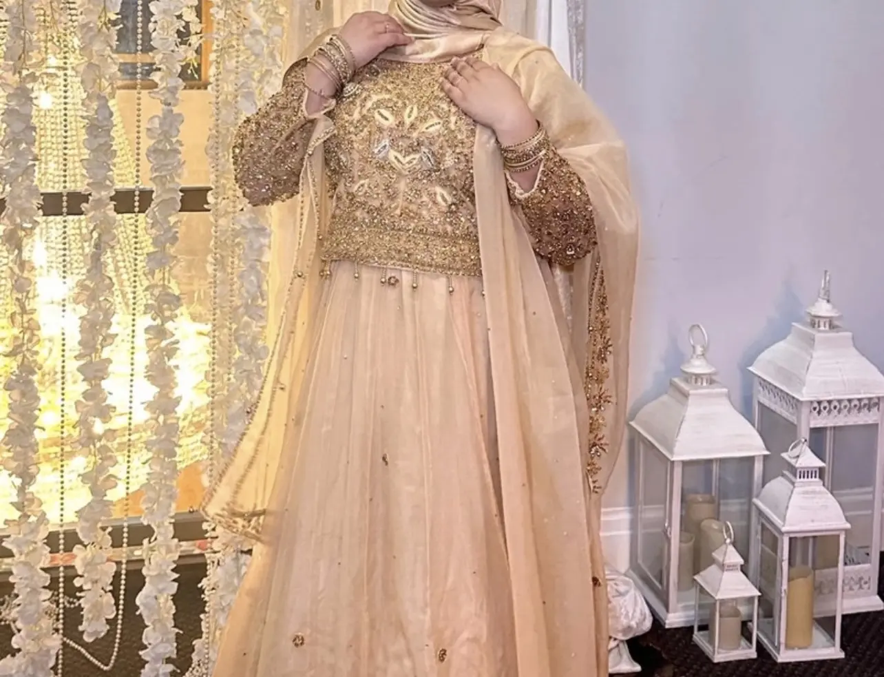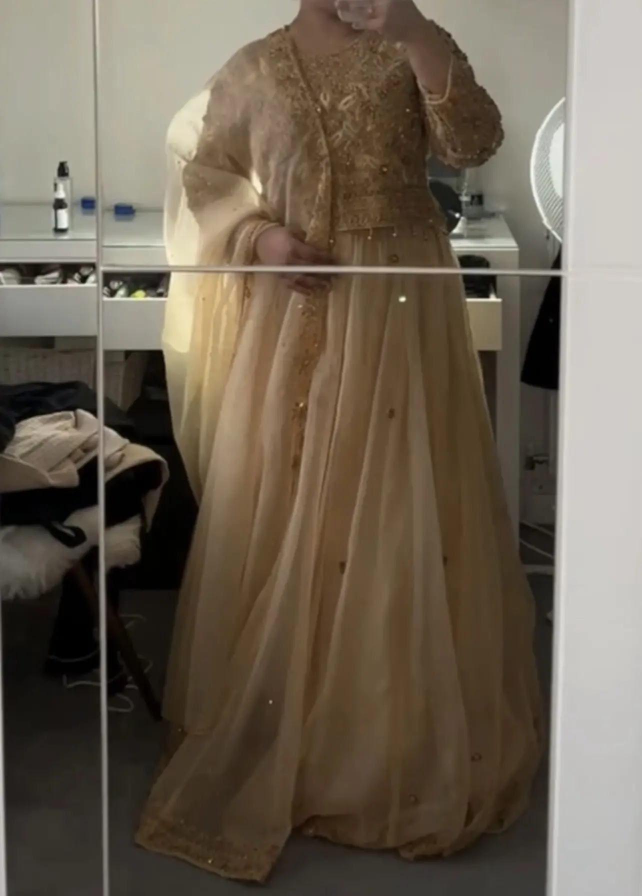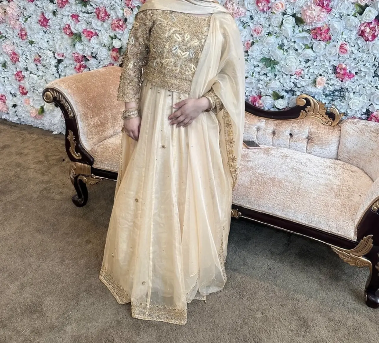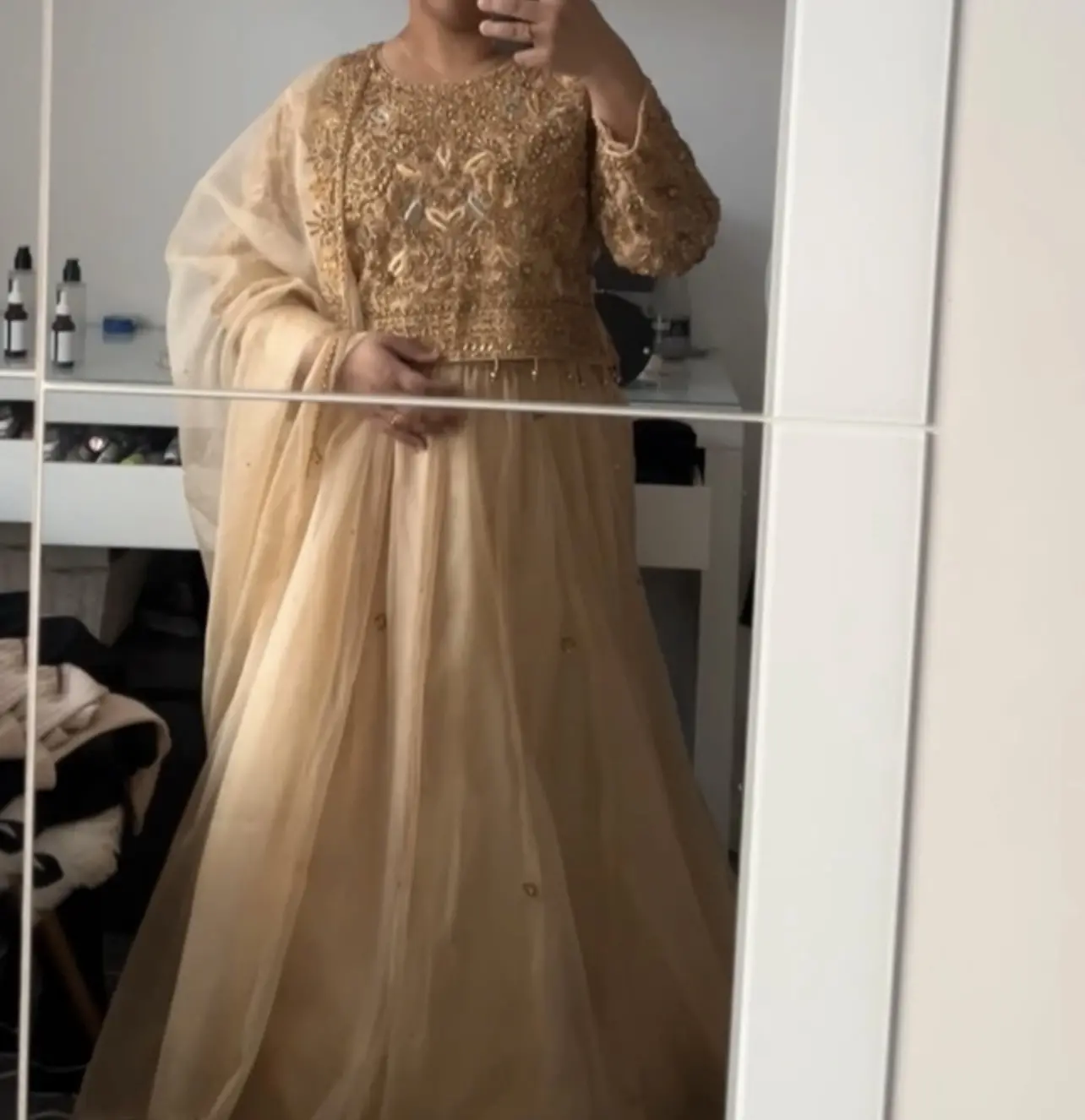 Light gold lehnga with dark gold embroidery and work. Comes with scarf, skirt and top. Comes in original dress bag it was in.