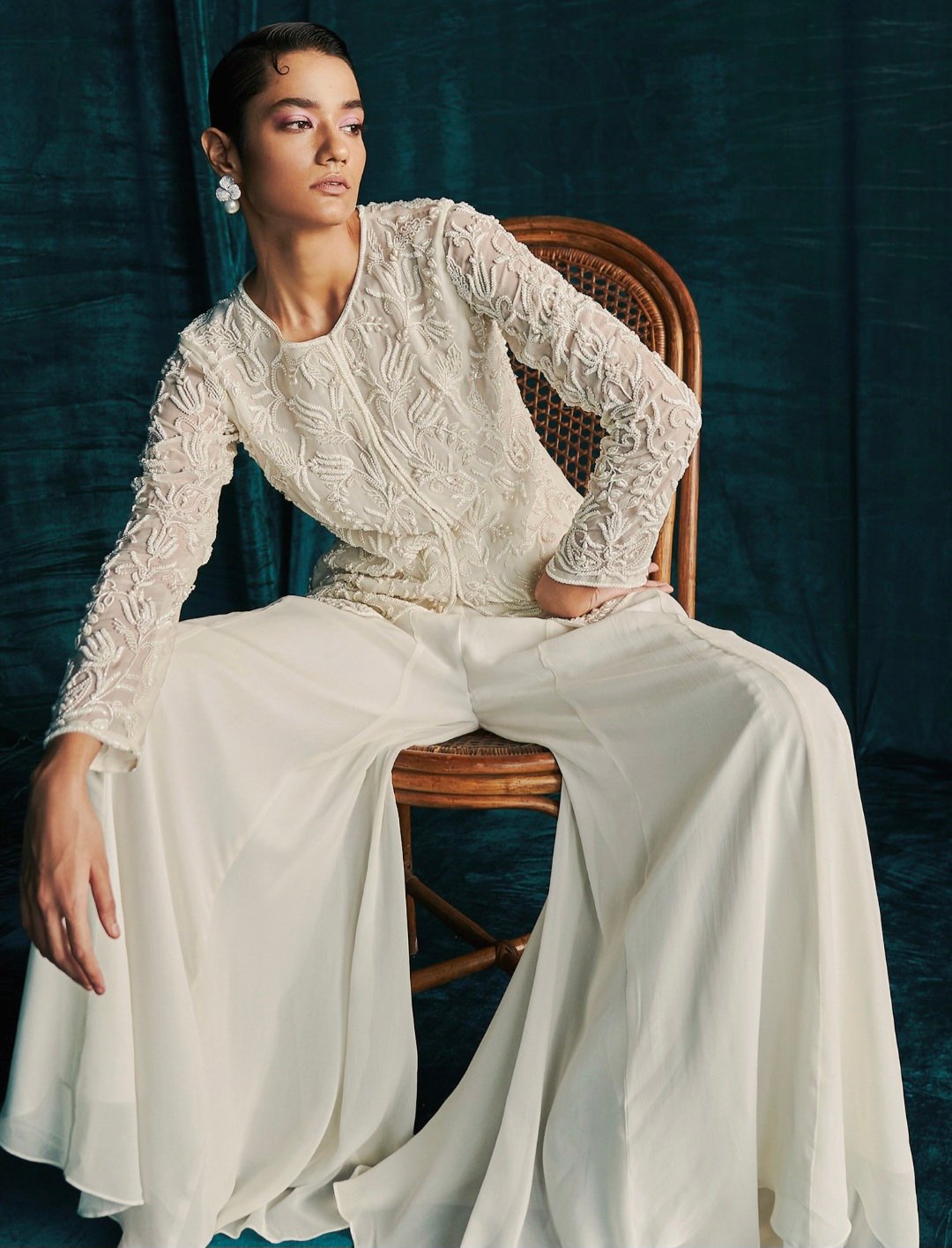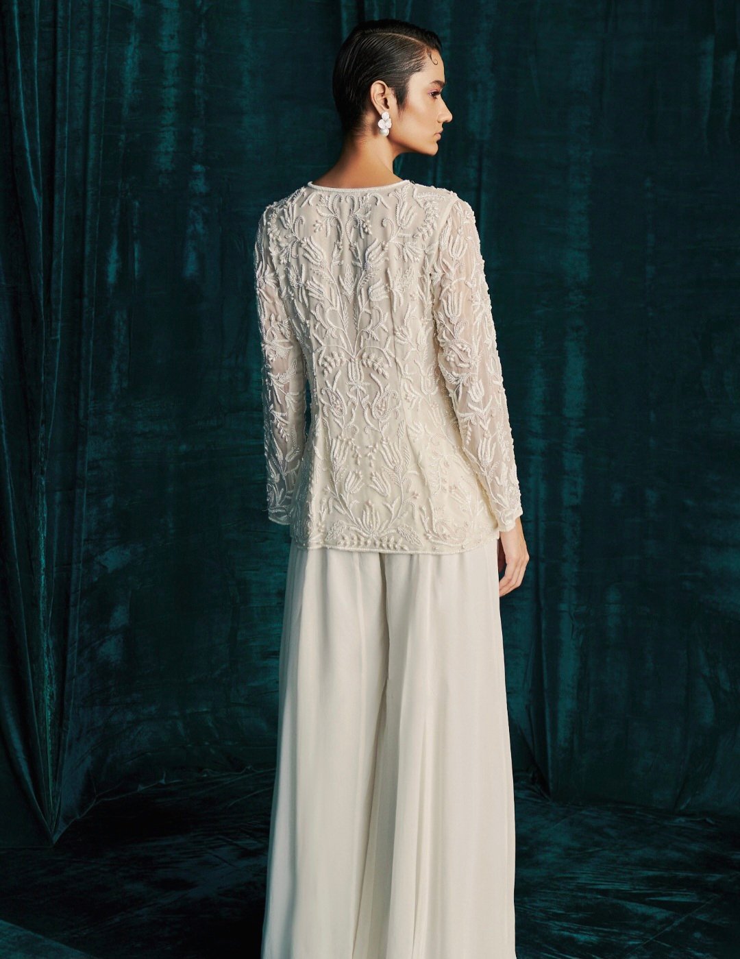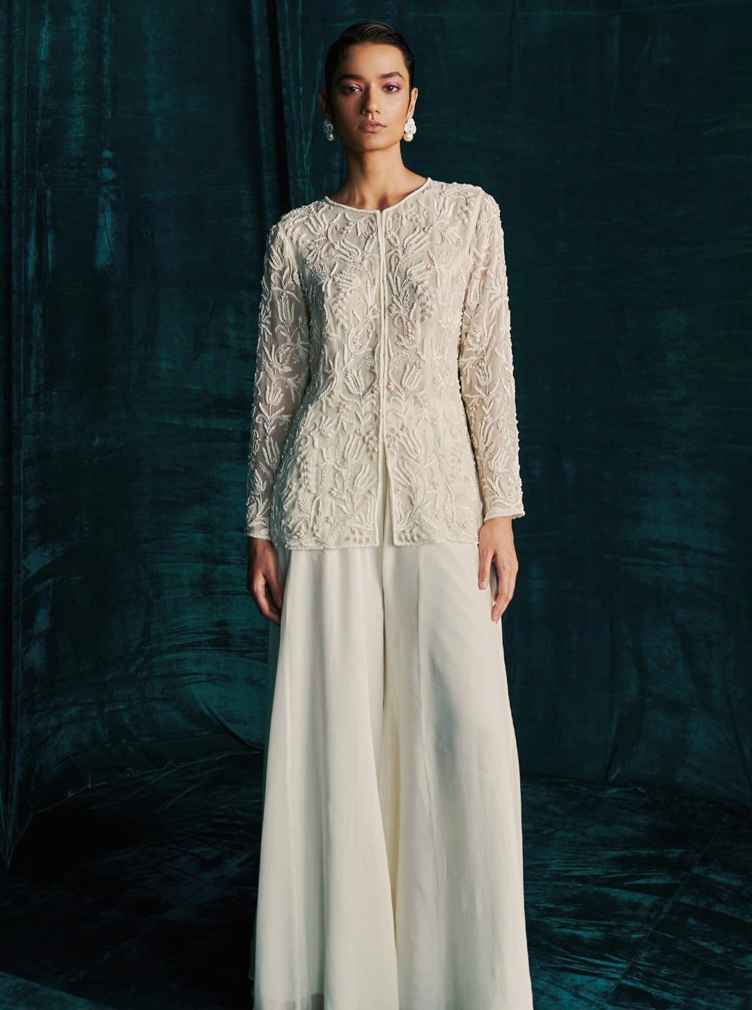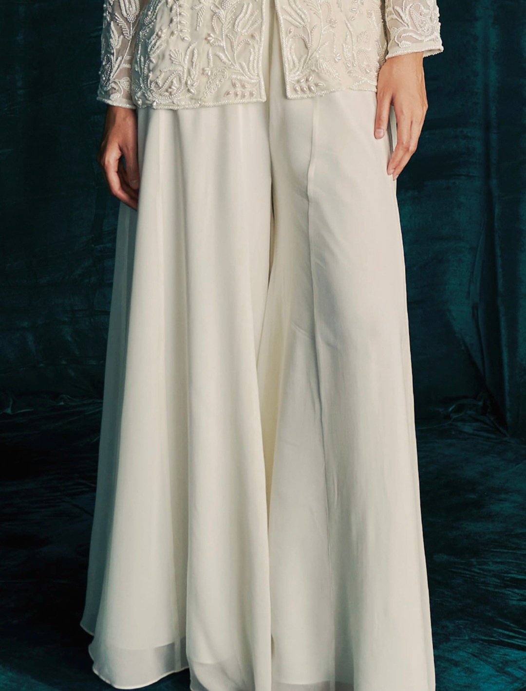 Ivory jacket with cutdana work with Georgette palazzo trousers.