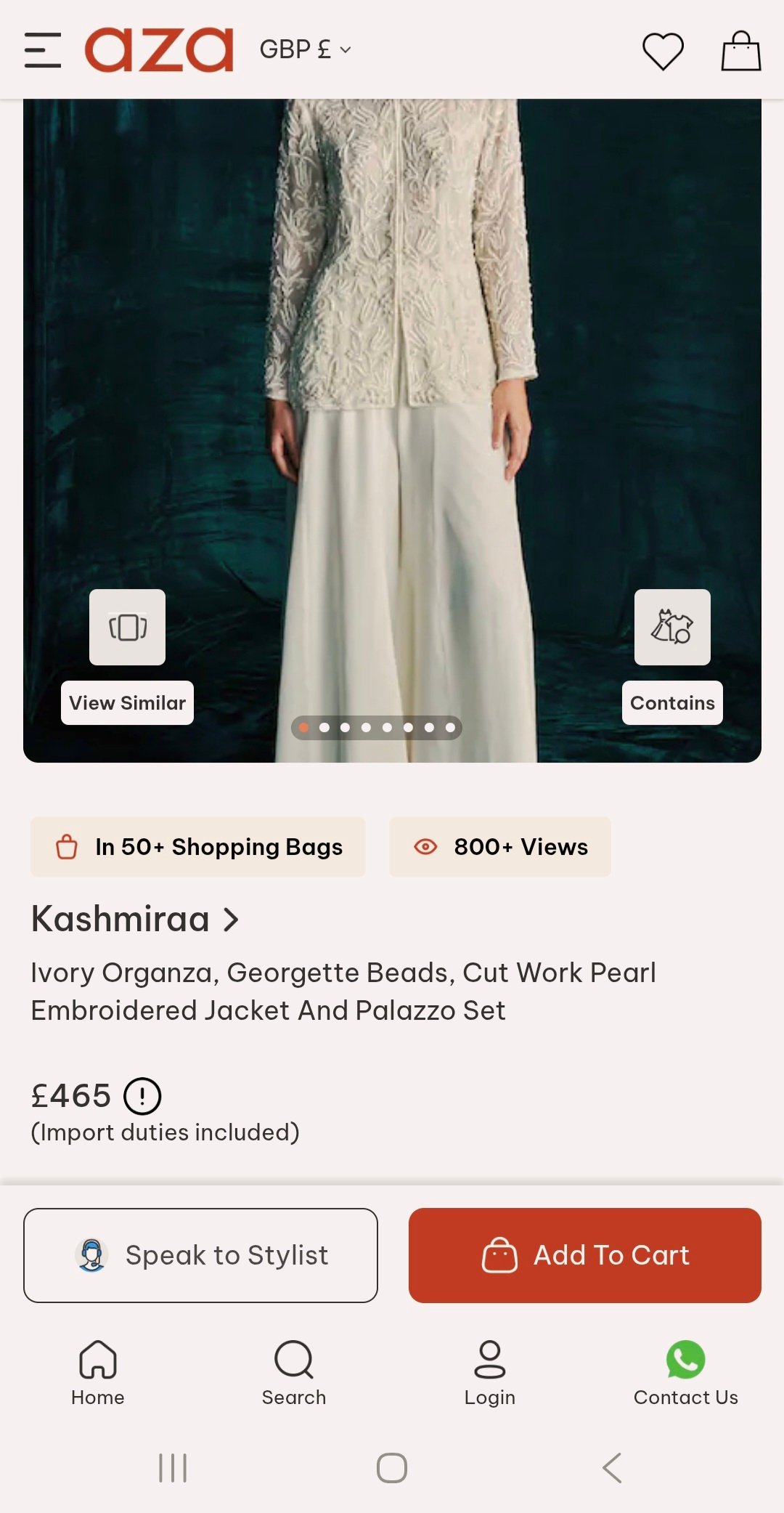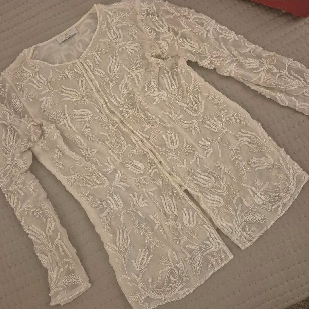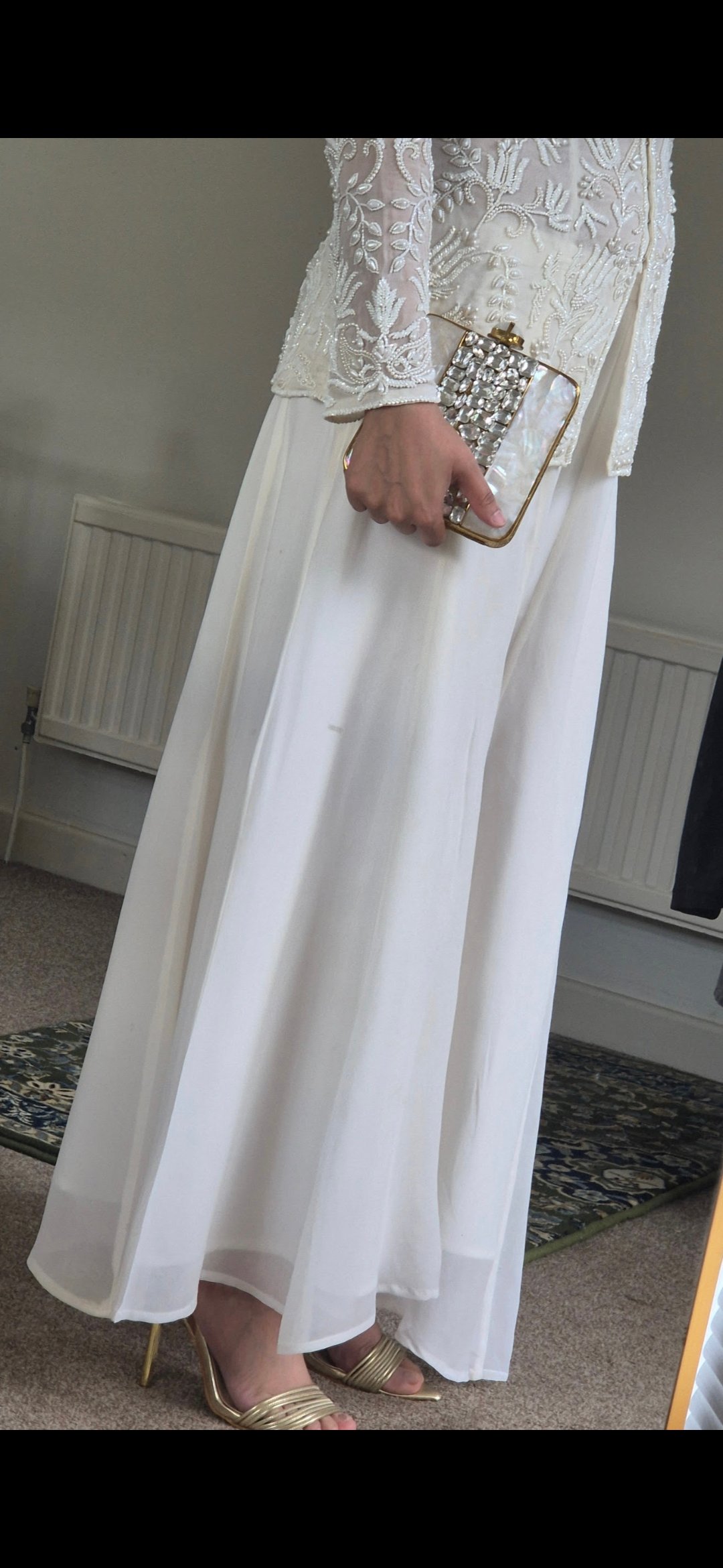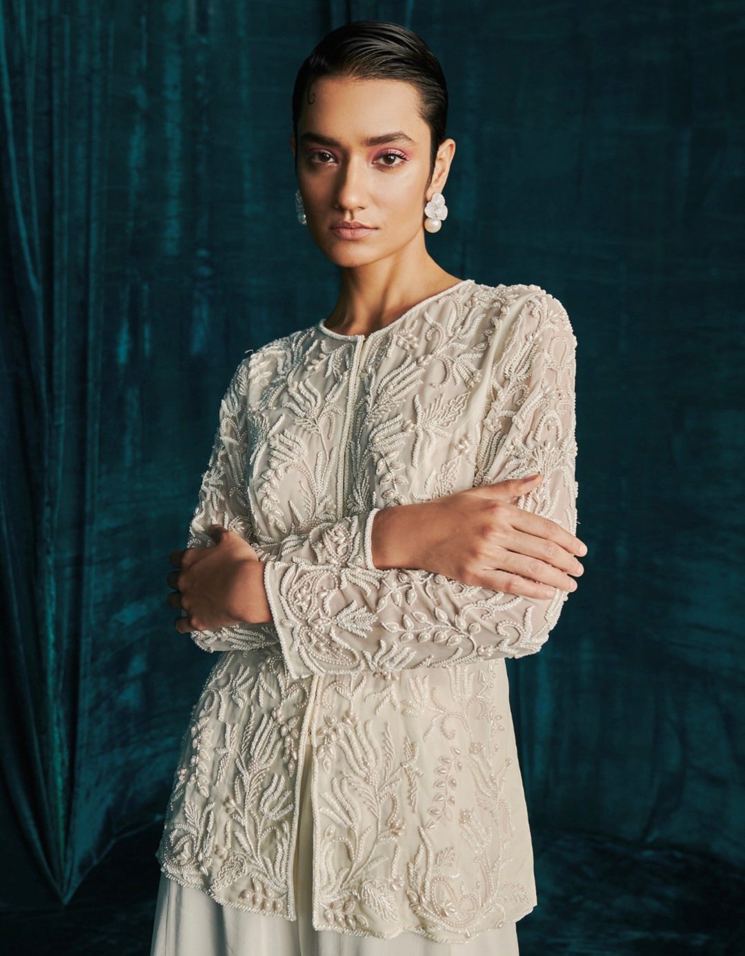 Ivory jacket with cutdana work with Georgette palazzo trousers.