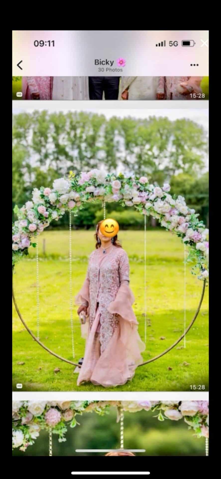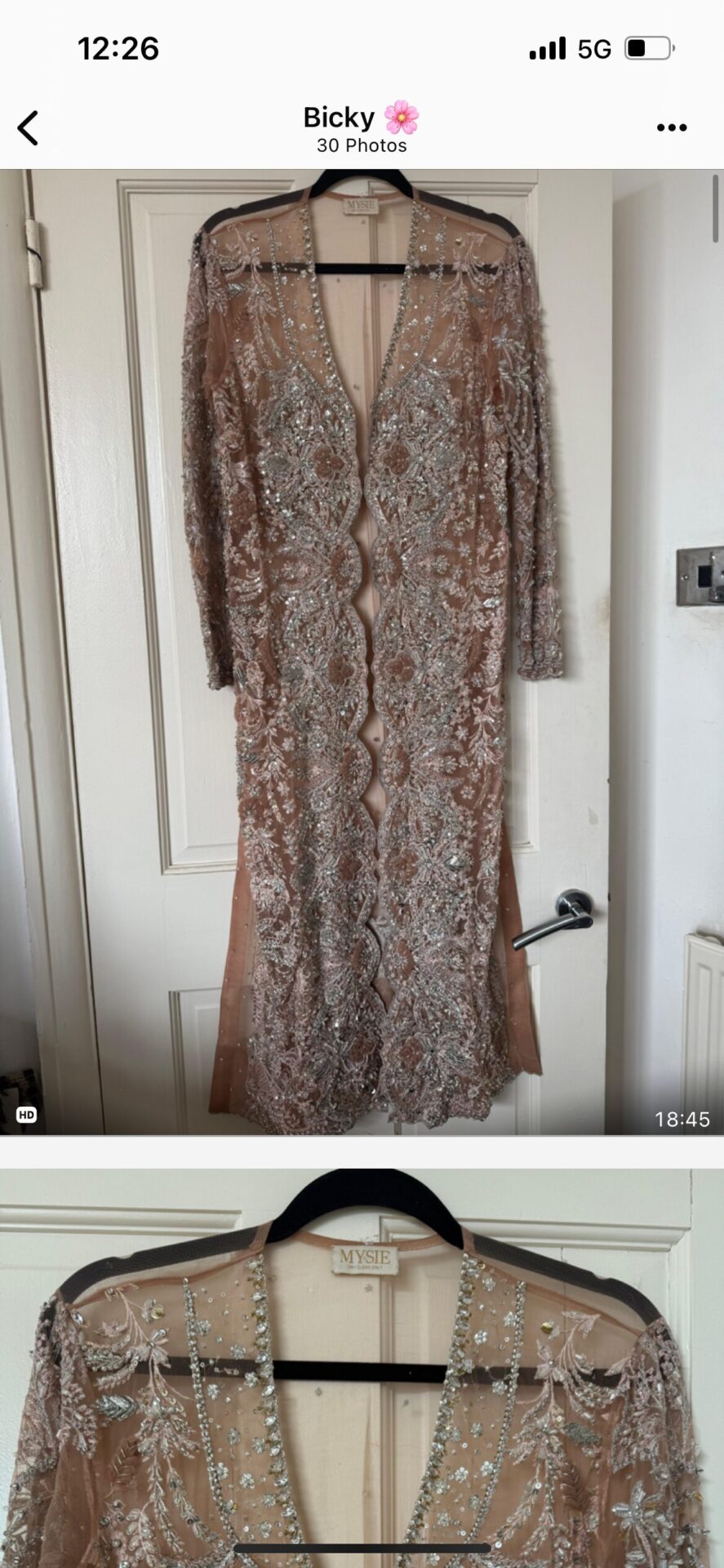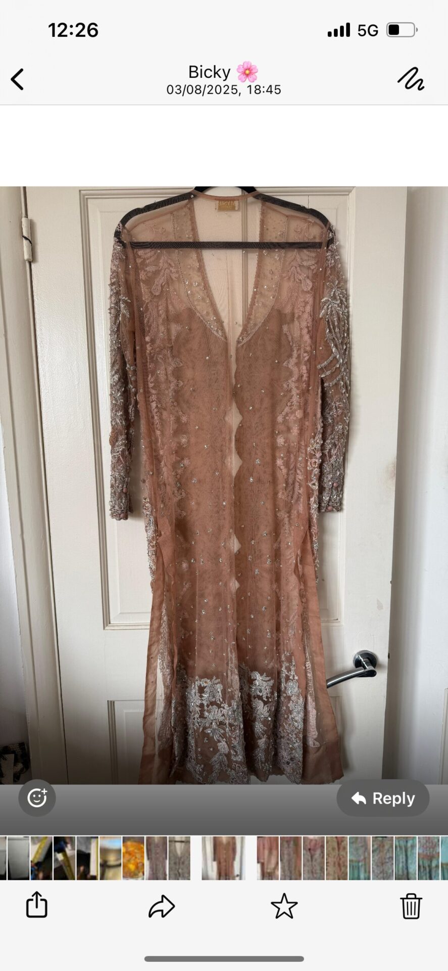 Pakistani designer MYSIE nude coloured fully embellished gown with two piece lengha gown is net embellished on front and heavy border and crystals on back too fully lined arms with full embellishment ruffle dupatta silk two piece lengha beautiful elegant ruffle dupatta giving a real stylish look.price open to offers