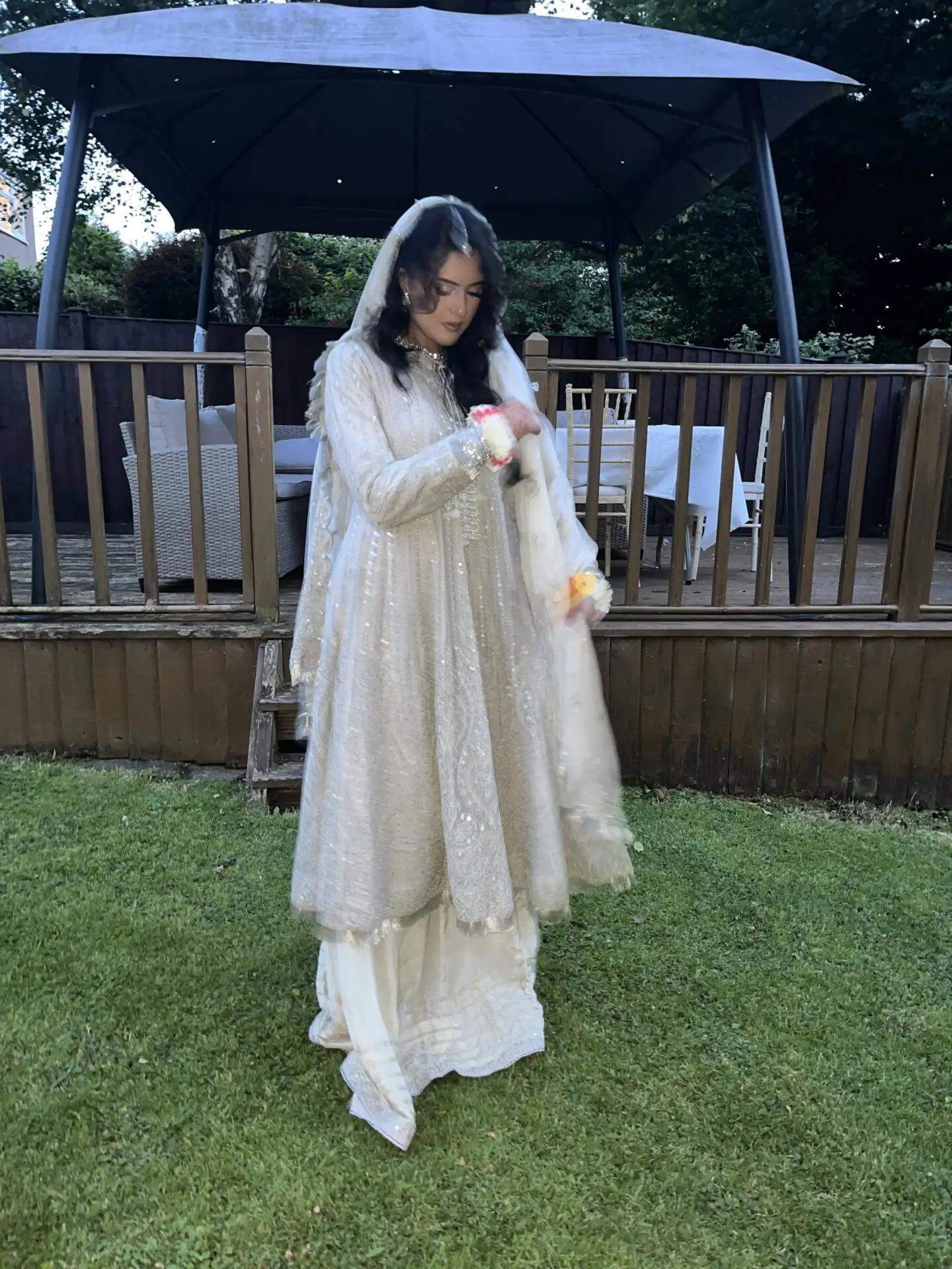 Nikkah 3 piece dress including top underneath, the long dress, a skirt as well as a beautifully detailed scarf. White and silver colour. In great condition. Used for my own Nikkah and the pictures came out amazing. I’m happy to negotiate prices. Originally bought for £160.
