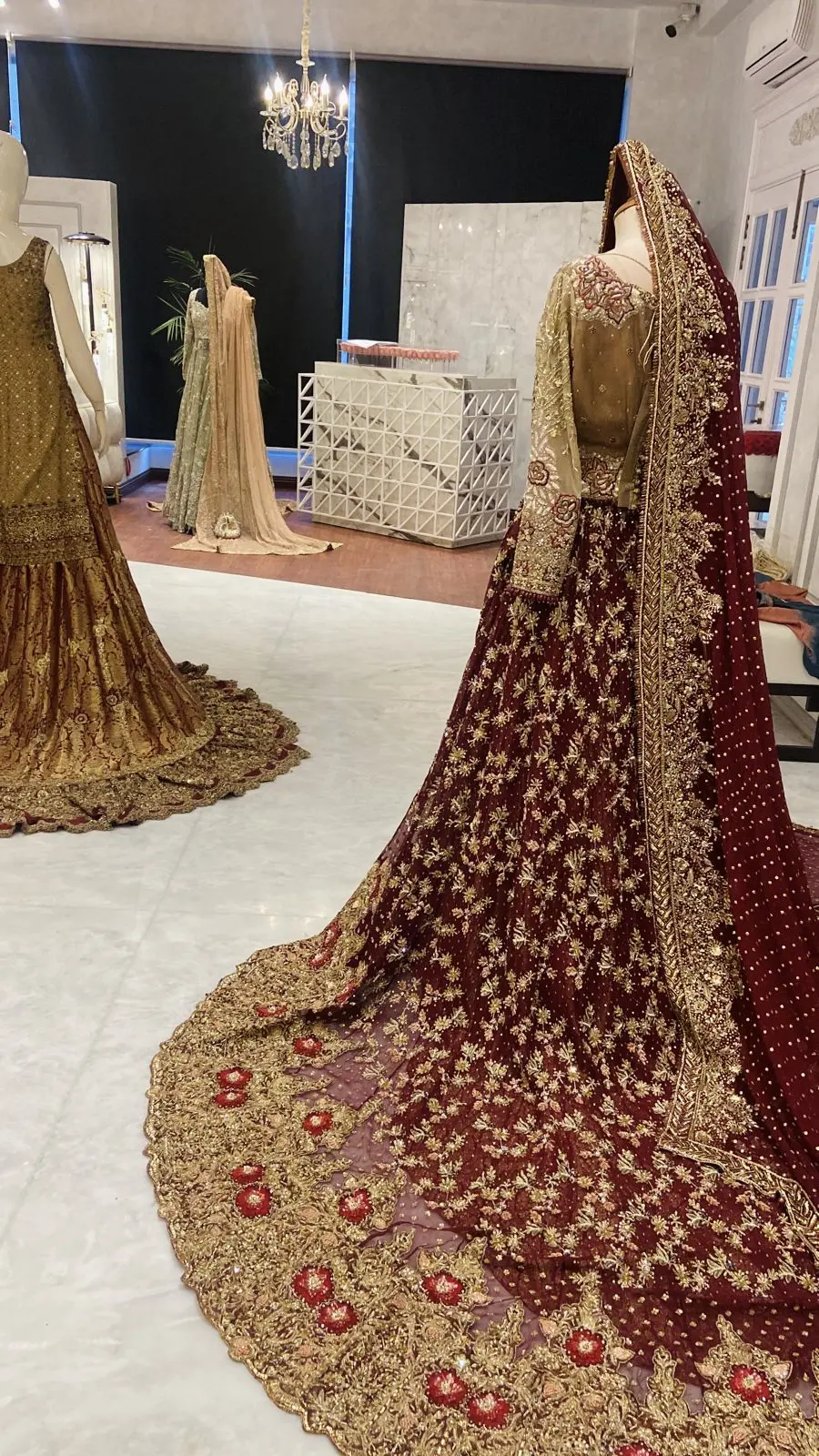 Luxurious lengha of gold and crimson, a beautiful trail and intricate embellishments.