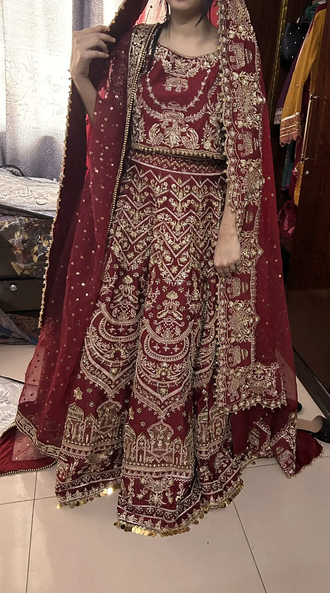 Its a medium sized lehenga. Very good in condition. So much flare. It has two dupatta. One with heavy border for head and other with light border for side. It gives you a Royal looK. i recently got married and its very new. If you're interested , do let me know. Prices are negotiable. I have beautiful matching jewelry and bridal heels also. I can offer you a package. So feel free to contact me.
