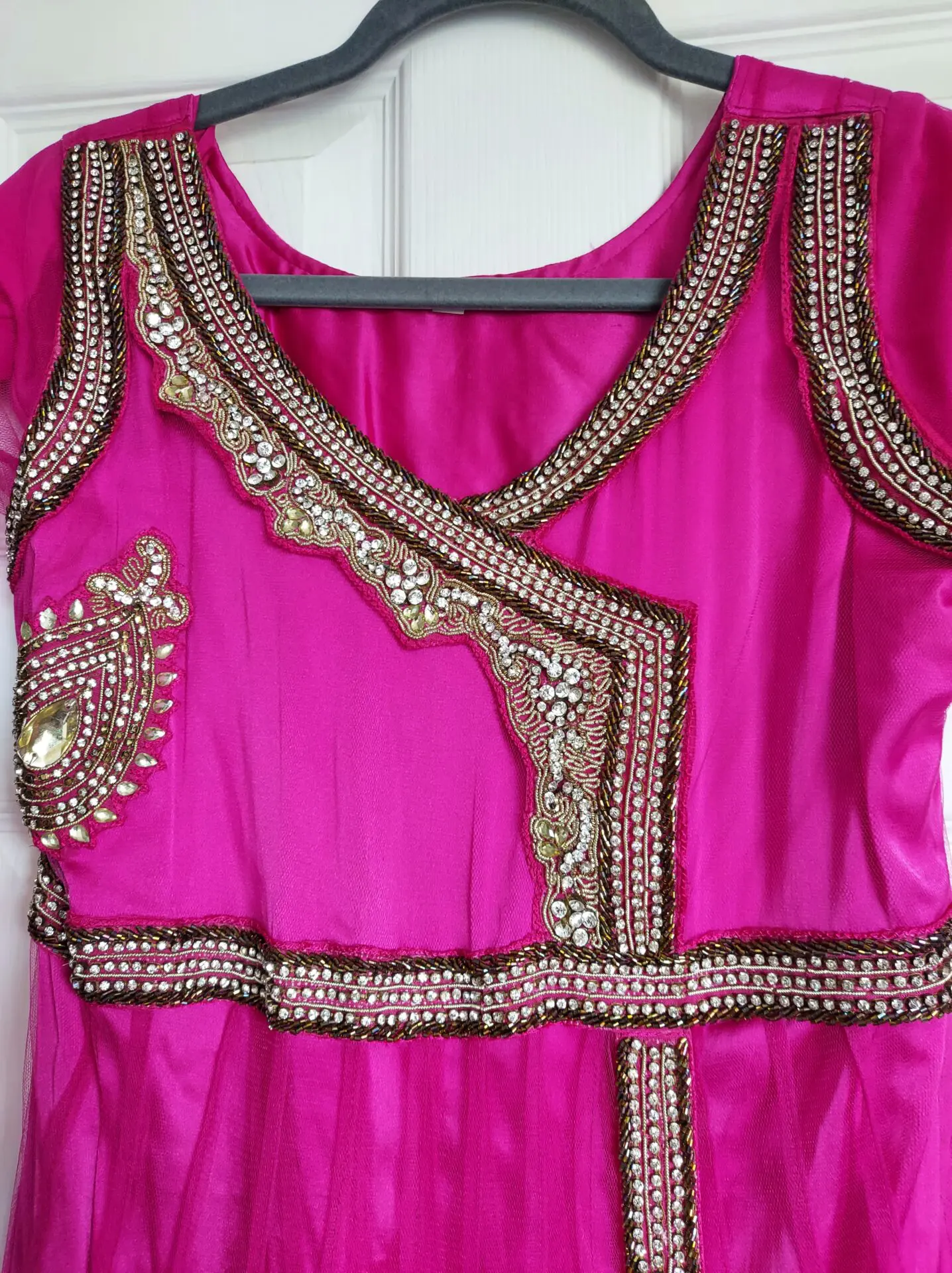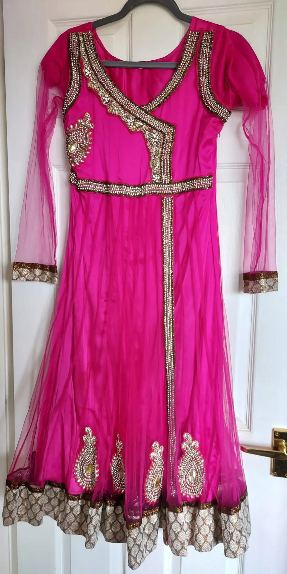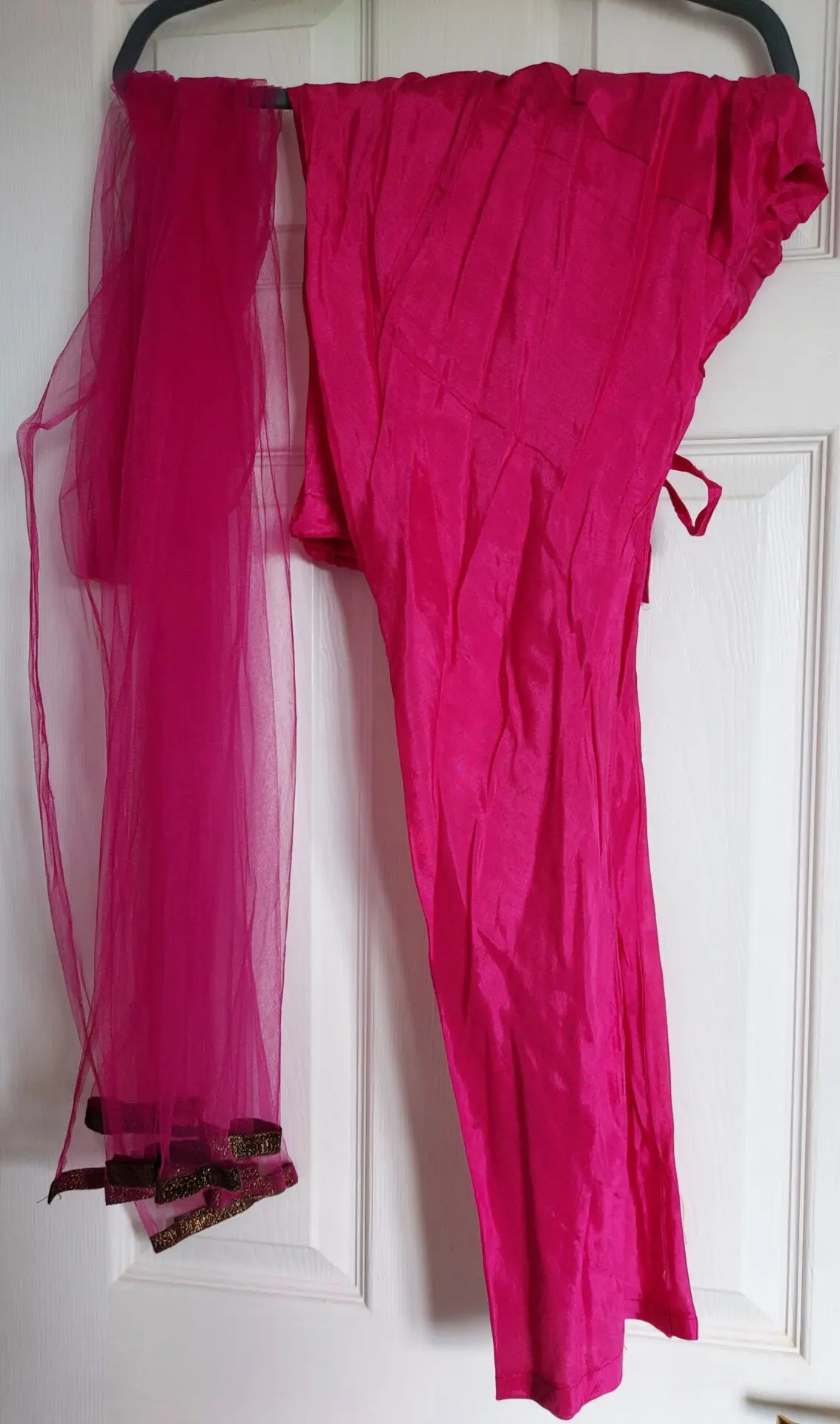 Beautiful pink 3 piece dress outfit, front of the shirt has light work, worn twice & overall good condition but sleeves are slight damged but can taken off or altered easily. Will fit a size small/medium, it is stunning, traditional attire. Come with simple net scarf and churidar trouser.