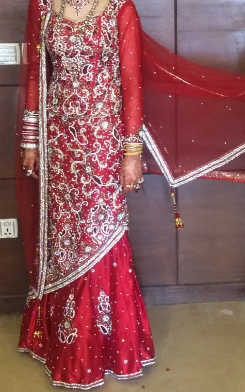 Red bridal lehenga. English style with beautiful gold work on pure silk. Fits size UK 8. Can be adjusted.