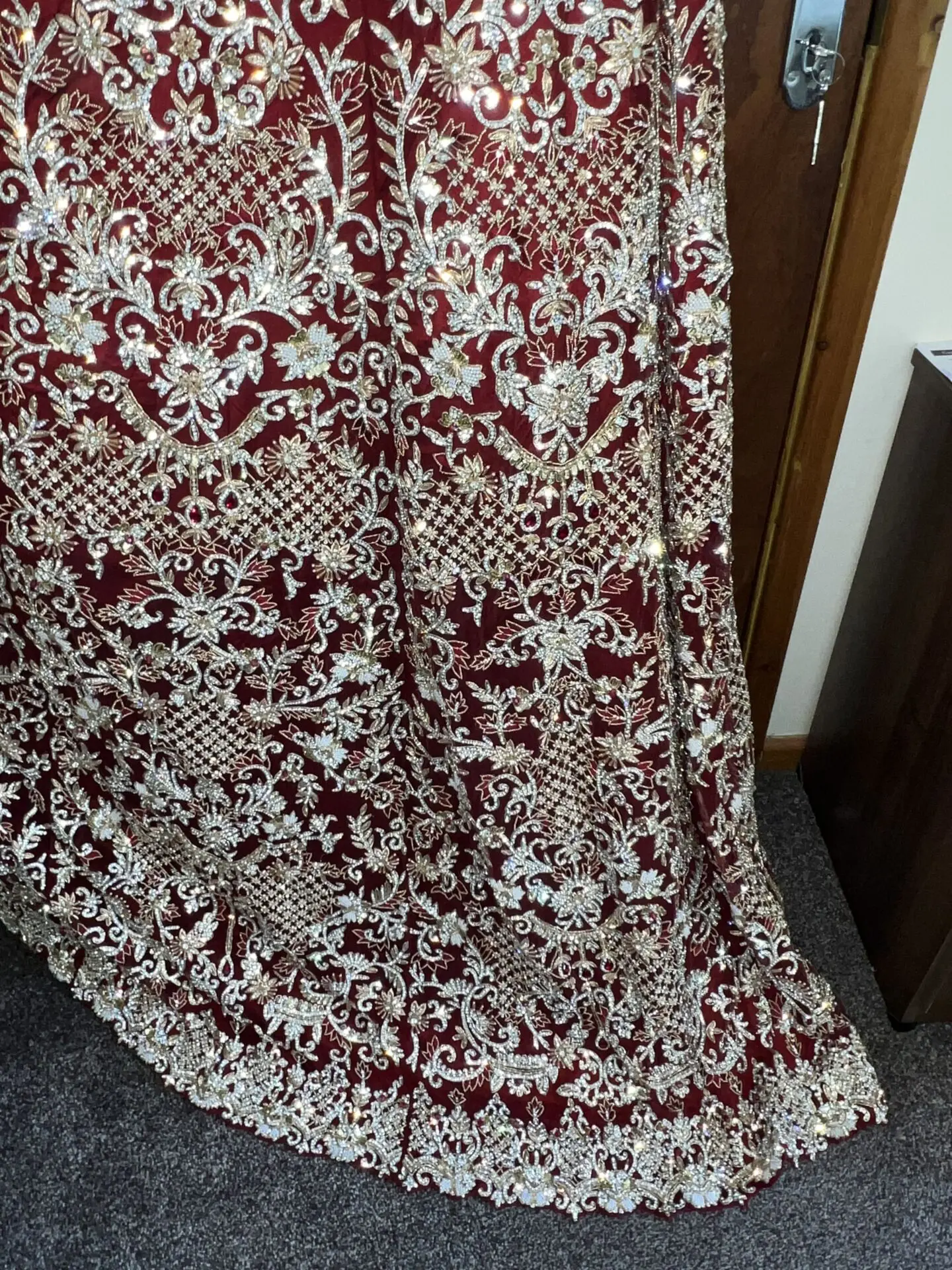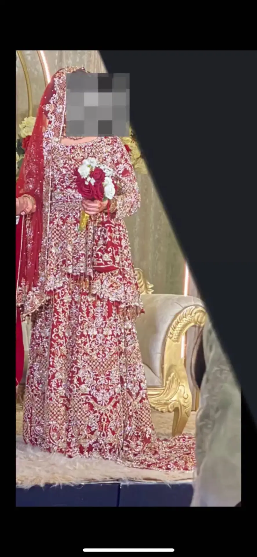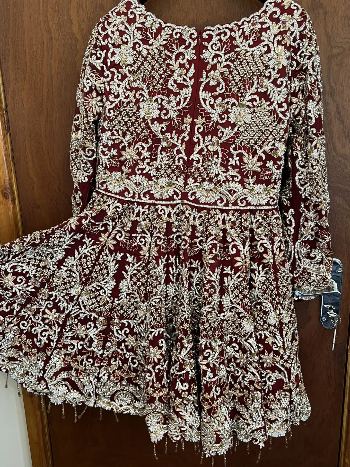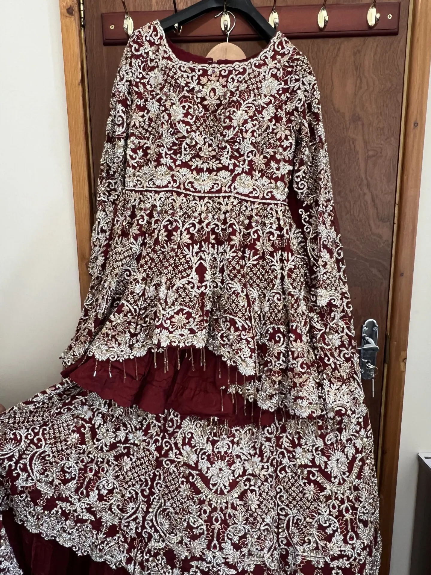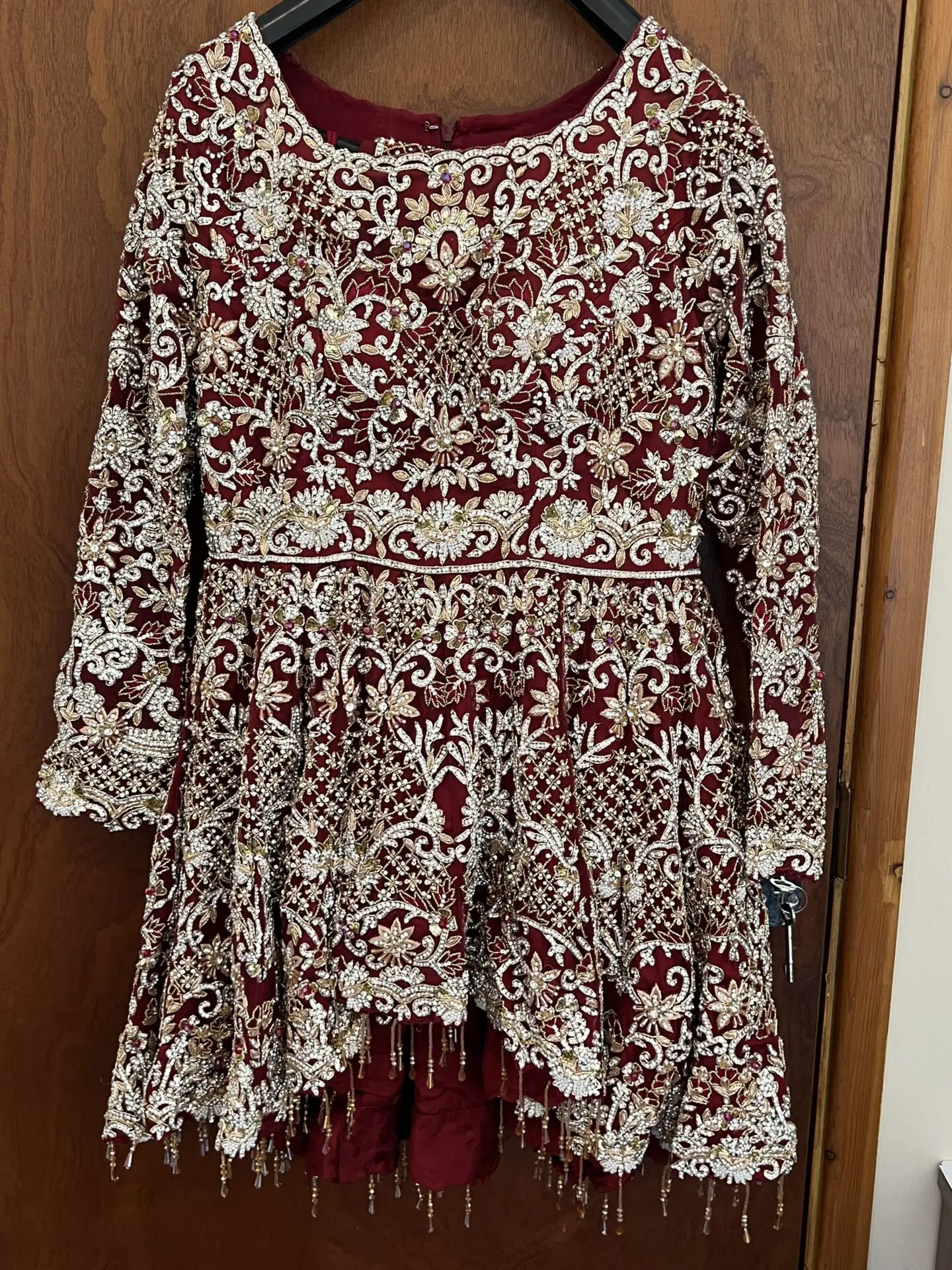 Dark red with silver and golden stone work on the 3 piece comes with the dress, skirt and dupatta. Stunning embroidery throughout the dress and skirt. Only worn for couple hours. Size medium. Feel free to message me open to offers.