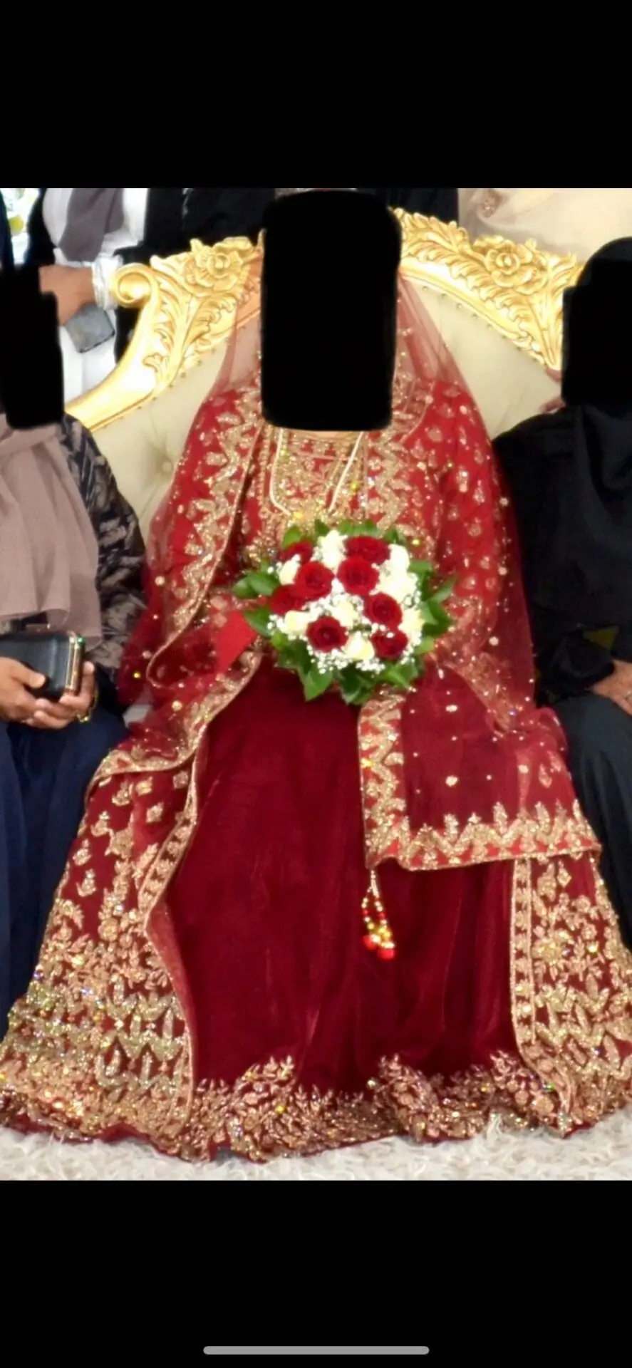 A beautiful & classic 3 piece red lengha full length dress, worn once for one function. Size 10-12, A-line embroidered dress paired with a rich velvet skirt and intricate border. Comes with a sparkly matching dupatta.