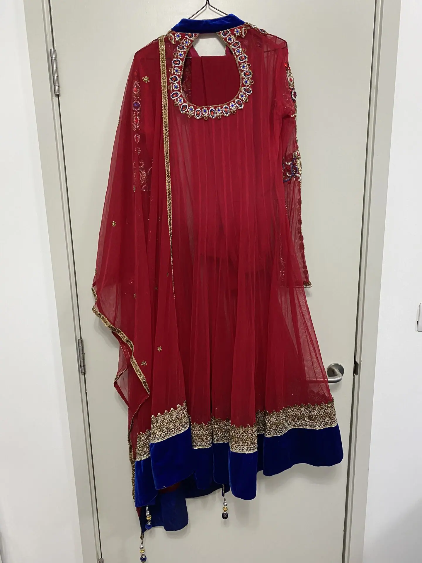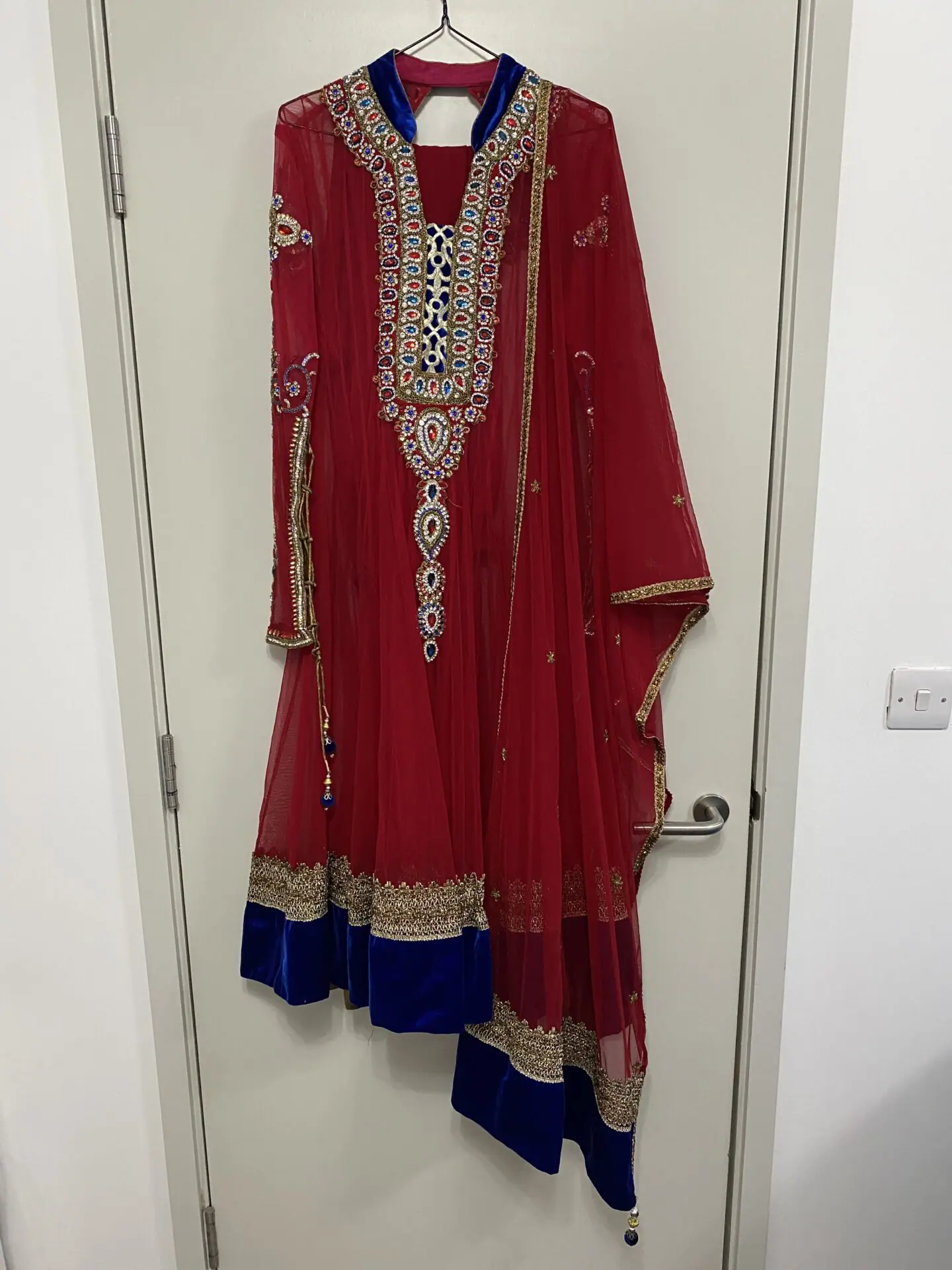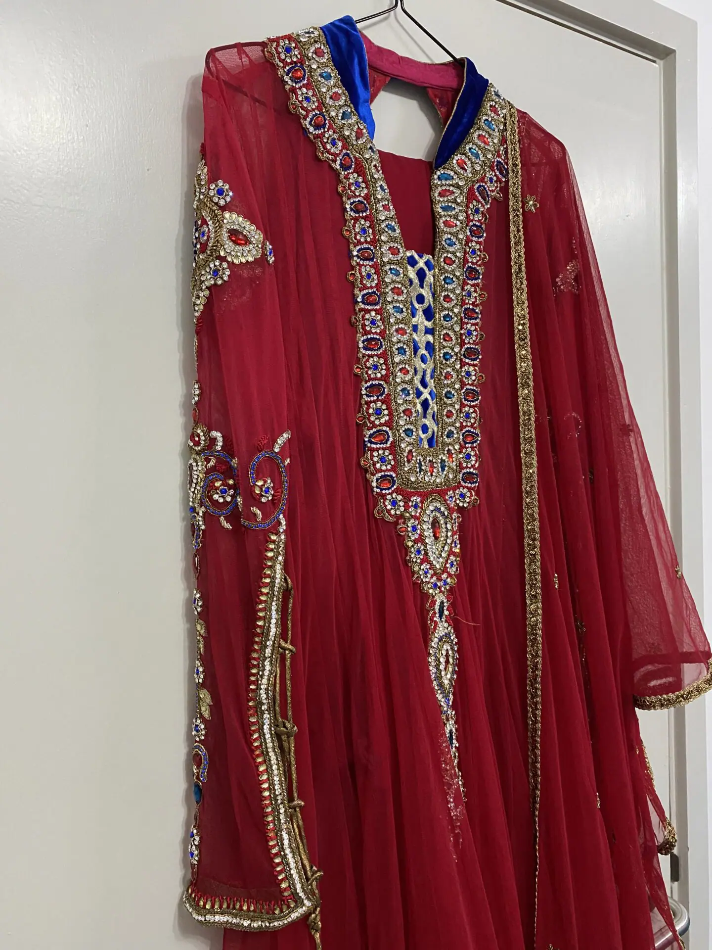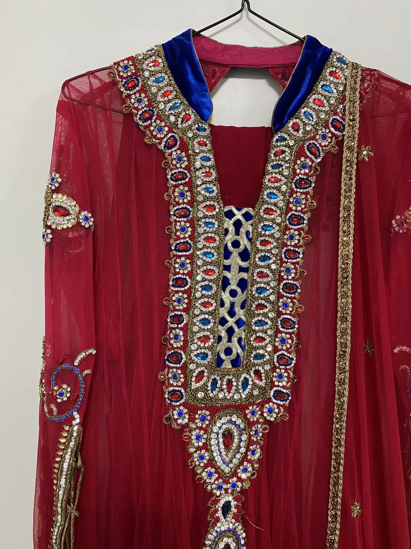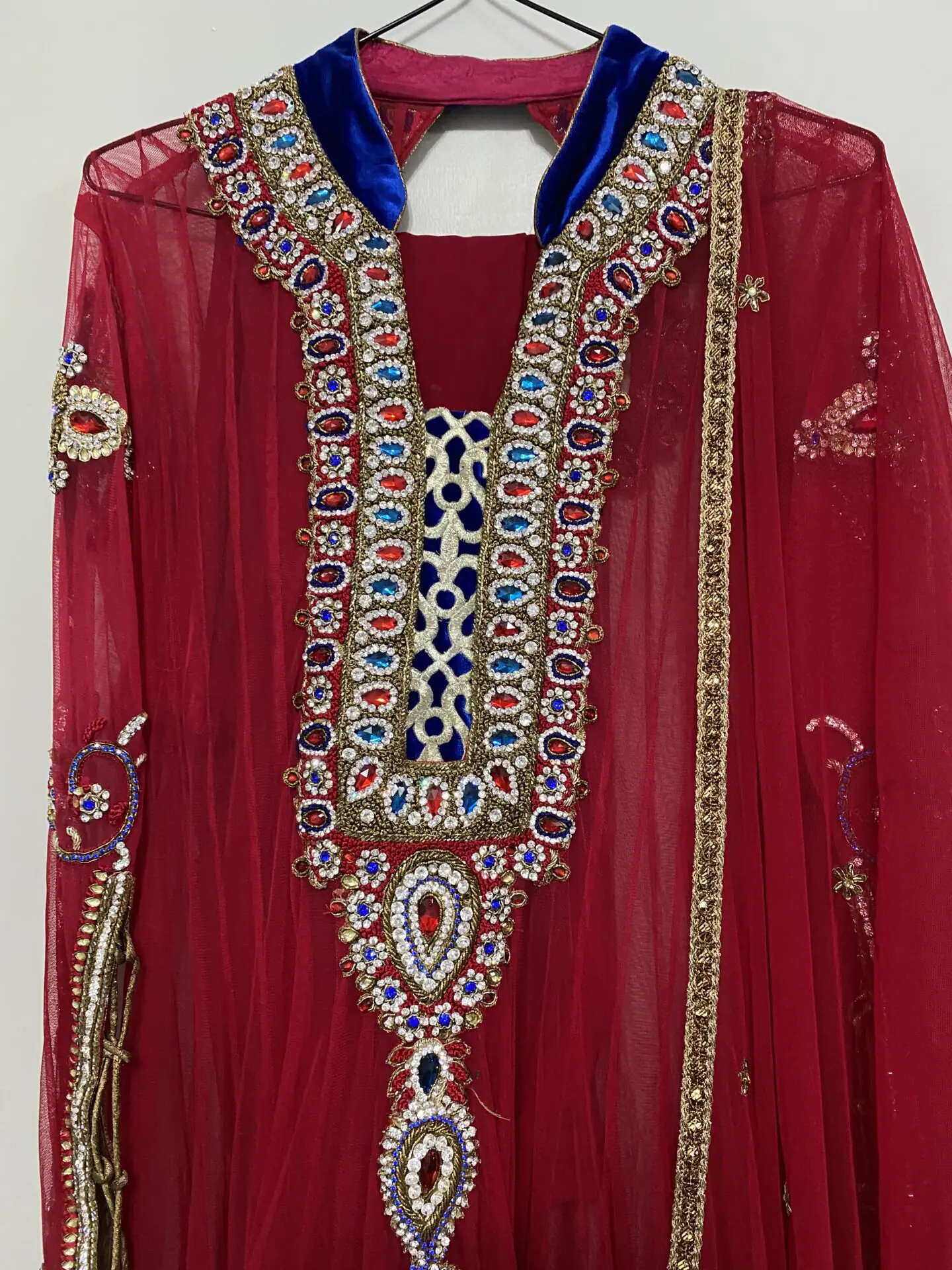 Stunning ruby red and royal blue net anarkali dress with stunning stone work on arms and front and back of dress with net dupatta and churidaar trousers.