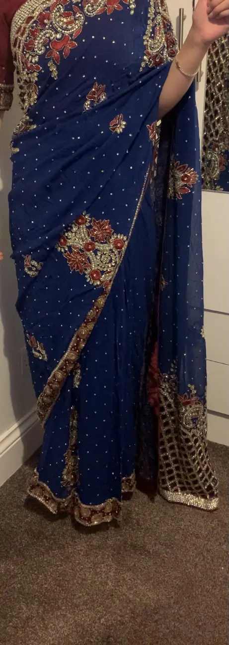 Stunning maroon and royal blue Sari with beautiful heavy silver work around the whole sari.