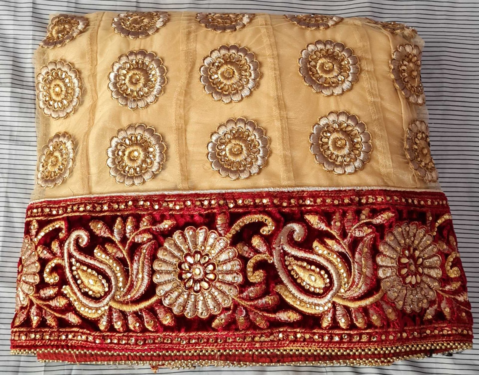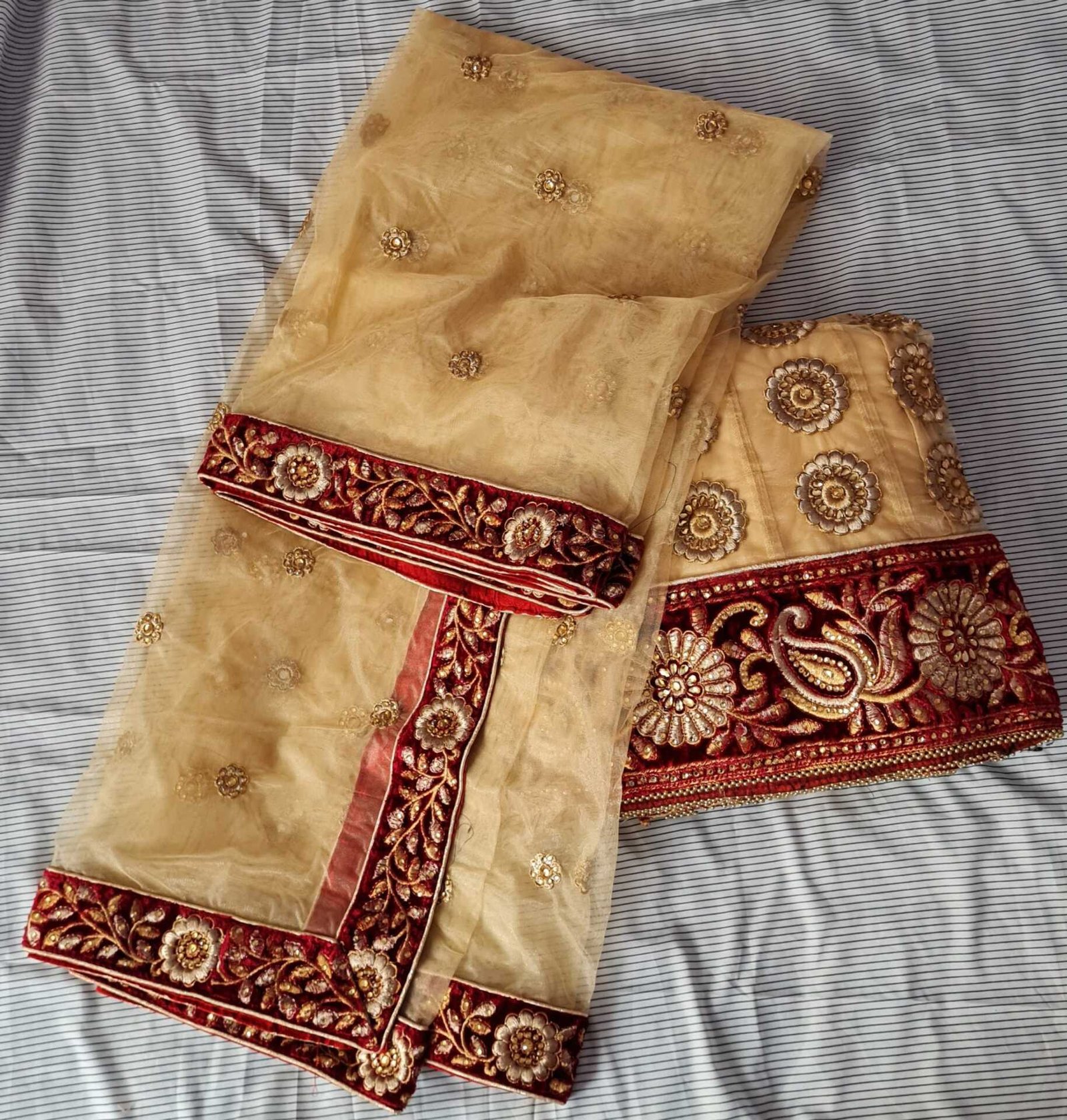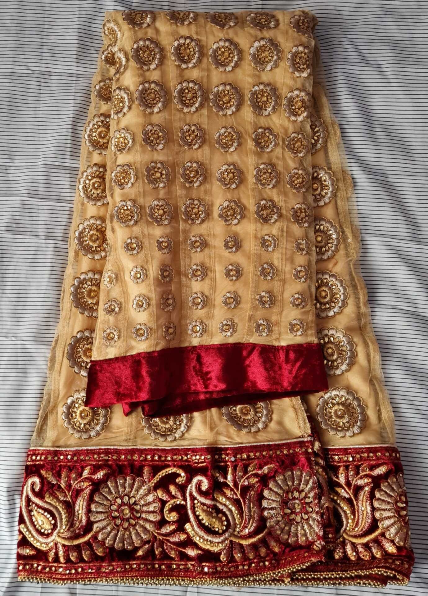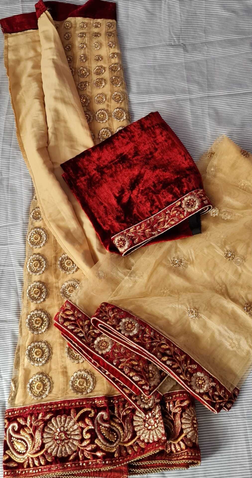 Gold and red lengha. Semi stitched. Fitting sizes 8-12. Brand new