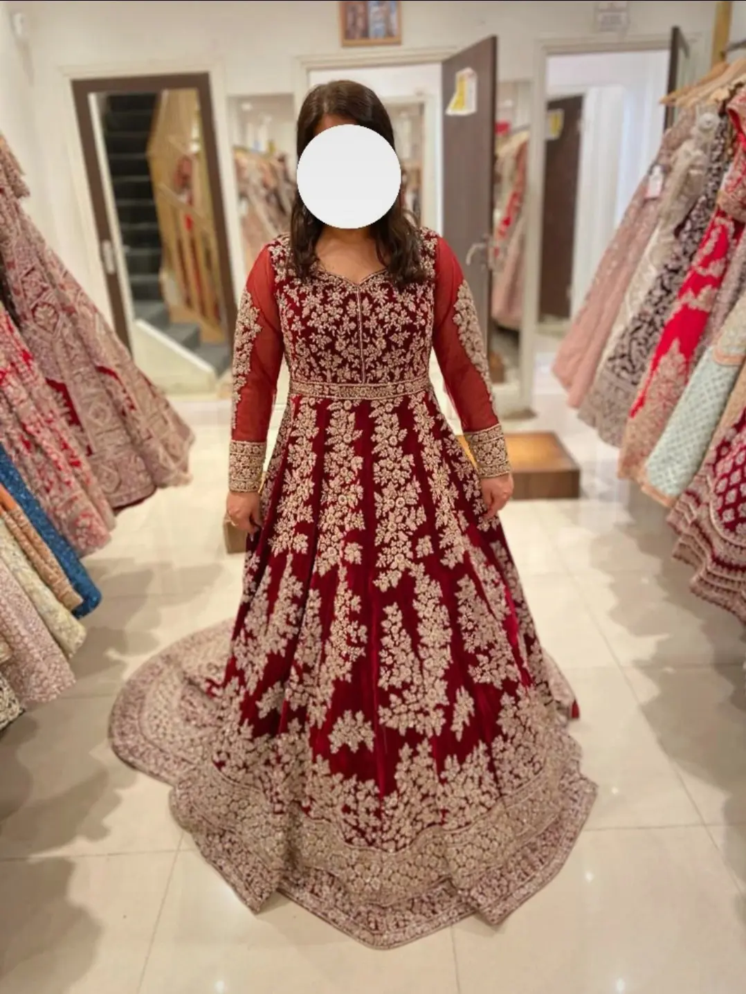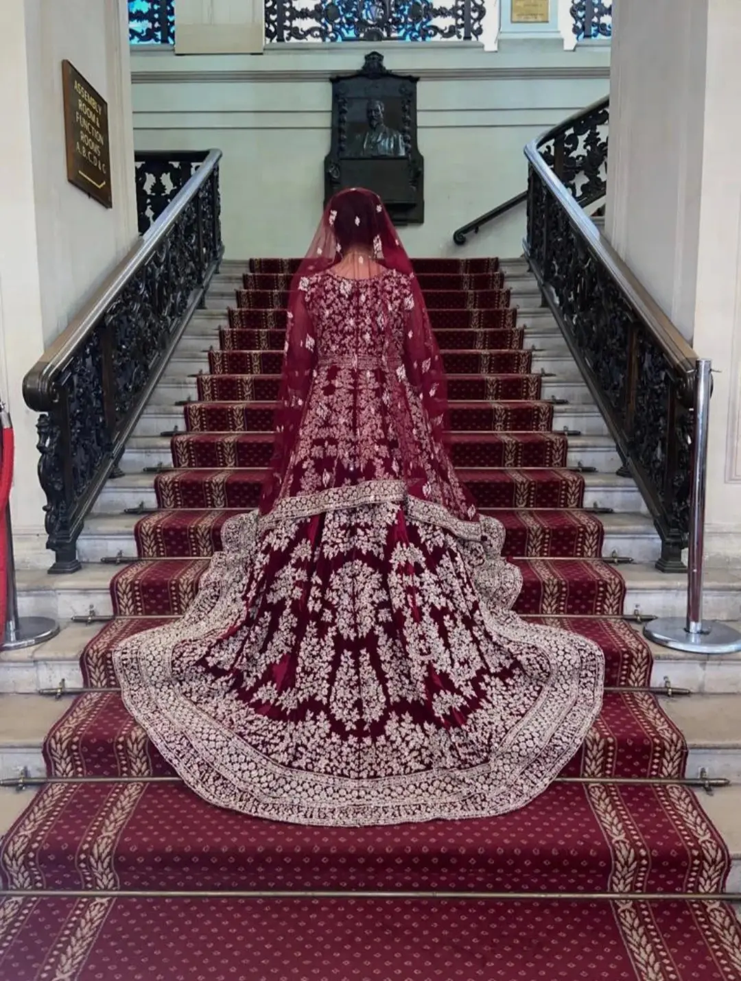Deep red velvet hand stitched traditional wedding dress. Made specifically for me and only worn once on my wedding day.