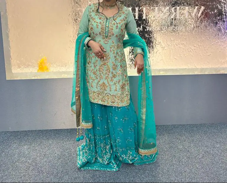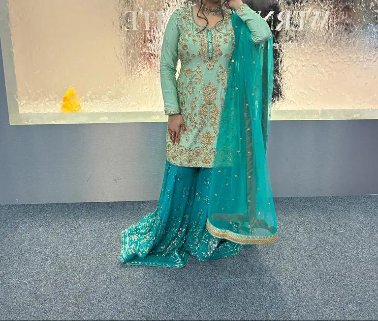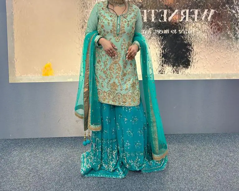 Heavily embellished turquoise plazzo trousers paired with a blue net dupatta surrounded with gold lace.