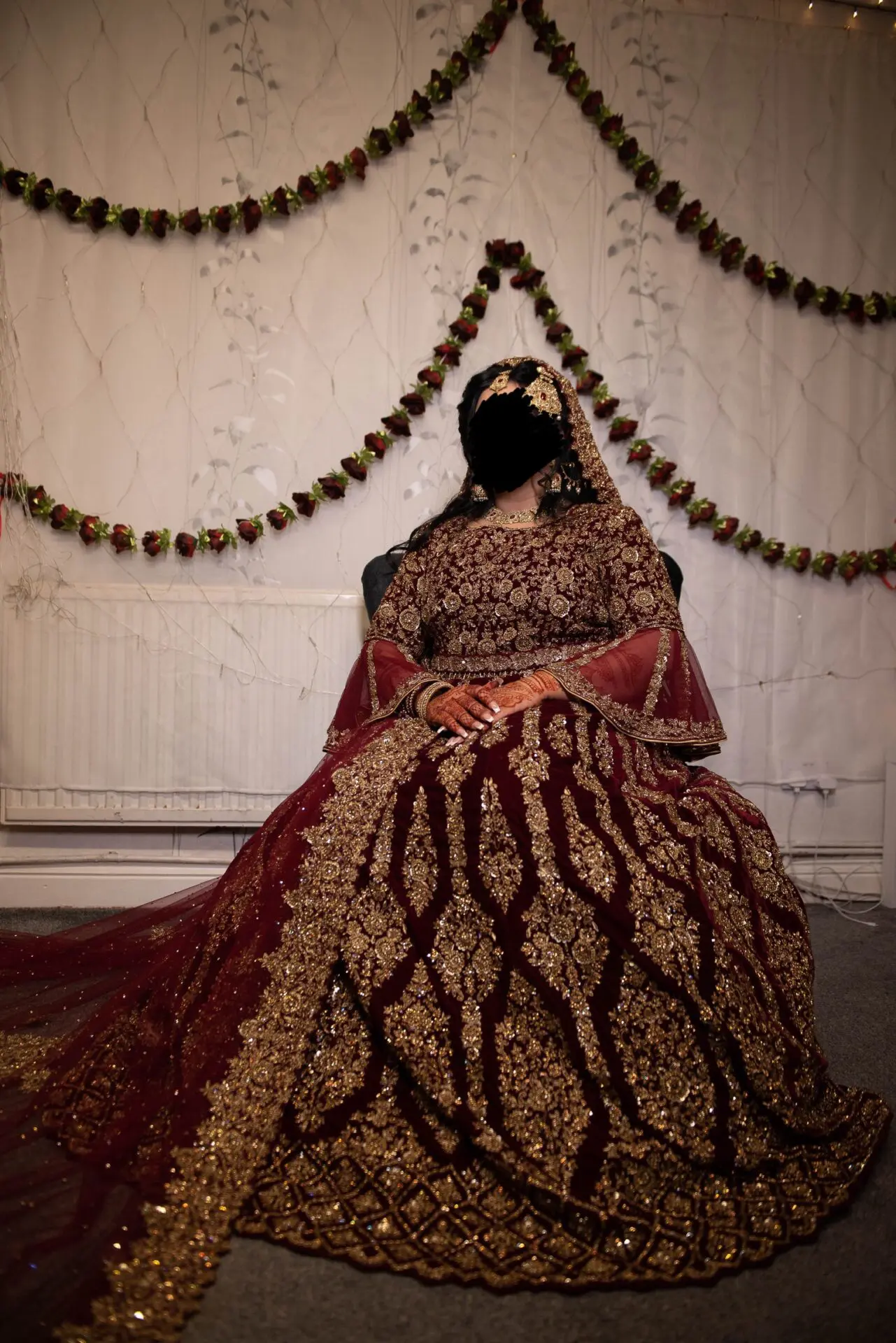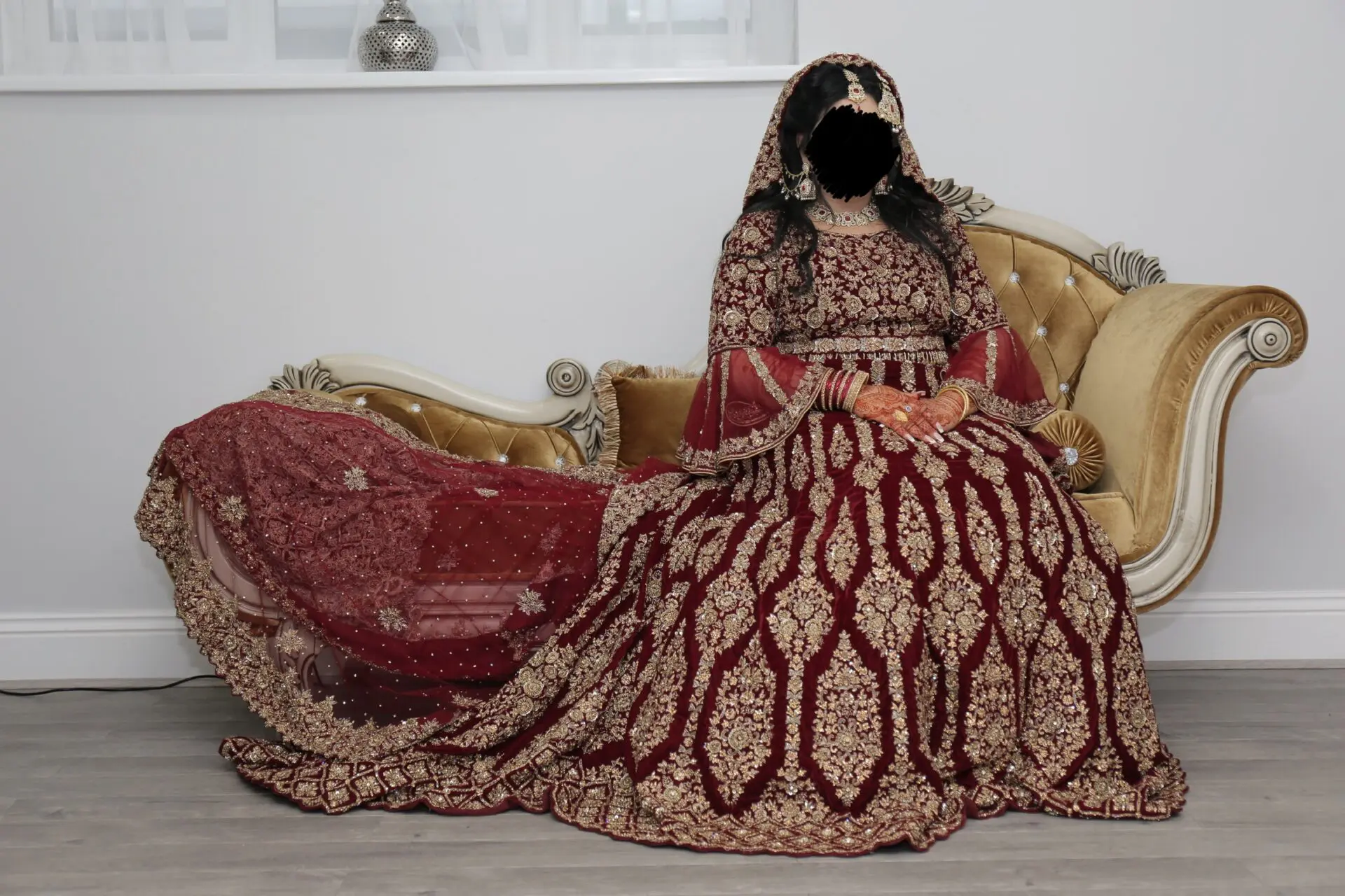 Price negotiable with or without scarf. The scarf is very heavy with a beautiful trail. I dont have any clear pictures without faces but I do from the store when tried on. The colour is maroon and rusty gold. The dress is made of luxurious velvet. It was comfortable to wear.