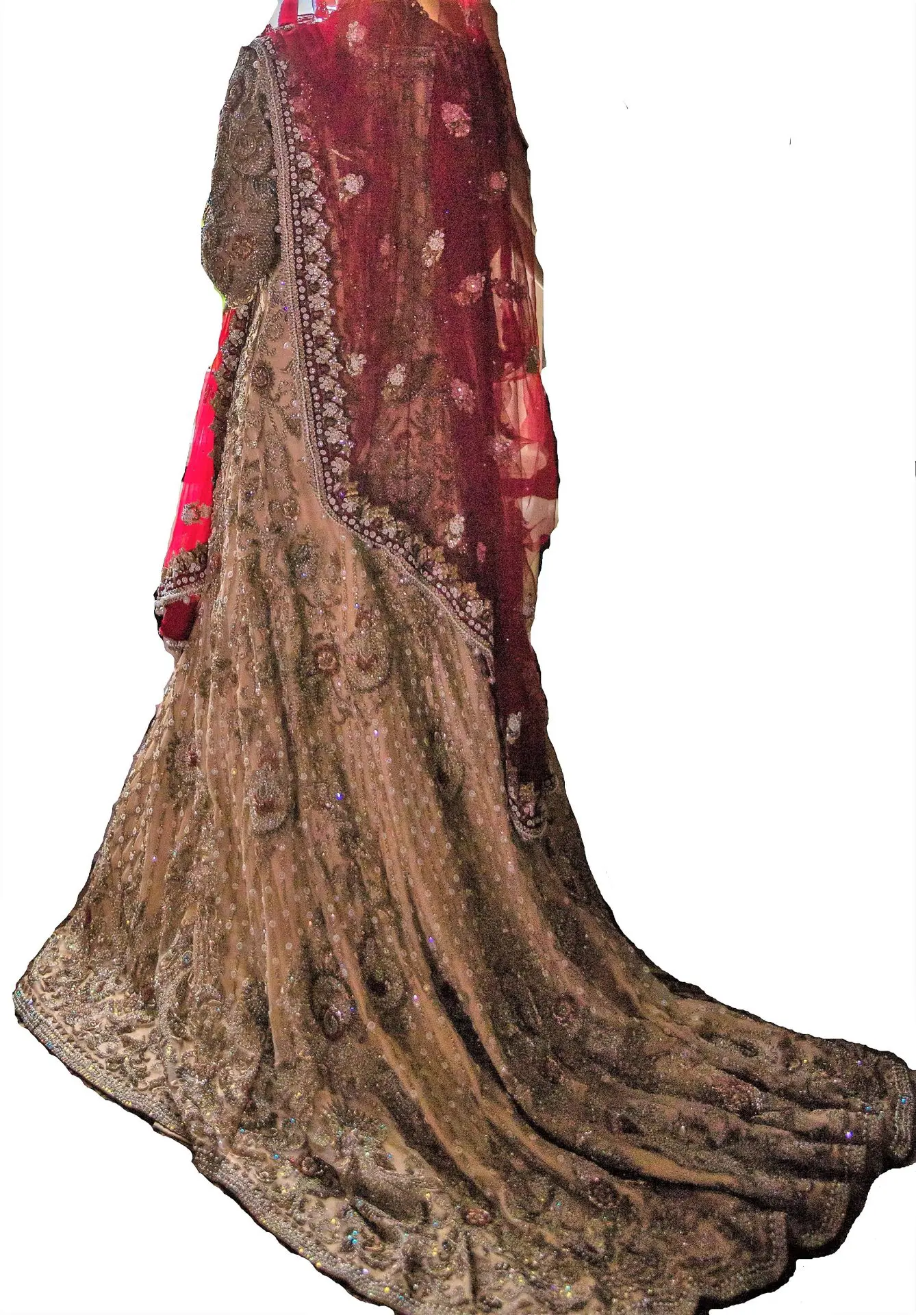 Bespoke Bridal design, inspired by Pakistani Designer Faraz Manan. Stunning hand made, intricate and embellished embroidery featuring Pearl and gold thread. A matching bridal pouch included. Full lengha with underskirt attached with beautiful embellishment. Dupatta has exquisite with hand made embroidery and hanging pearls. Only worn once for 4 hours and is in immaculate condition.